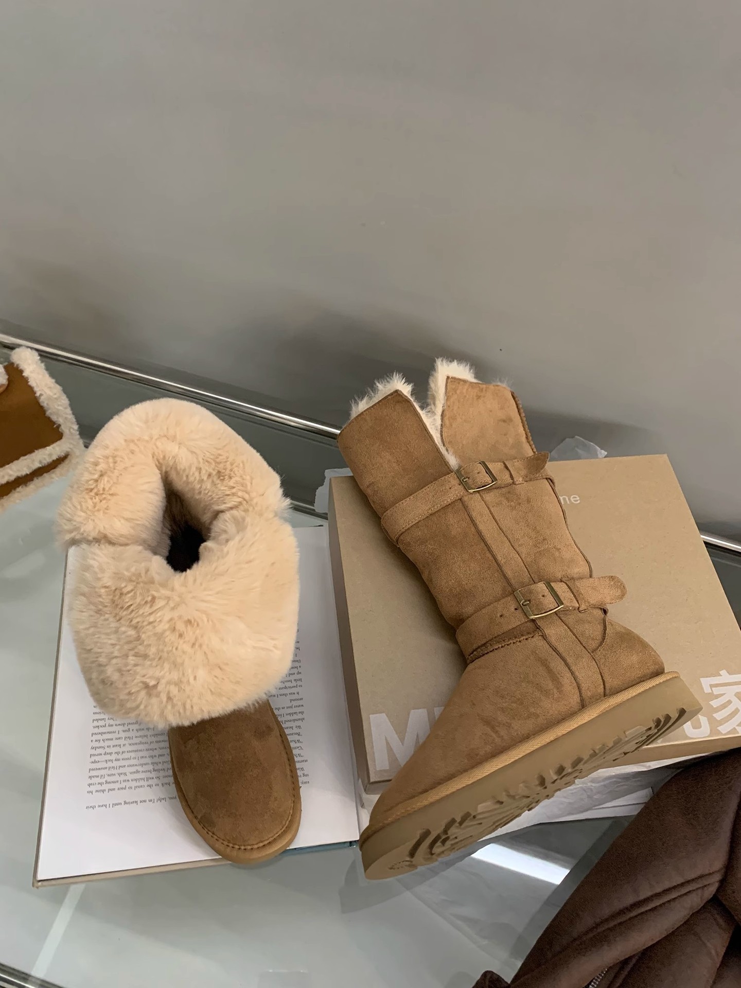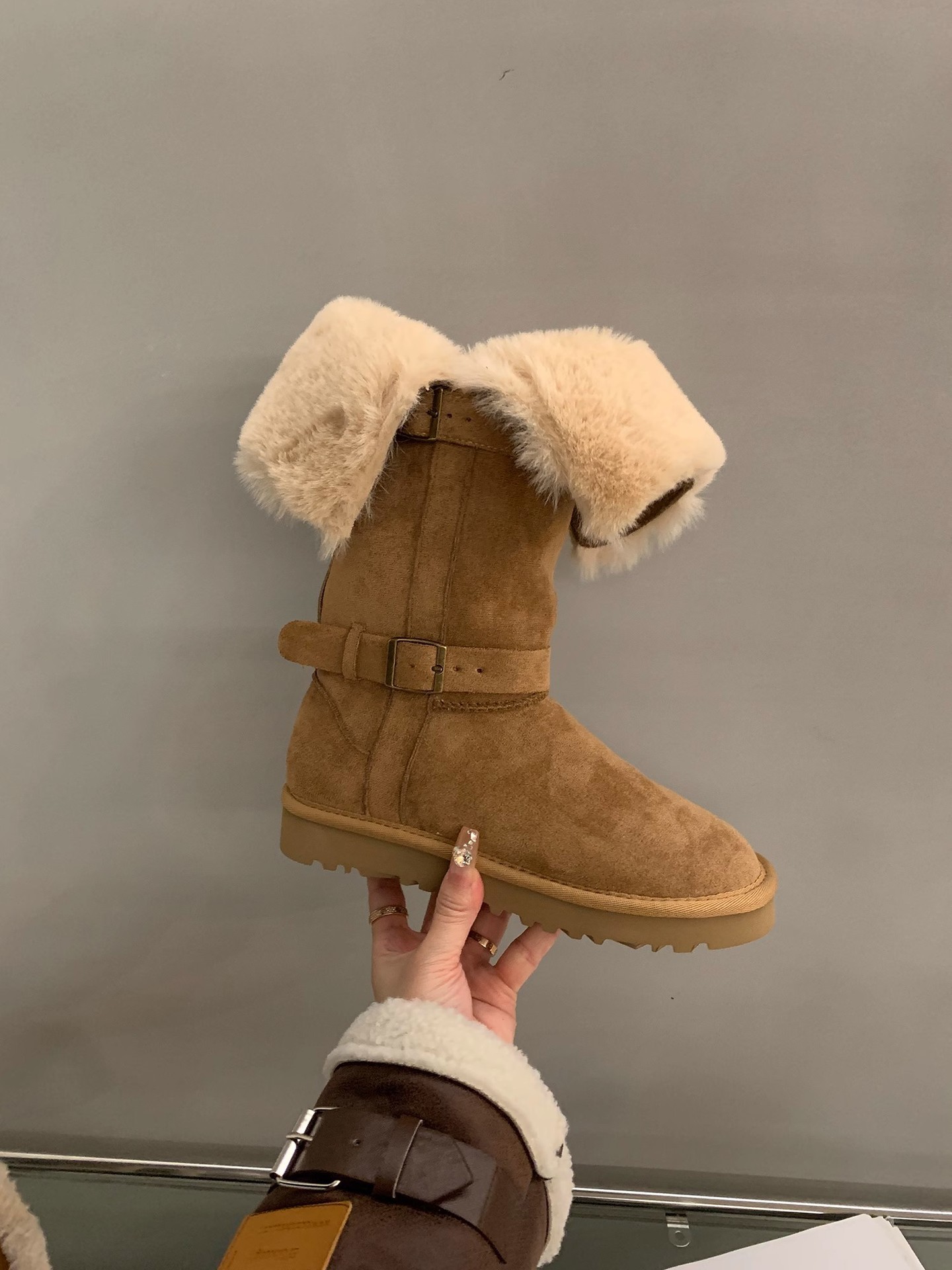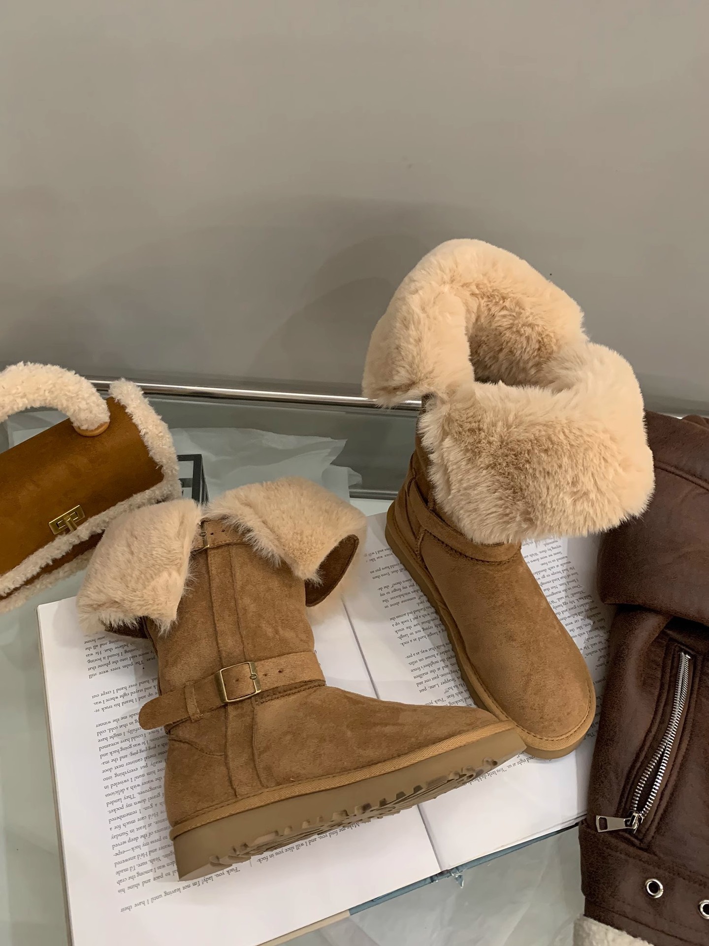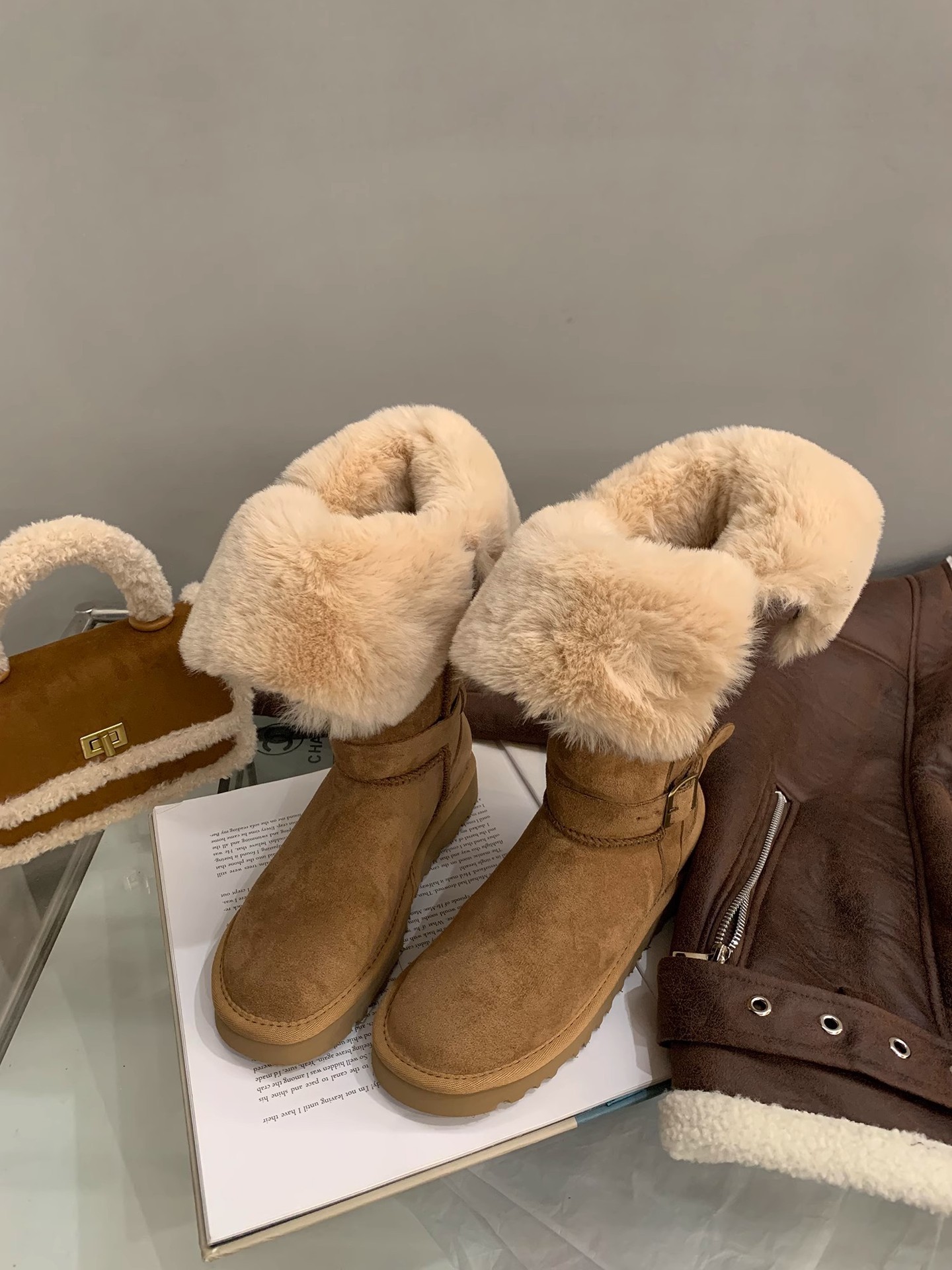 소가죽 양가죽 모피 일체형 스노우 부츠 여성 빈티지한 라운드헤드 플랫 기모 기모 도톰한 미들면 슈즈지만 무릎 부츠는 아닙니다