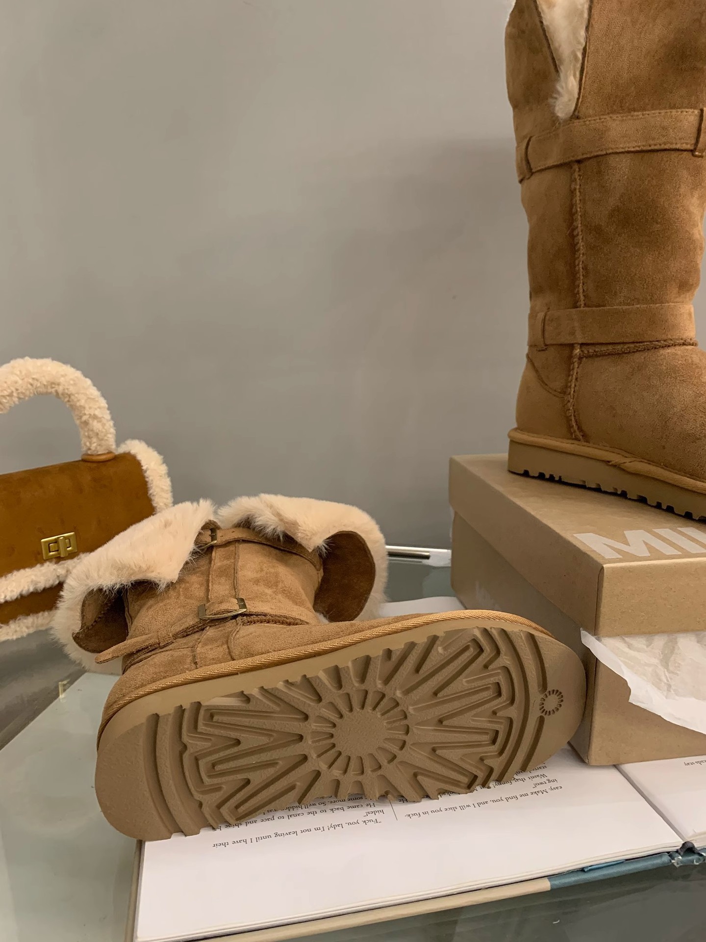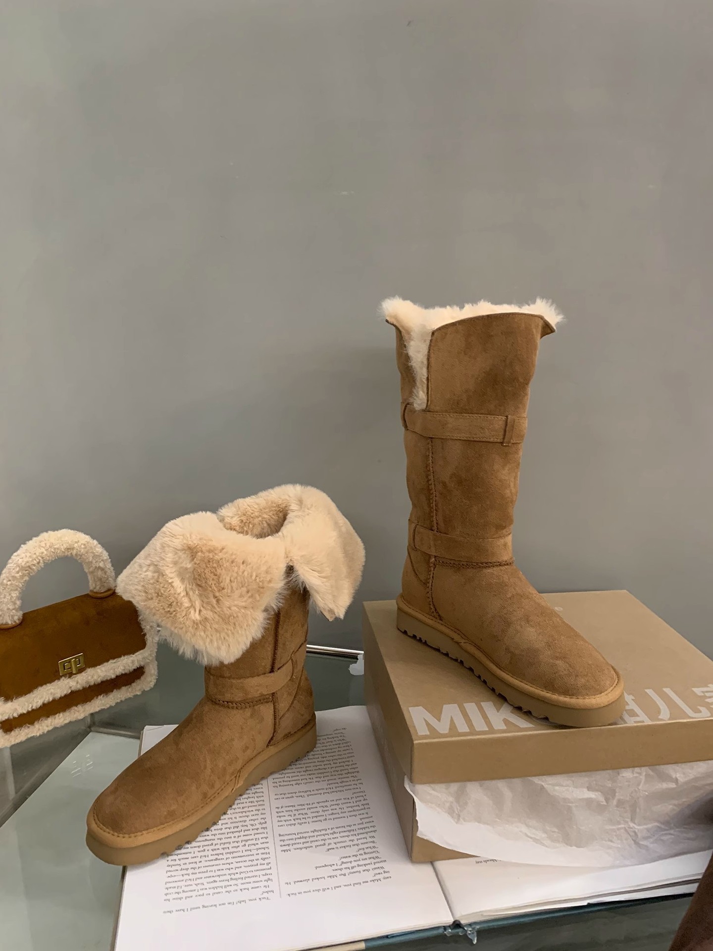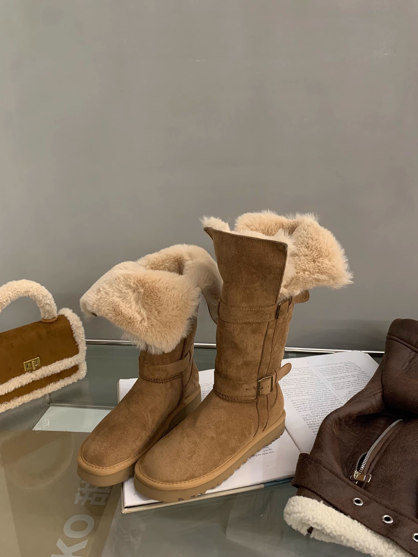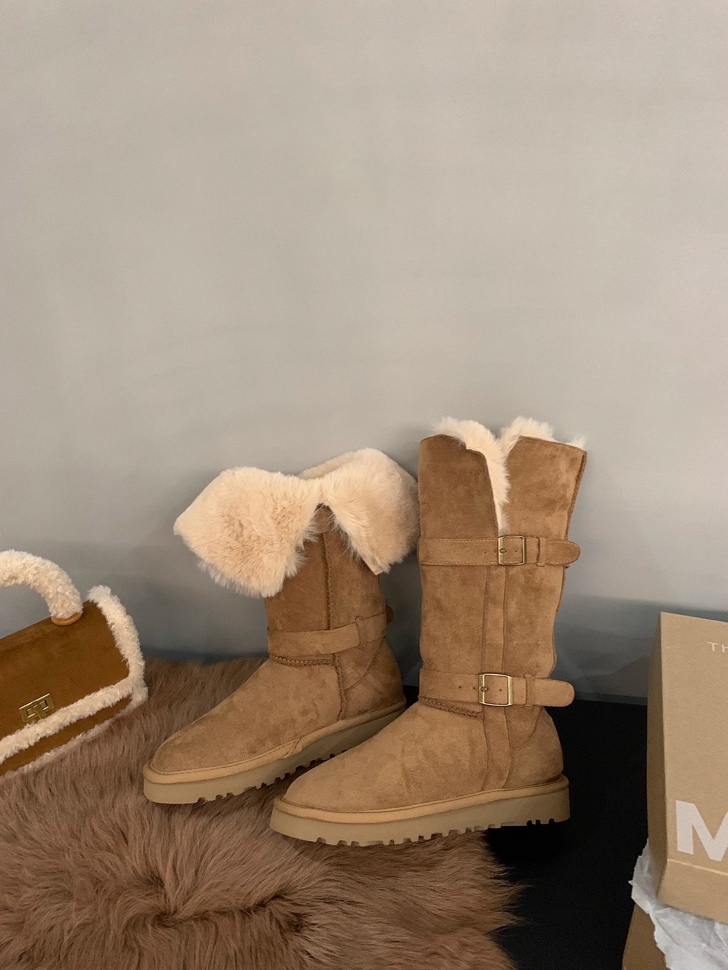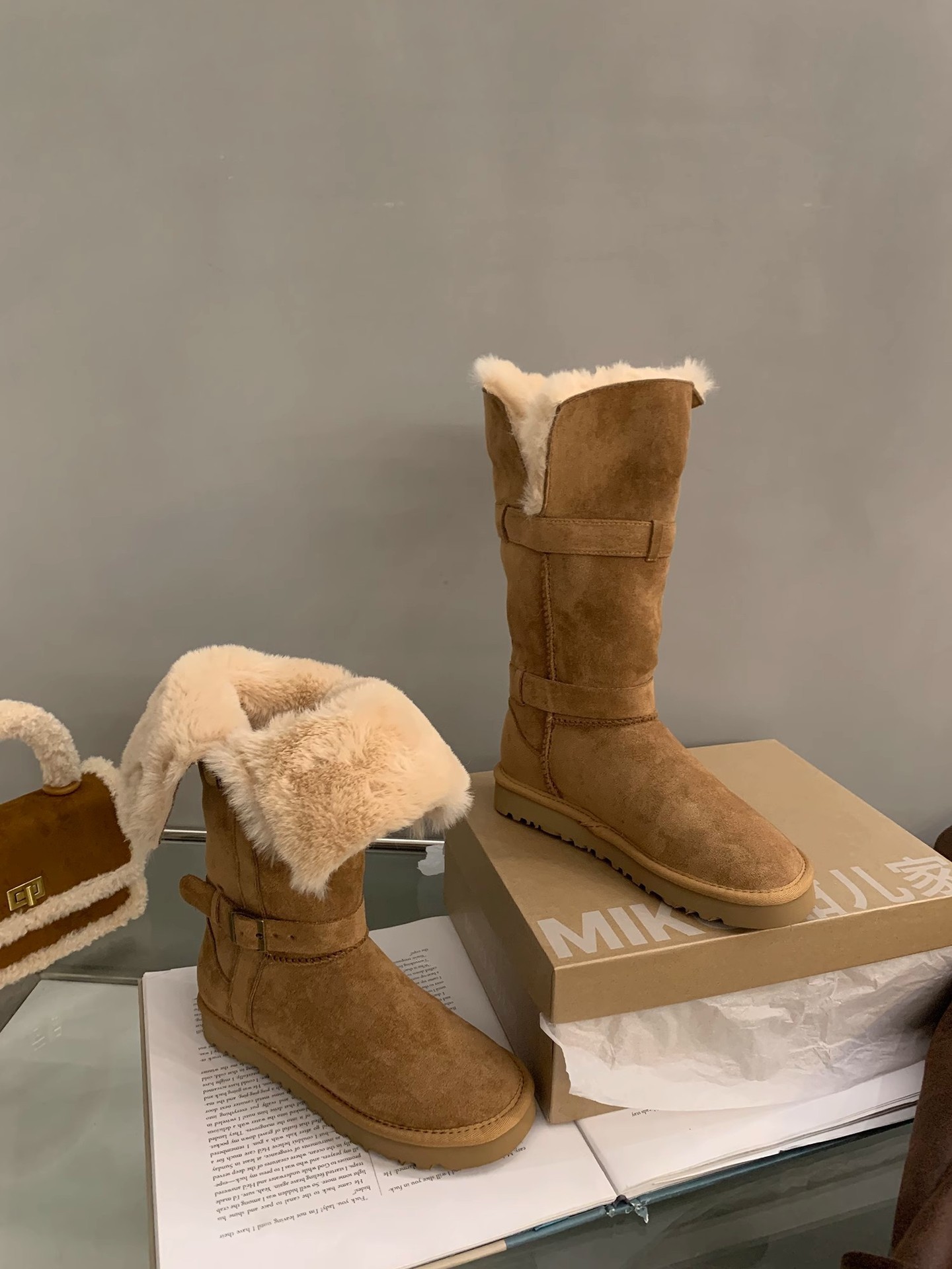 소가죽 양가죽 모피 일체형 스노우 부츠 여성 빈티지한 라운드헤드 플랫 기모 기모 도톰한 미들면 슈즈지만 무릎 부츠는 아닙니다