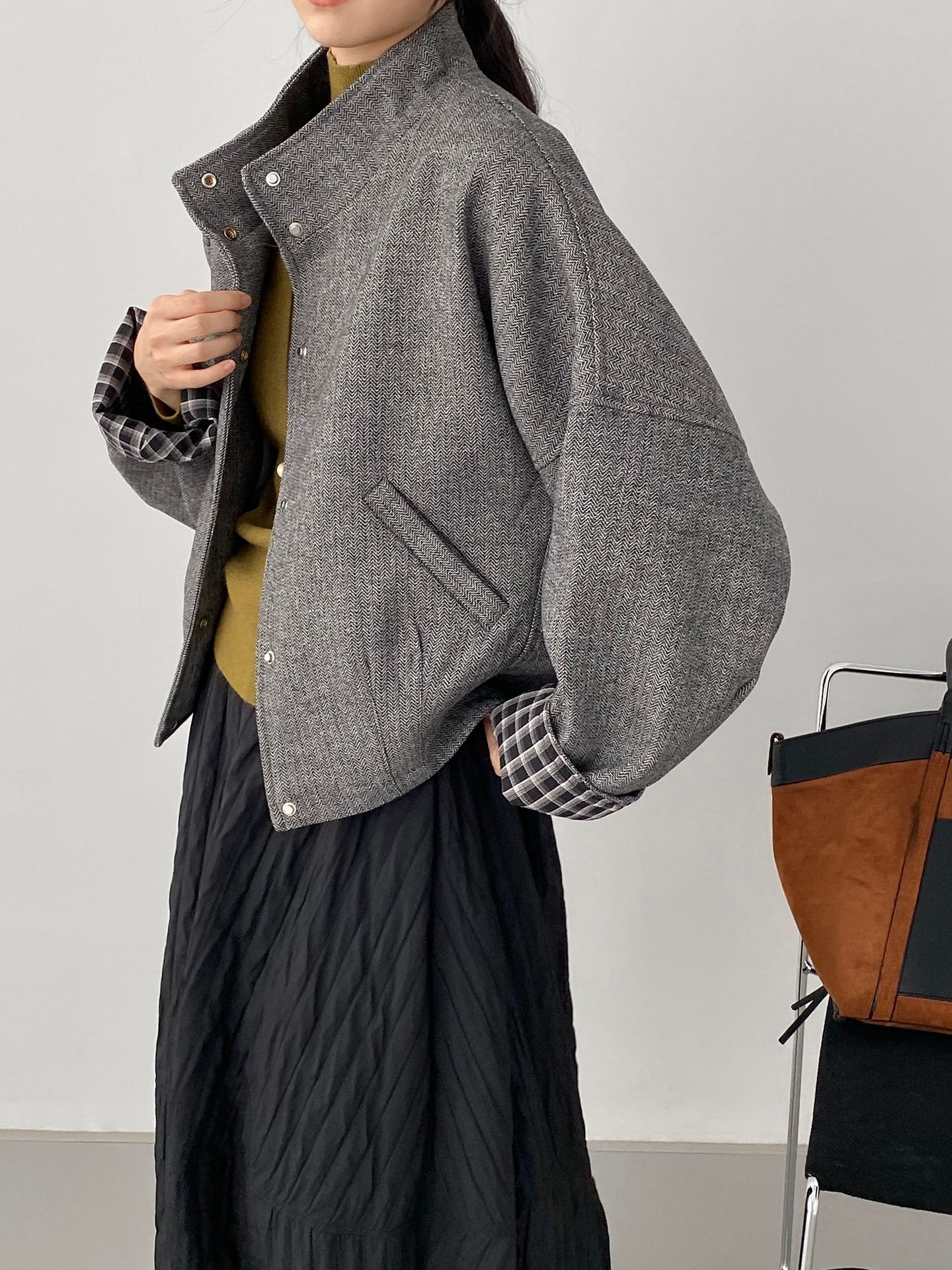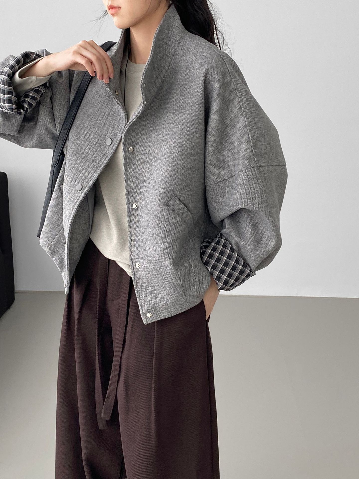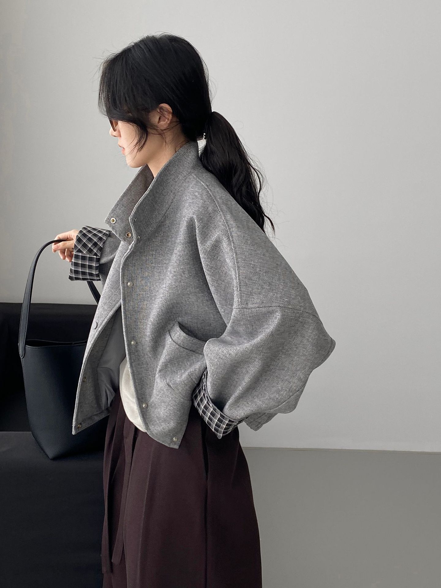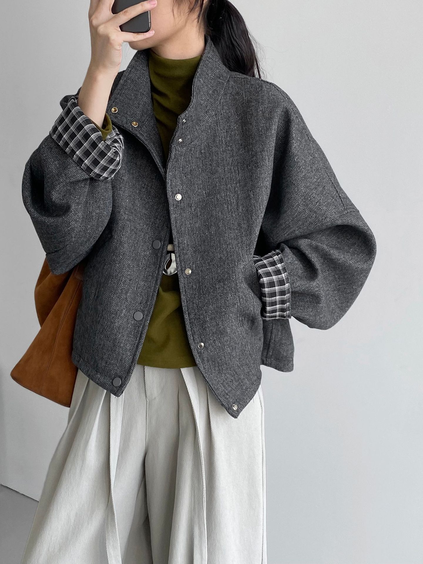 한풍 빈티지 40 울 차이나 아우터 여성 그레이 체크 짜임 와이드 트위드 탑