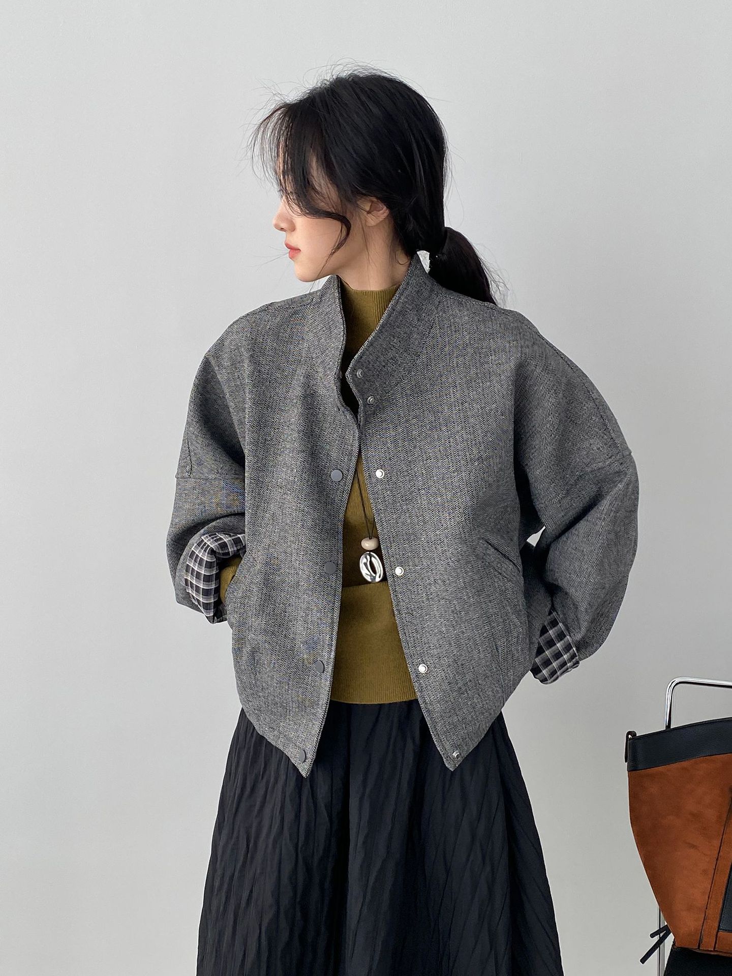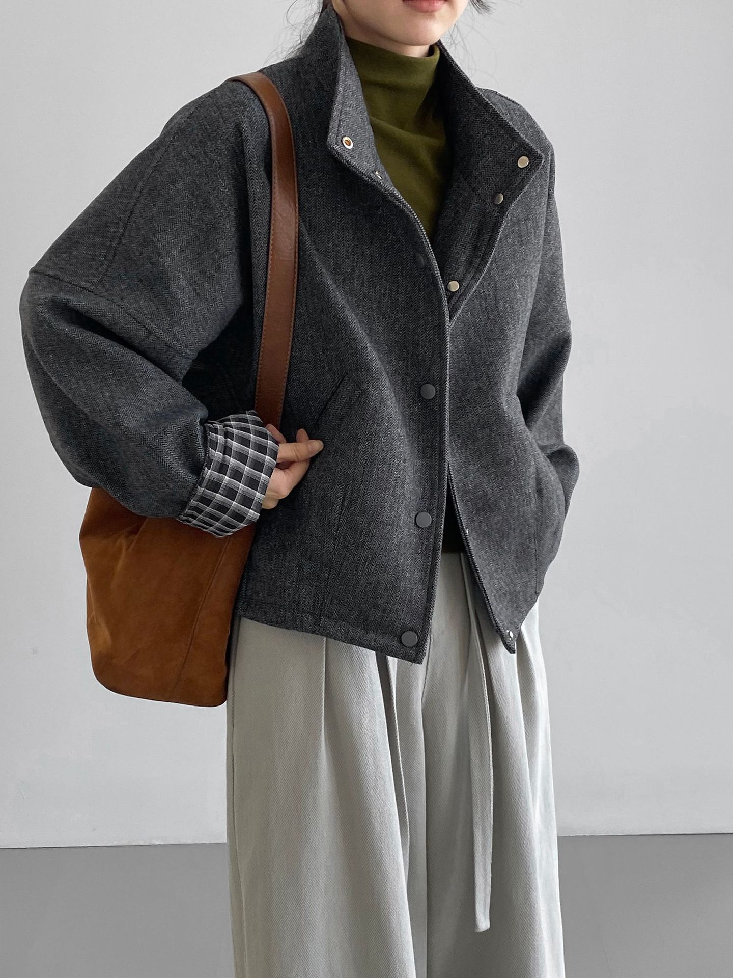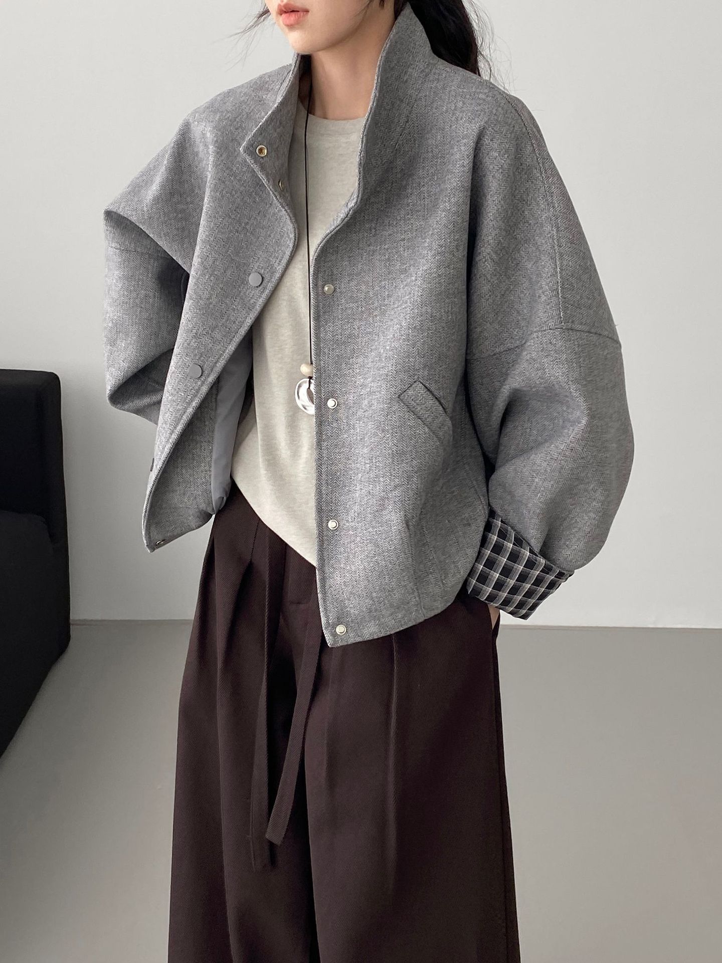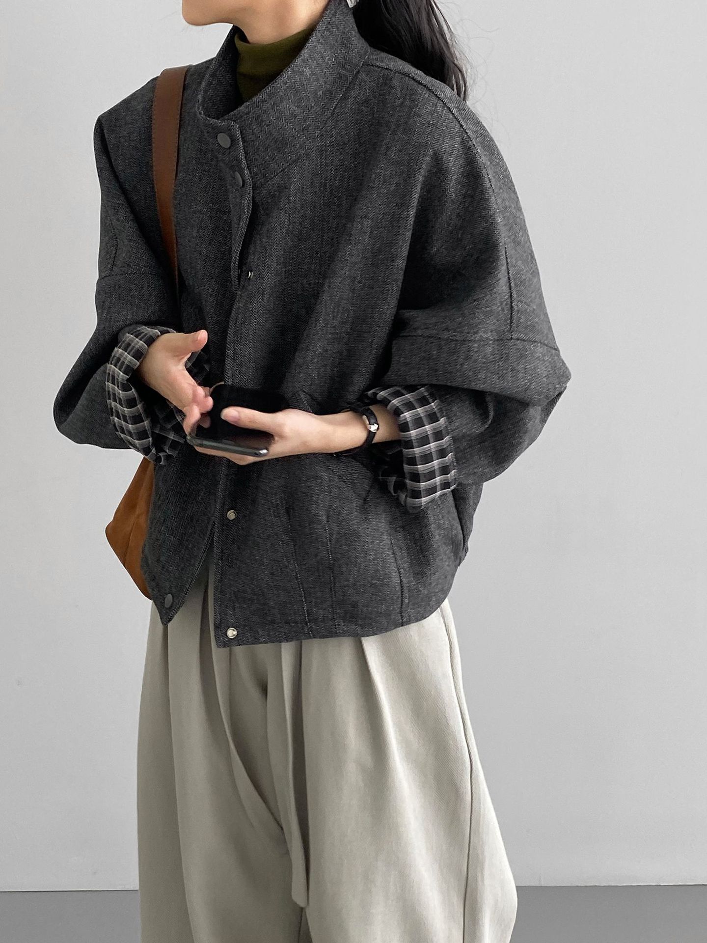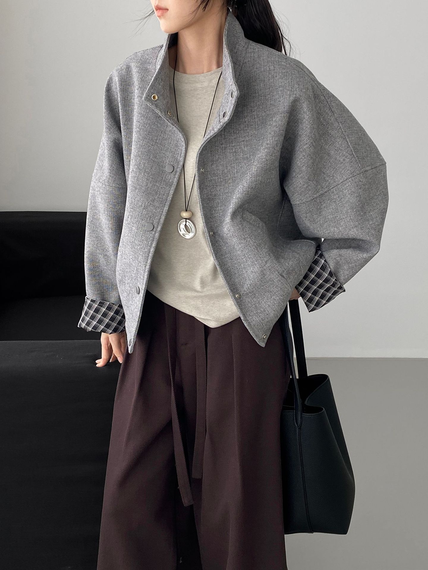 한풍 빈티지 40 울 차이나 아우터 여성 그레이 체크 짜임 와이드 트위드 탑