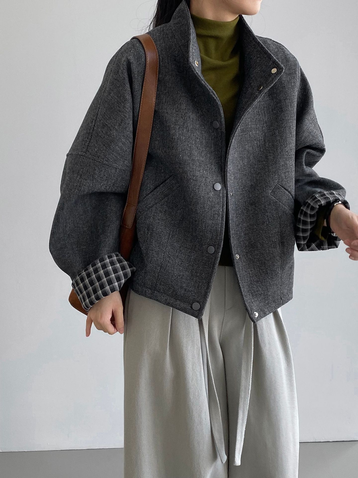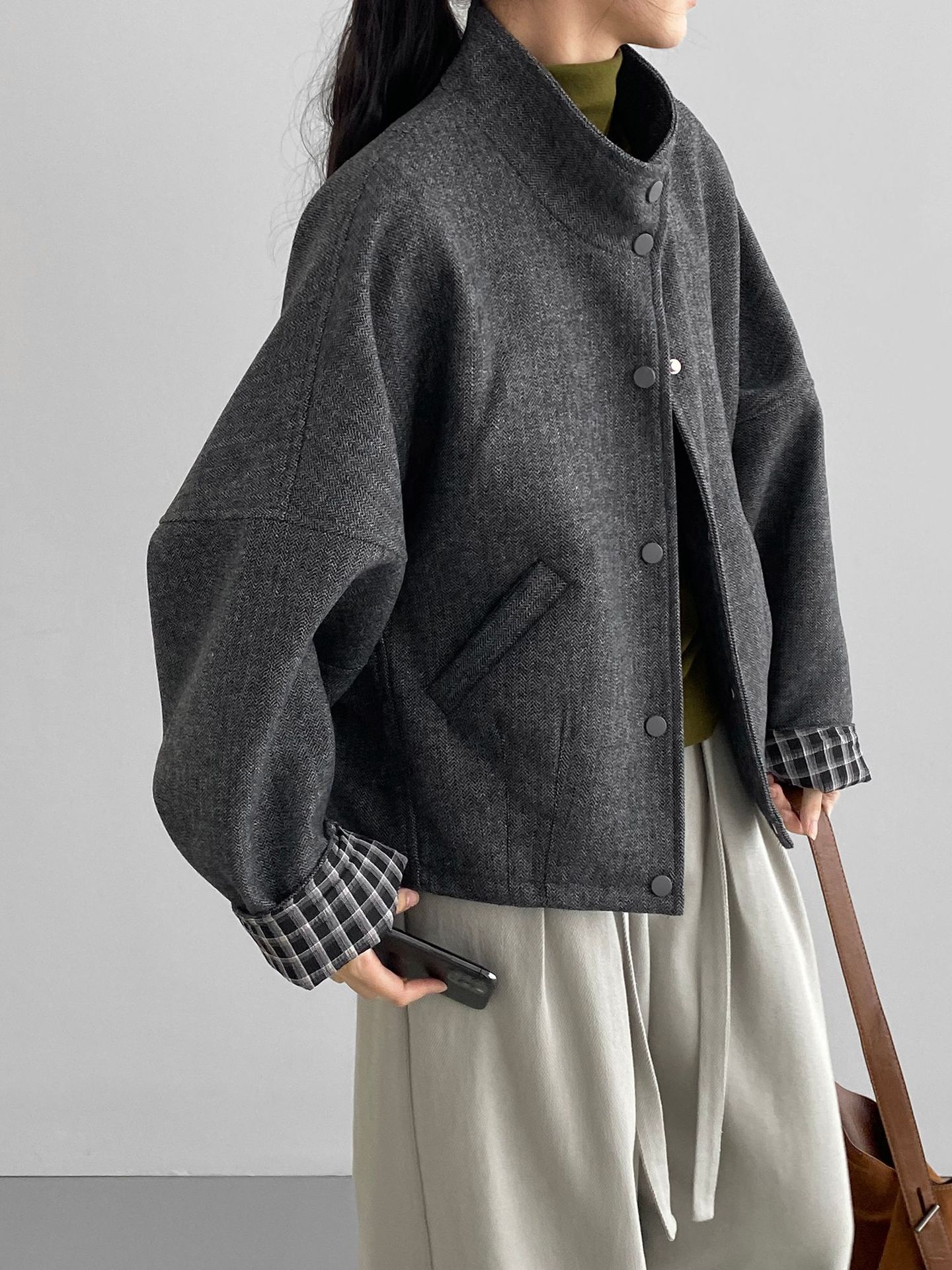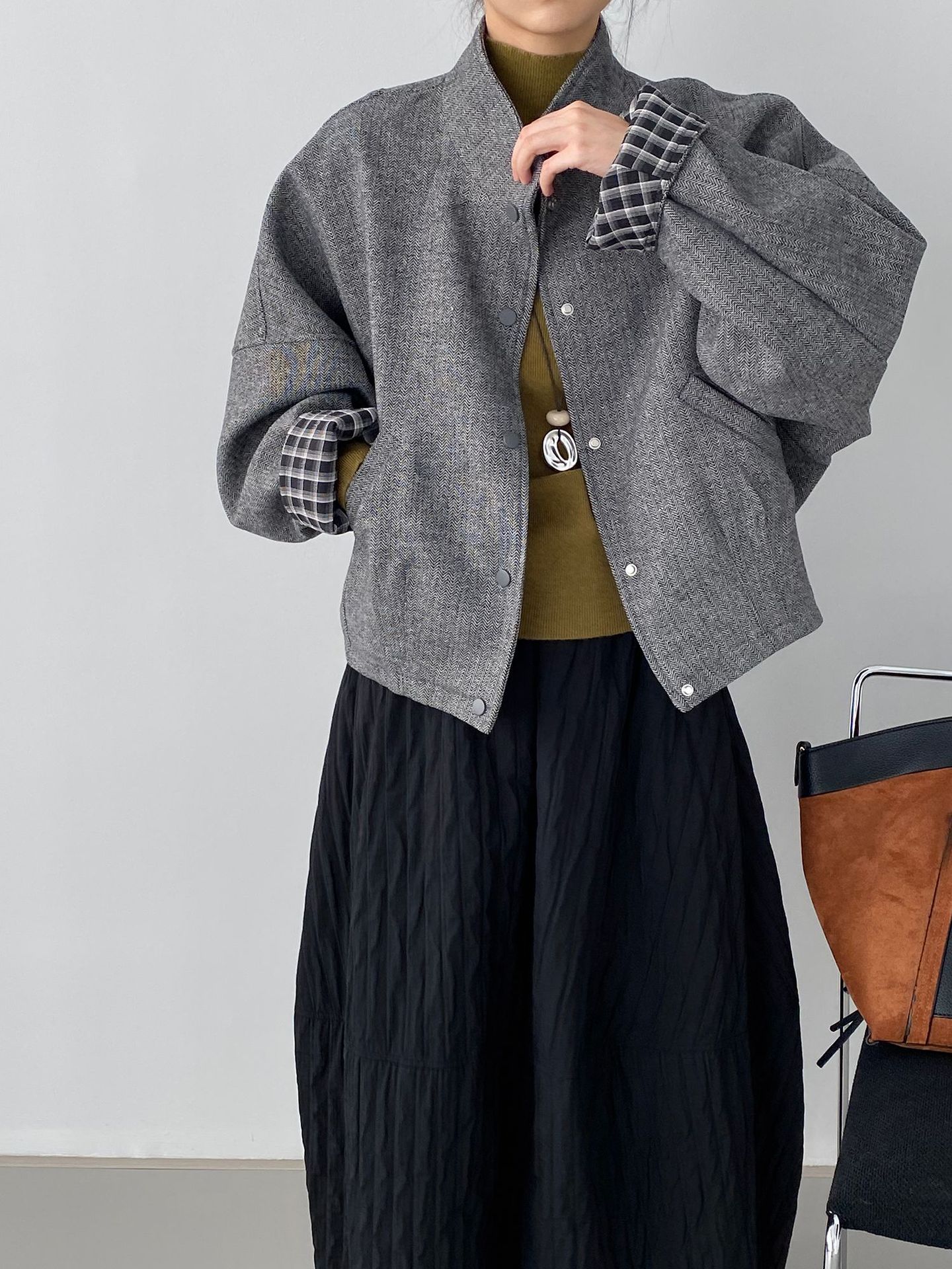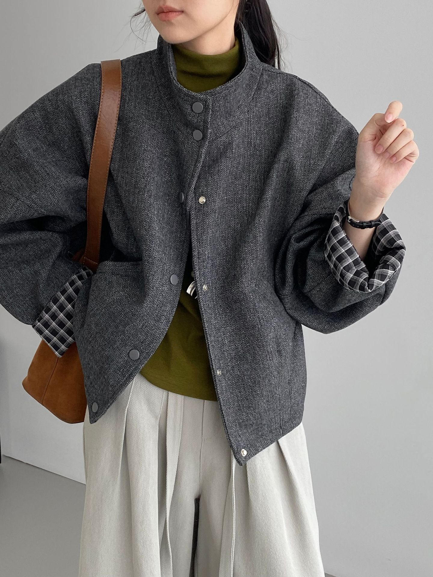 한풍 빈티지 40 울 차이나 아우터 여성 그레이 체크 짜임 와이드 트위드 탑