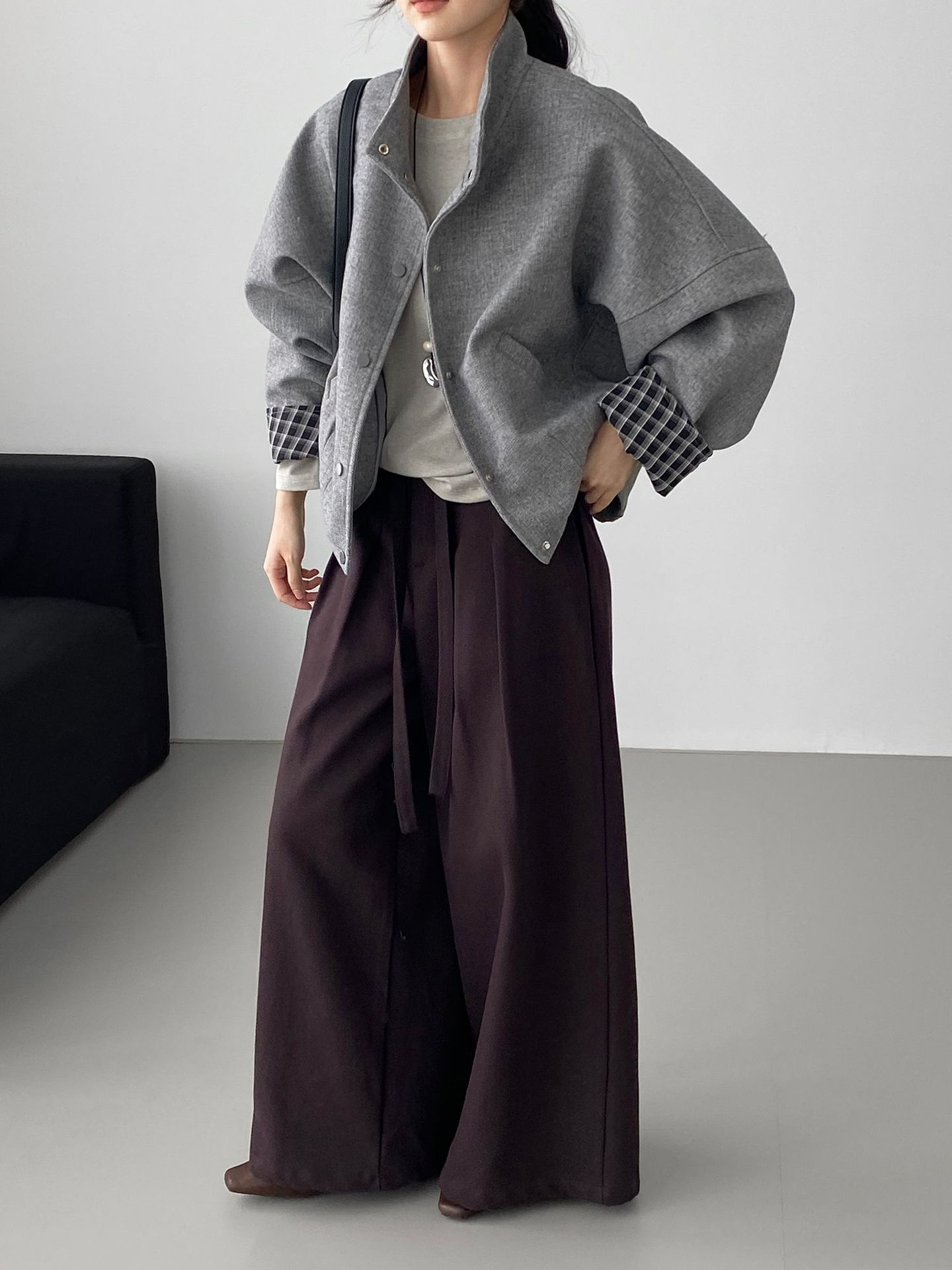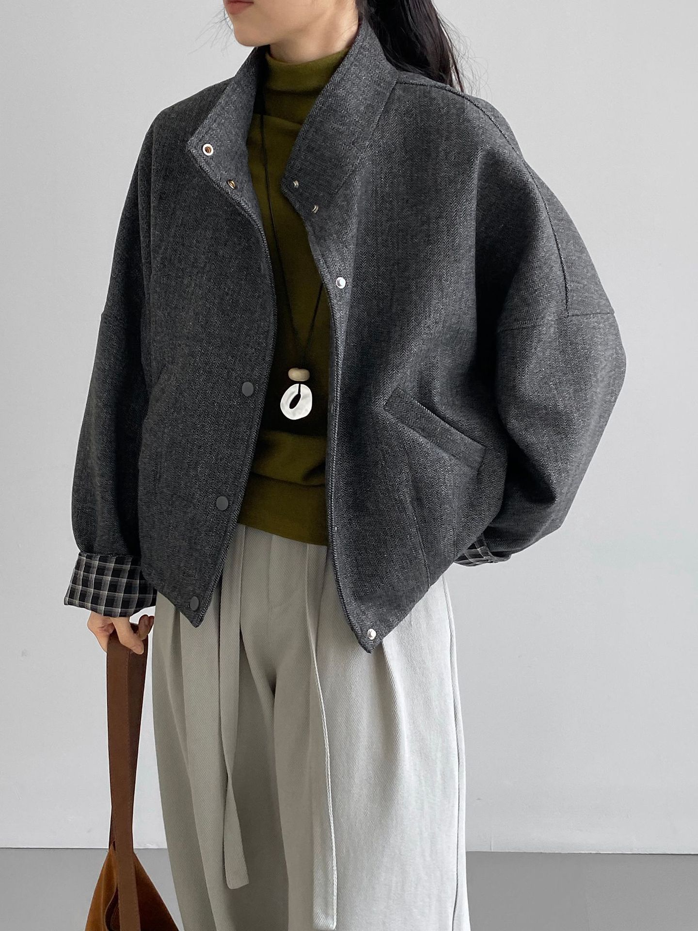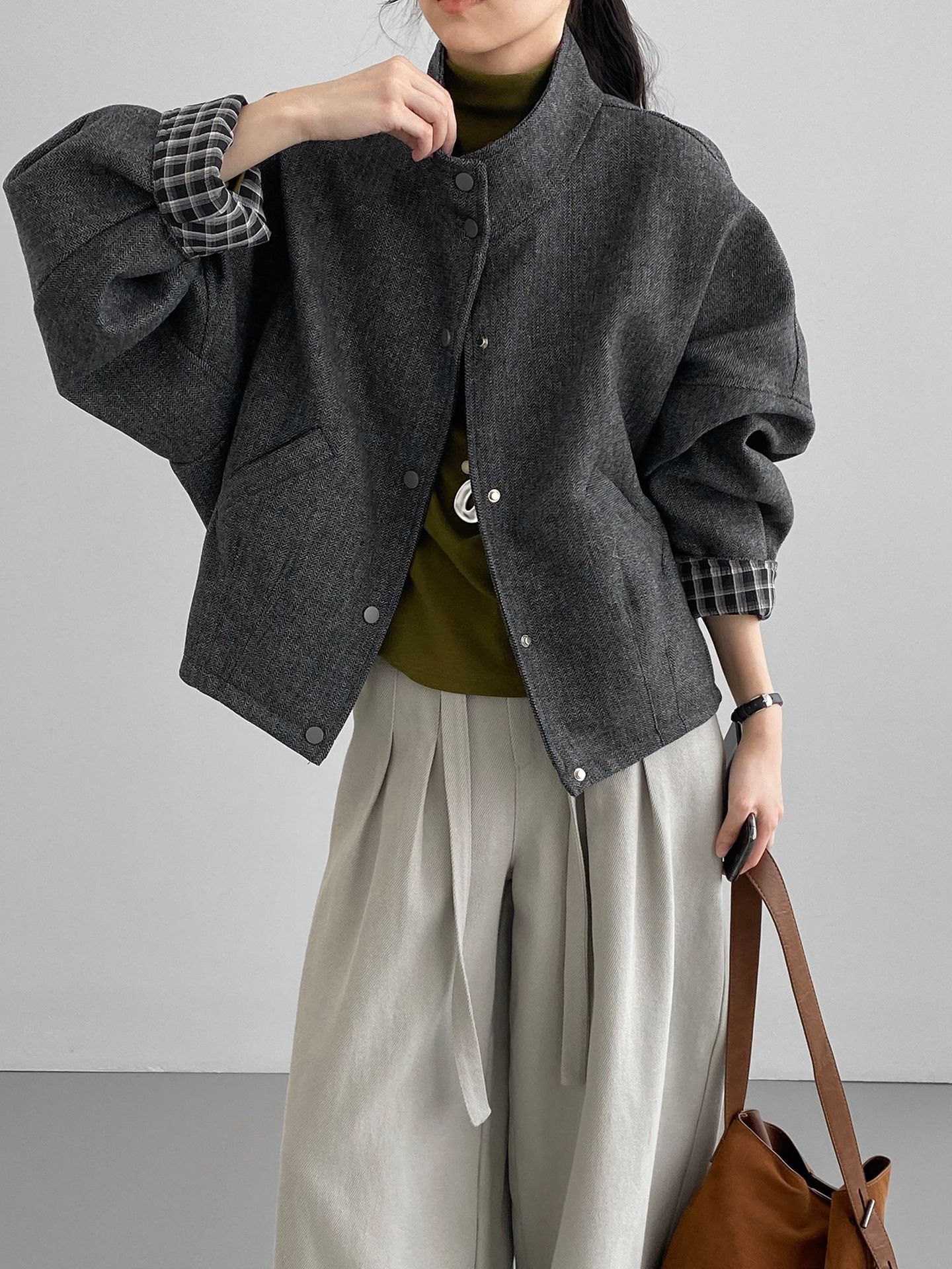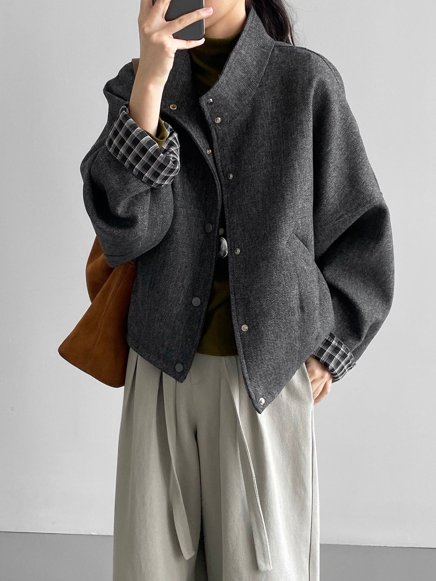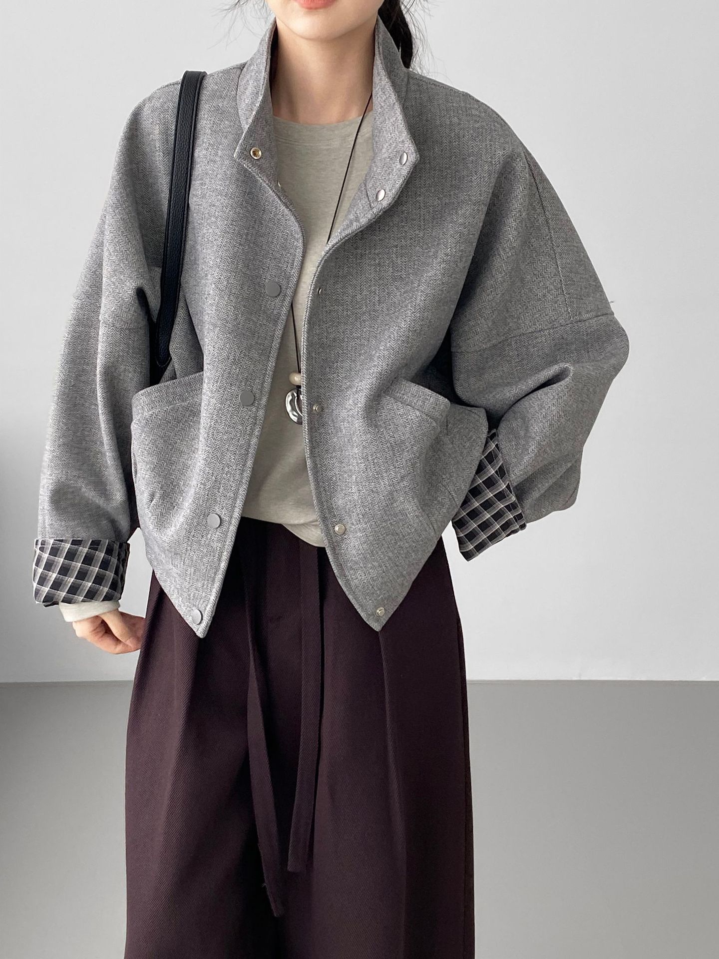 한풍 빈티지 40 울 차이나 아우터 여성 그레이 체크 짜임 와이드 트위드 탑