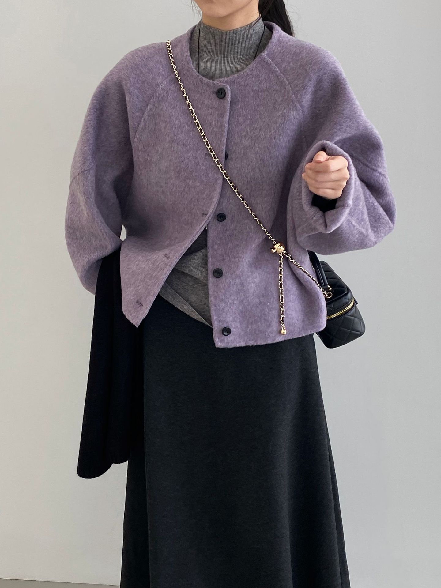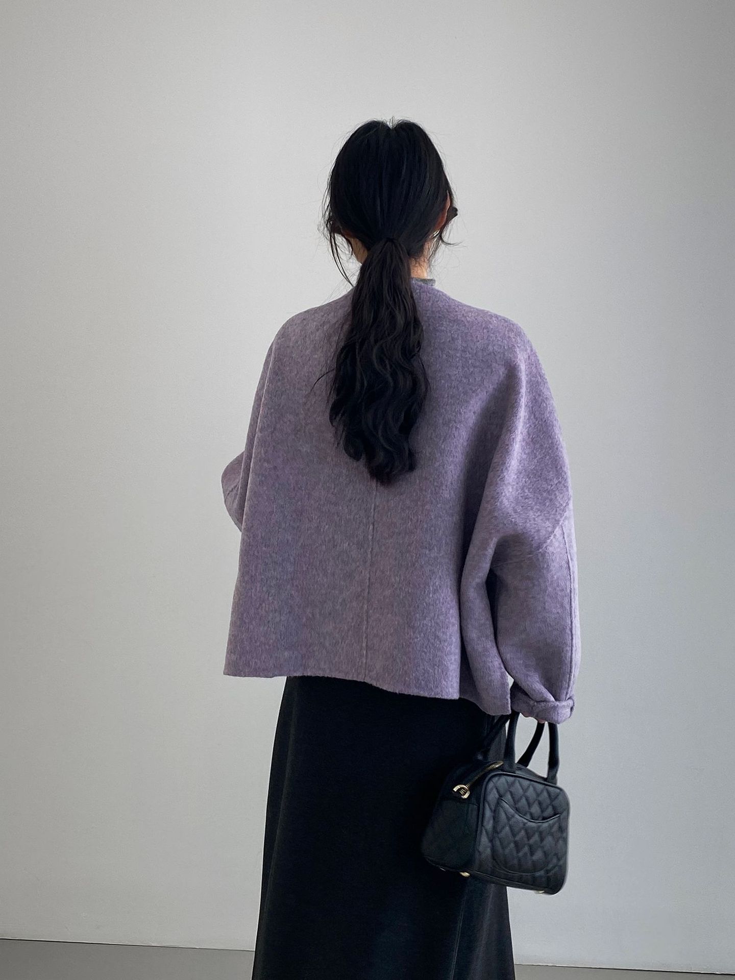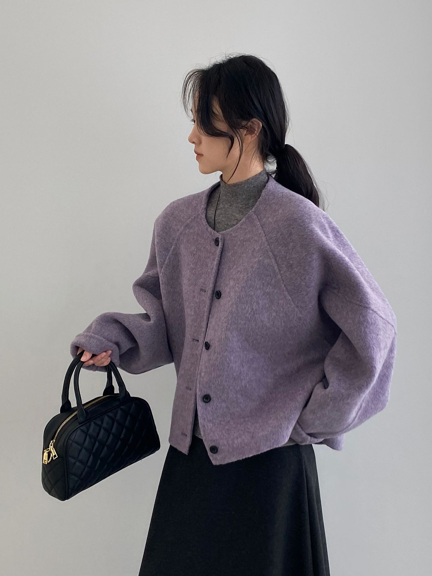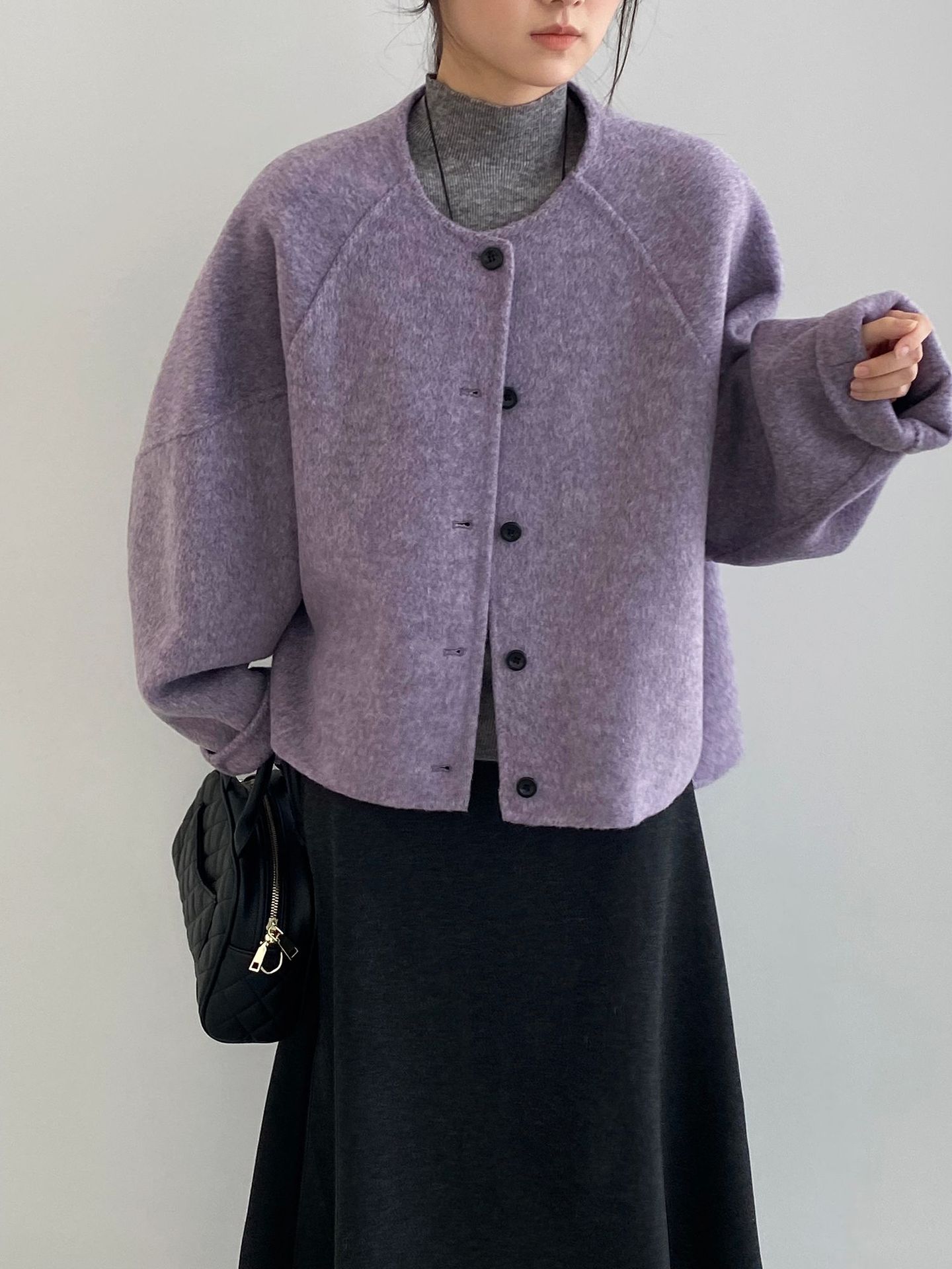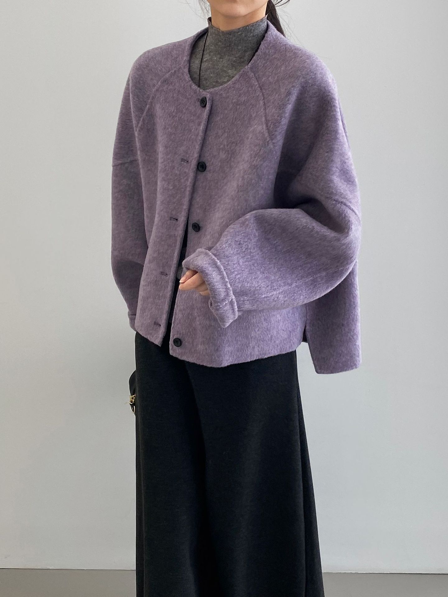 보라색 코트 라운드넥 울 알파카 양면 트위드 숏 루즈핏 코트여