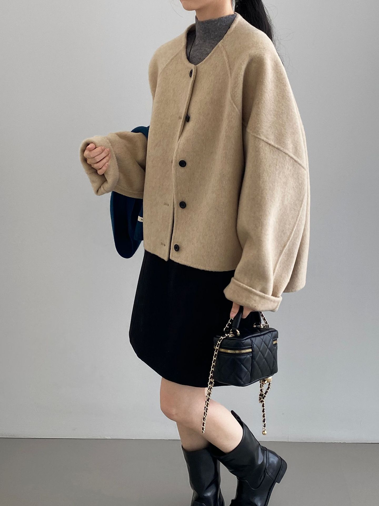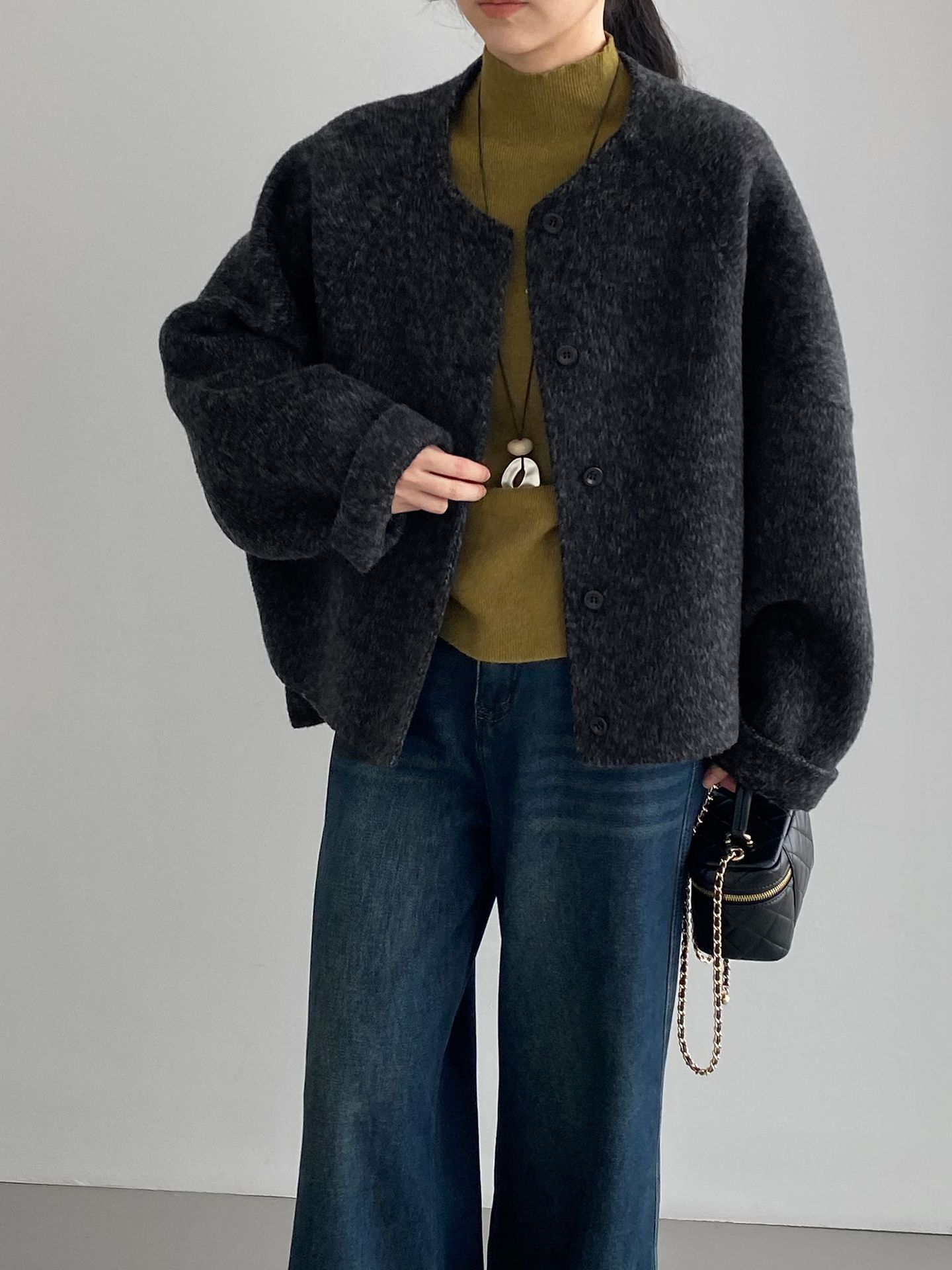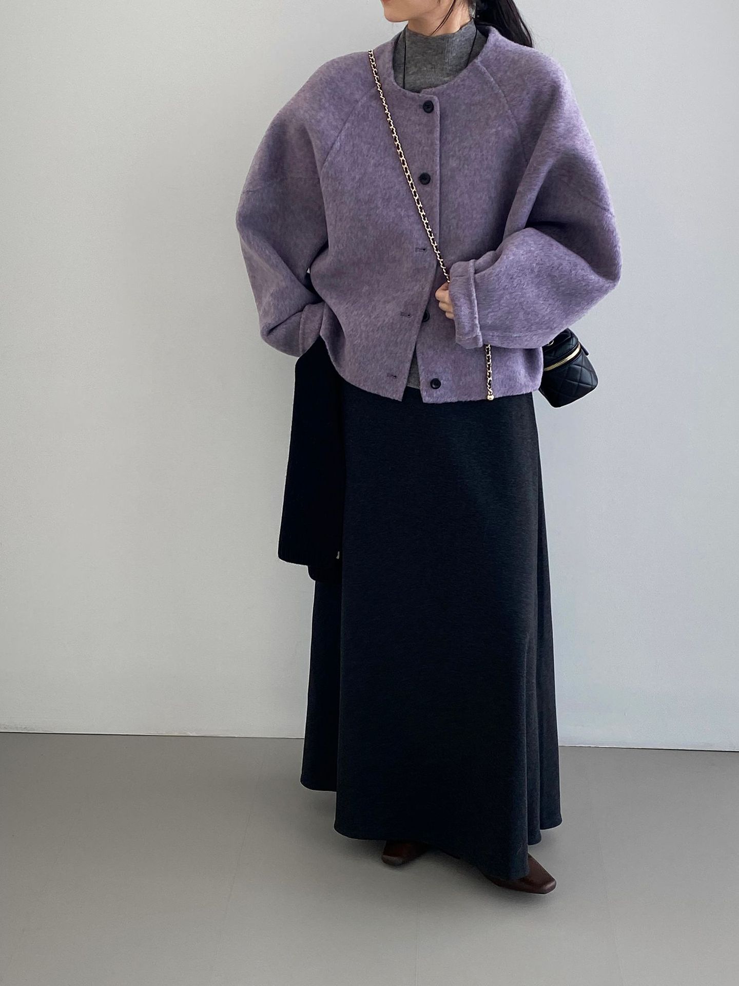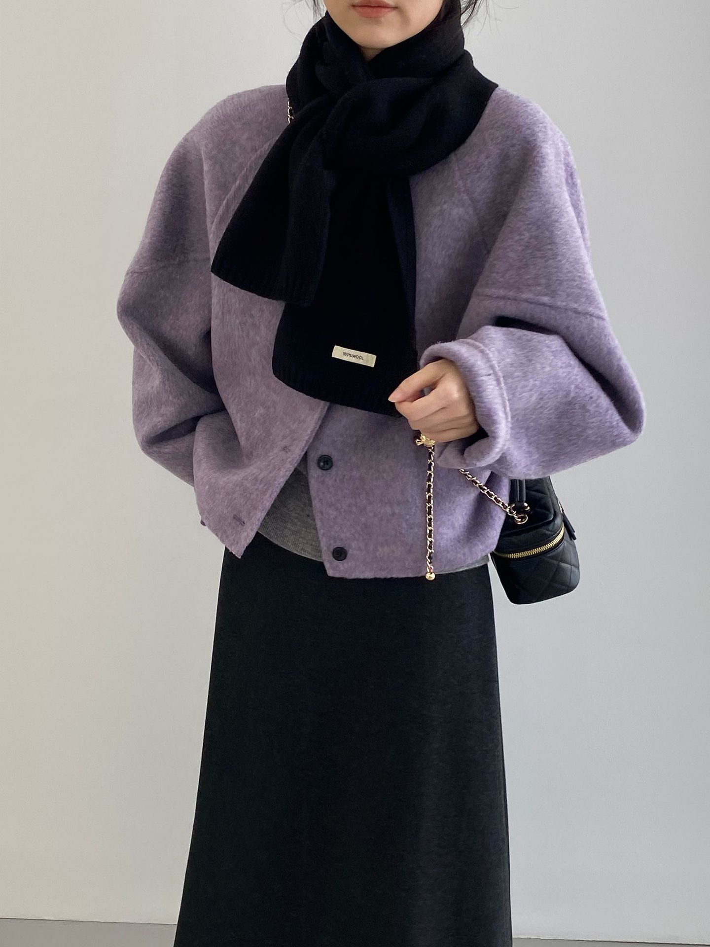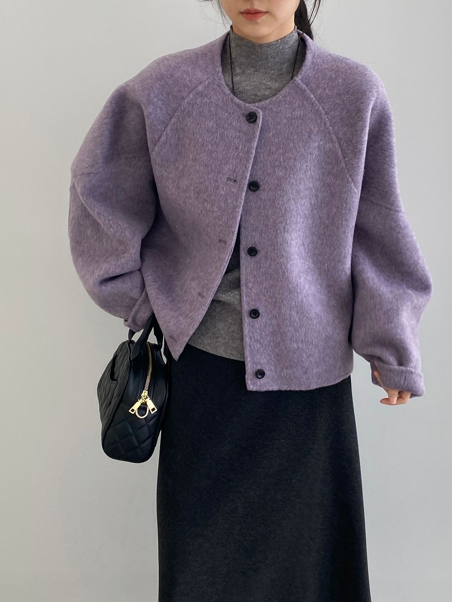 보라색 코트 라운드넥 울 알파카 양면 트위드 숏 루즈핏 코트여