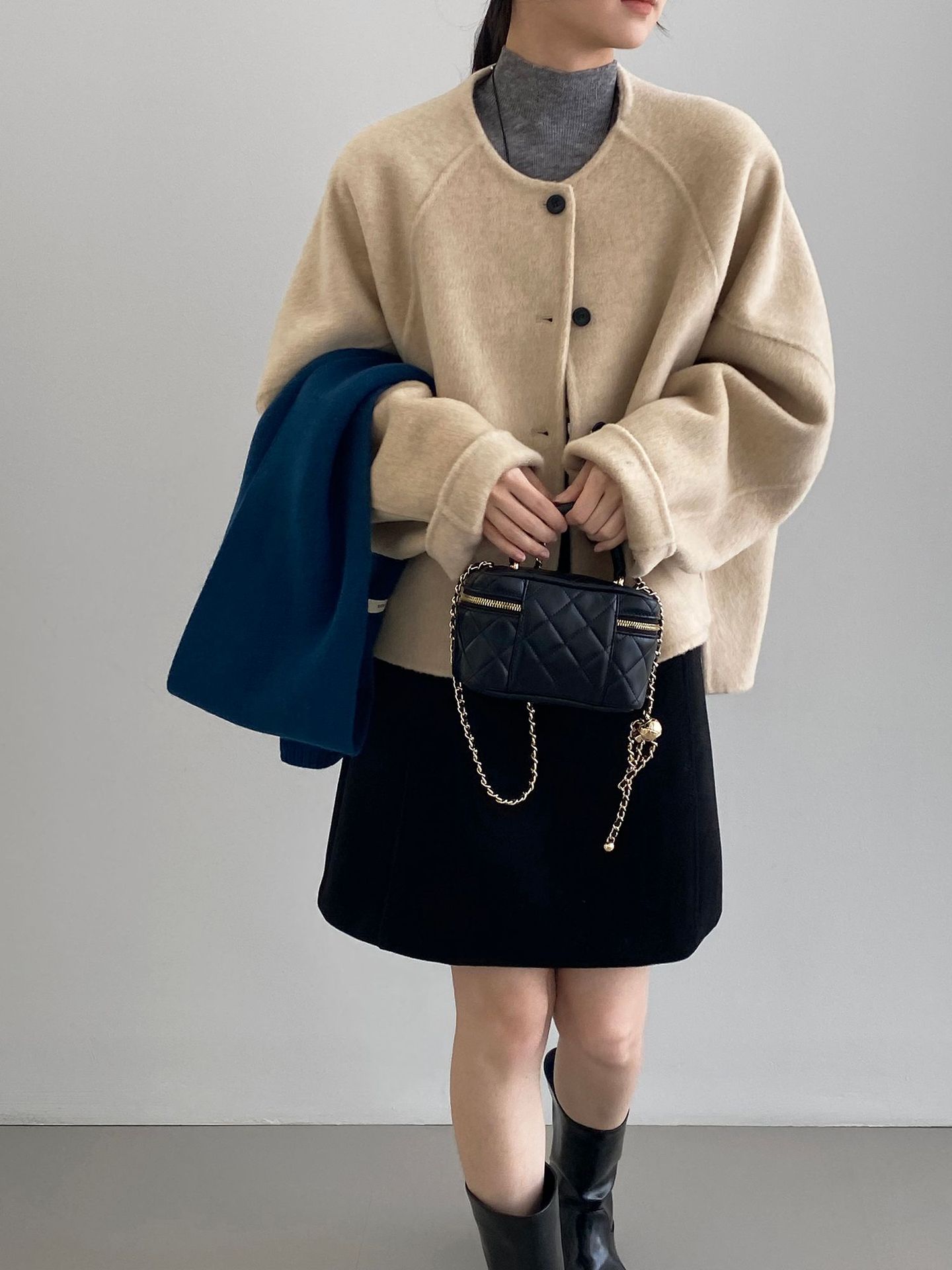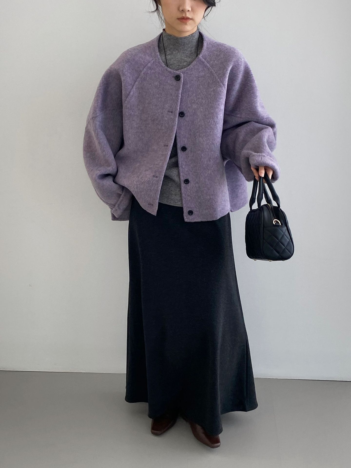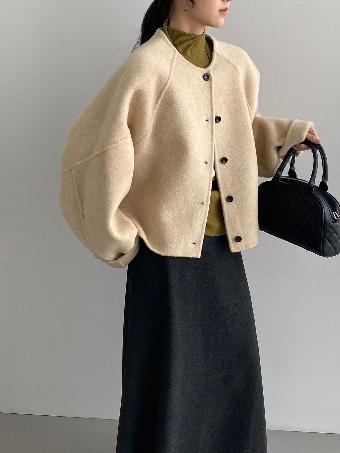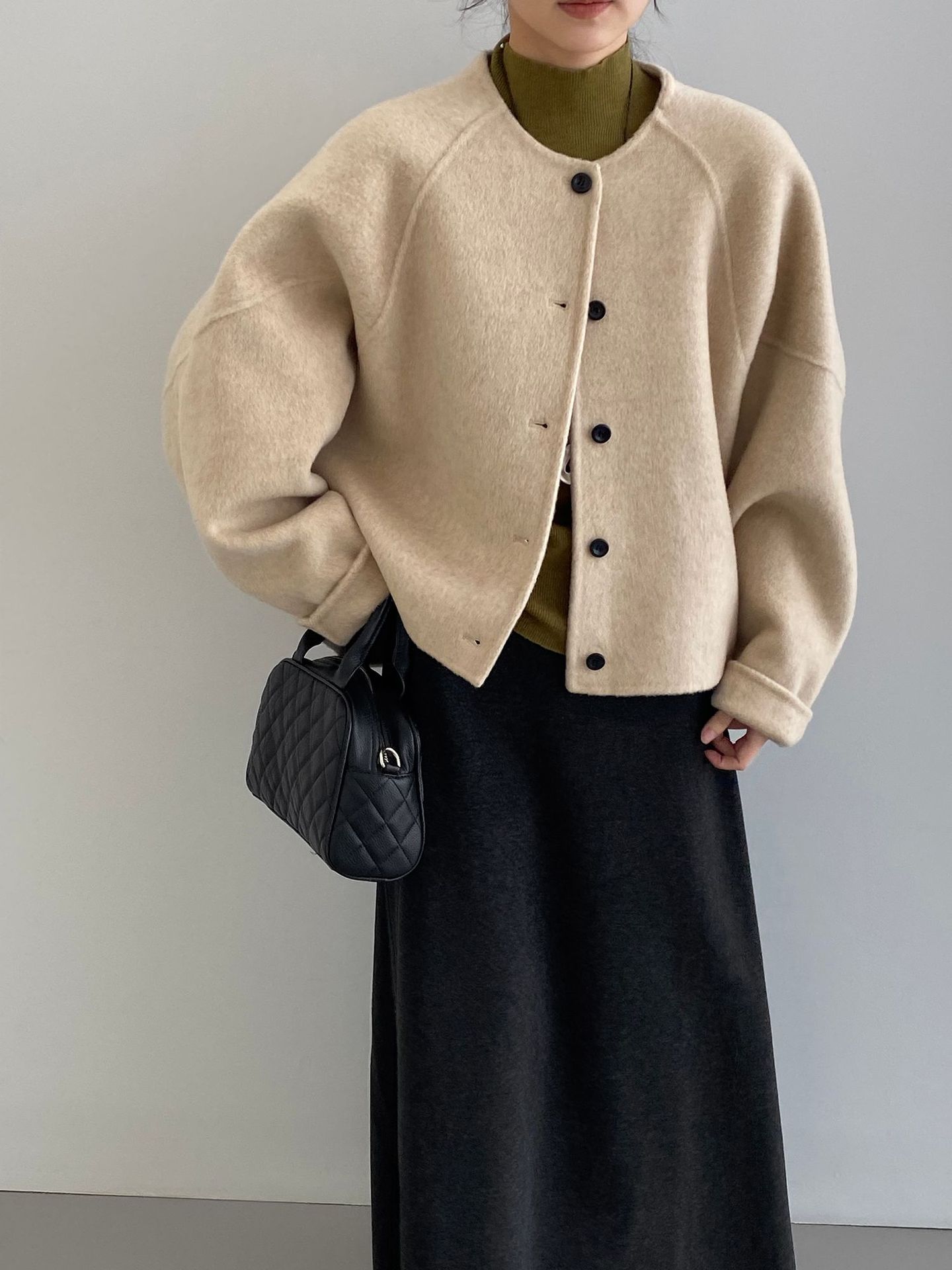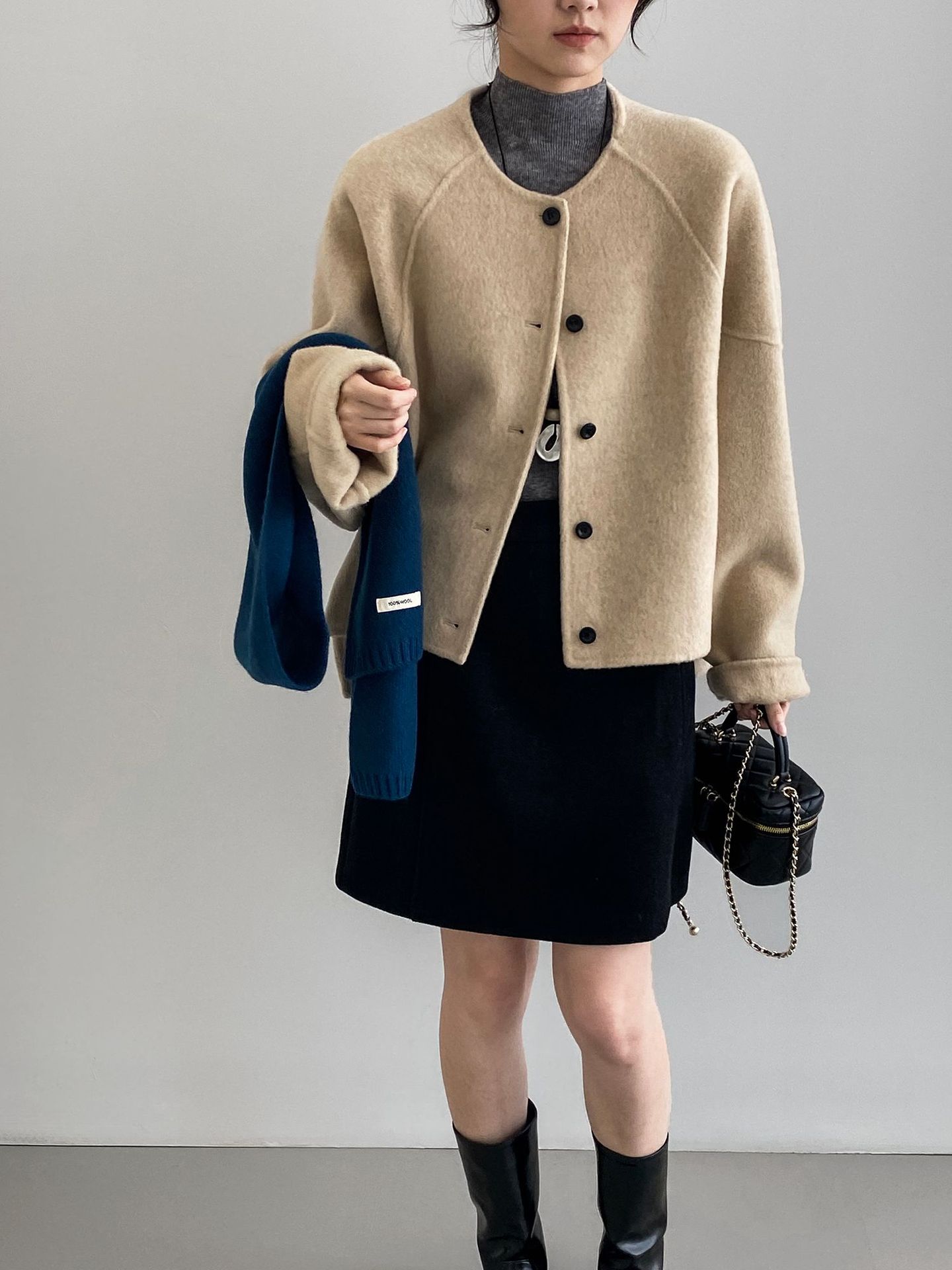 보라색 코트 라운드넥 울 알파카 양면 트위드 숏 루즈핏 코트여