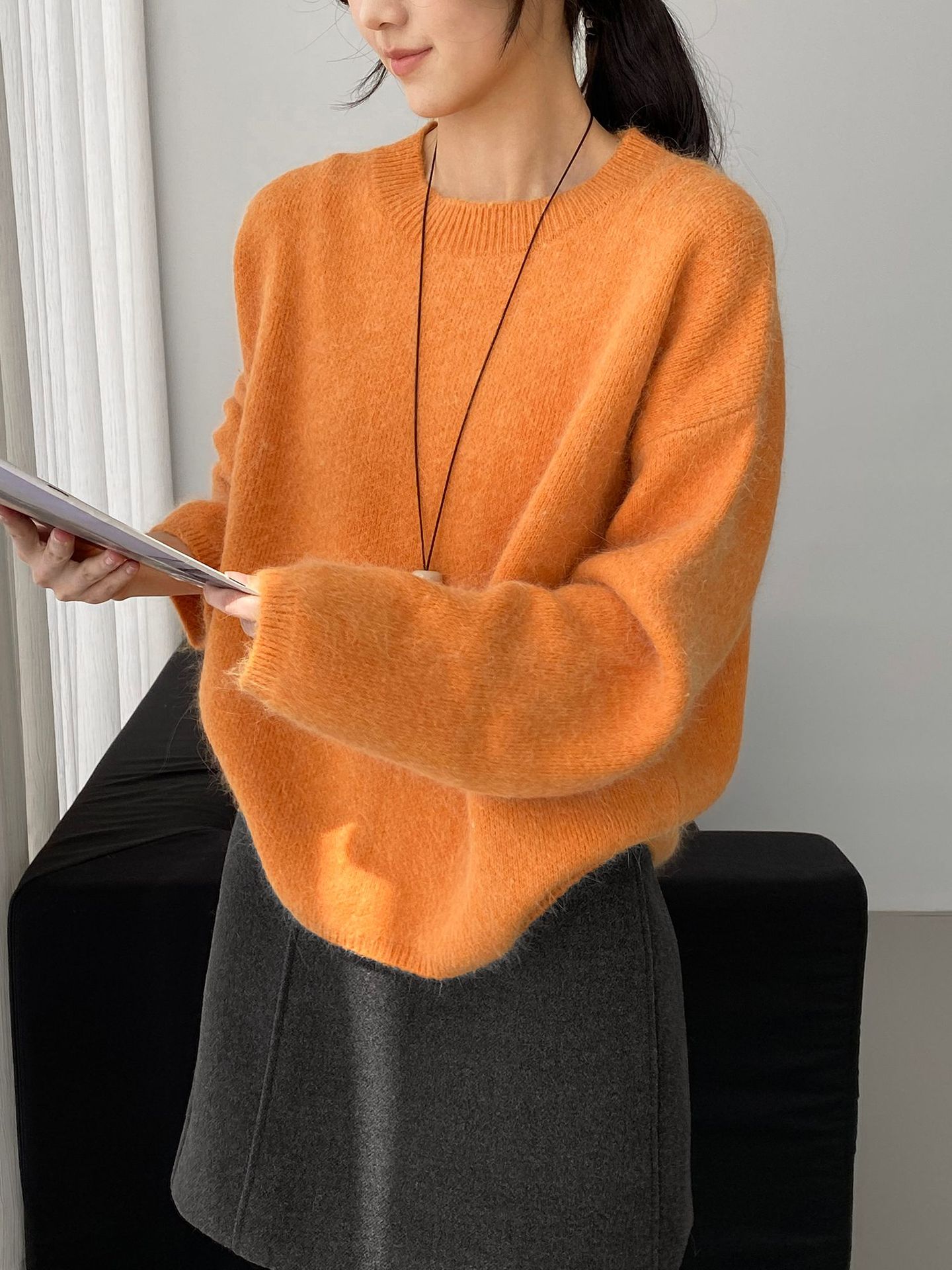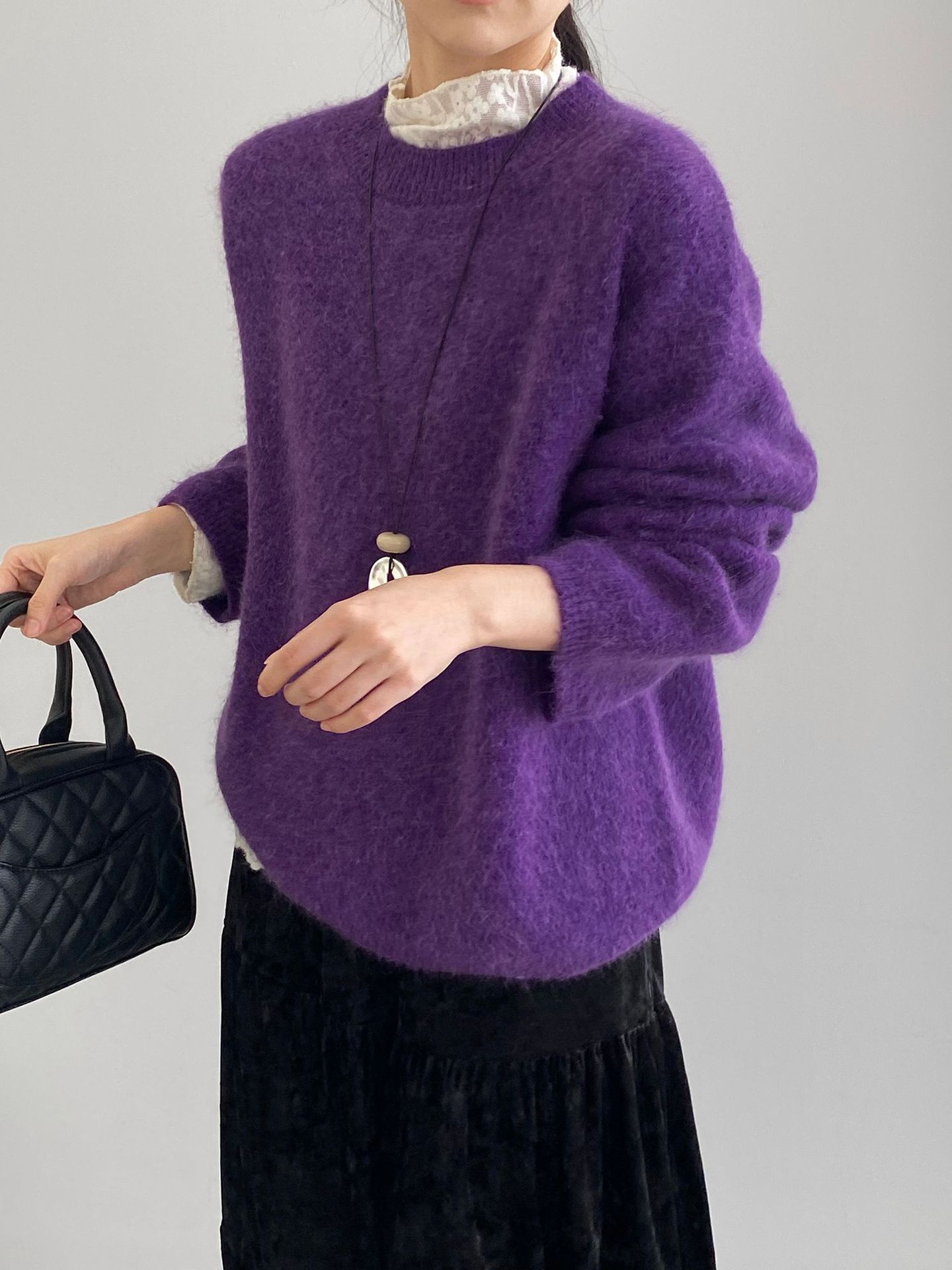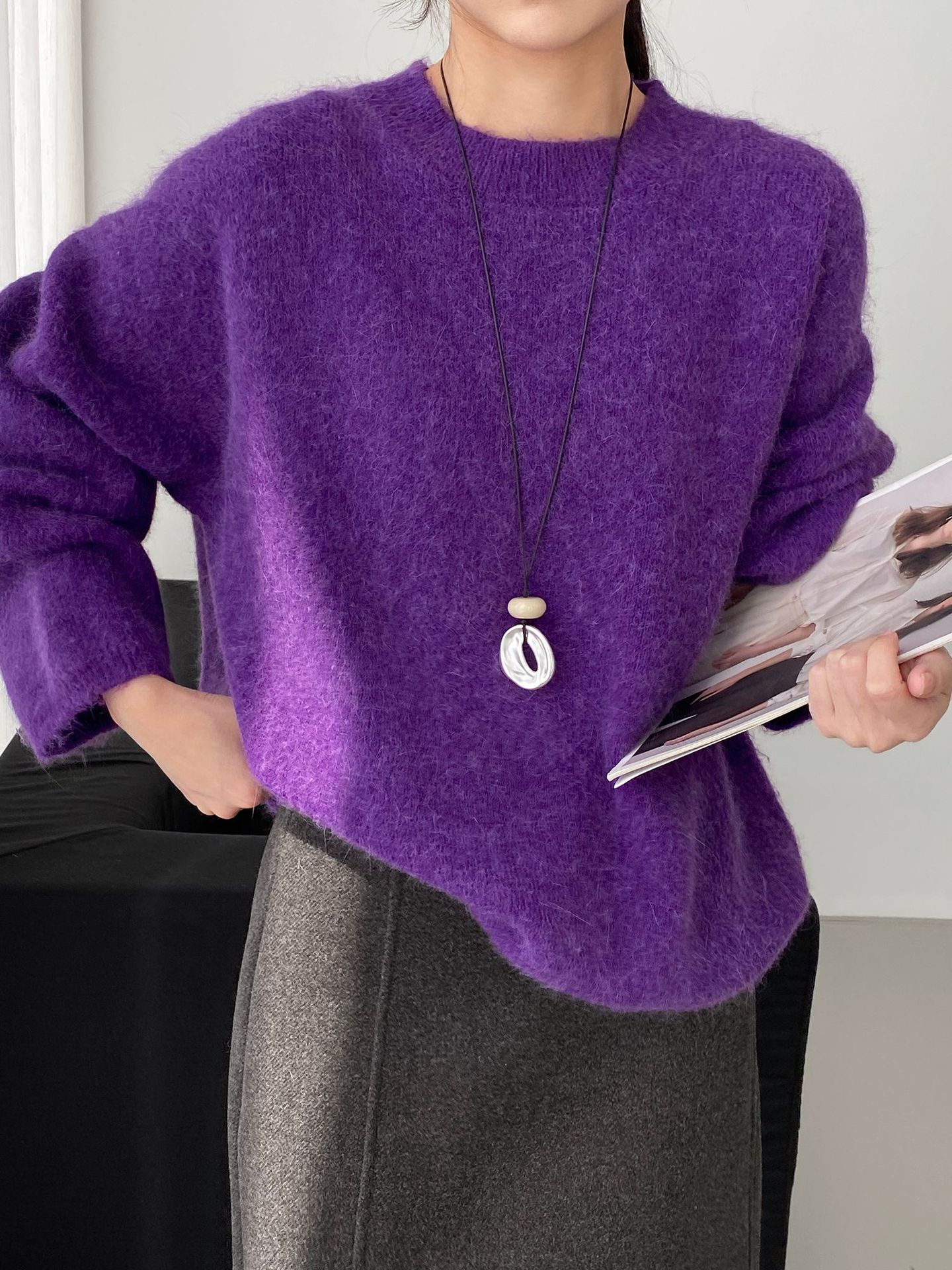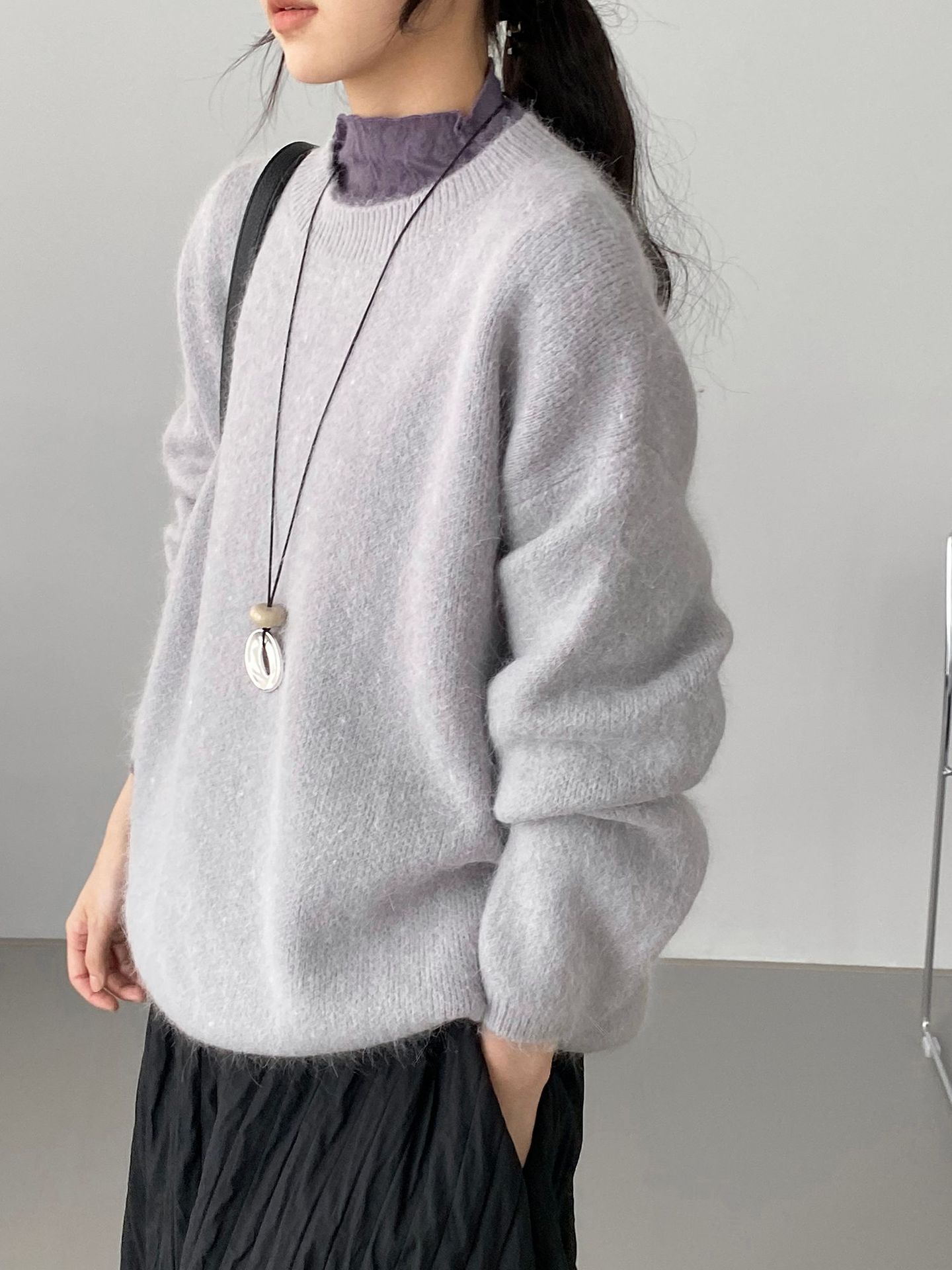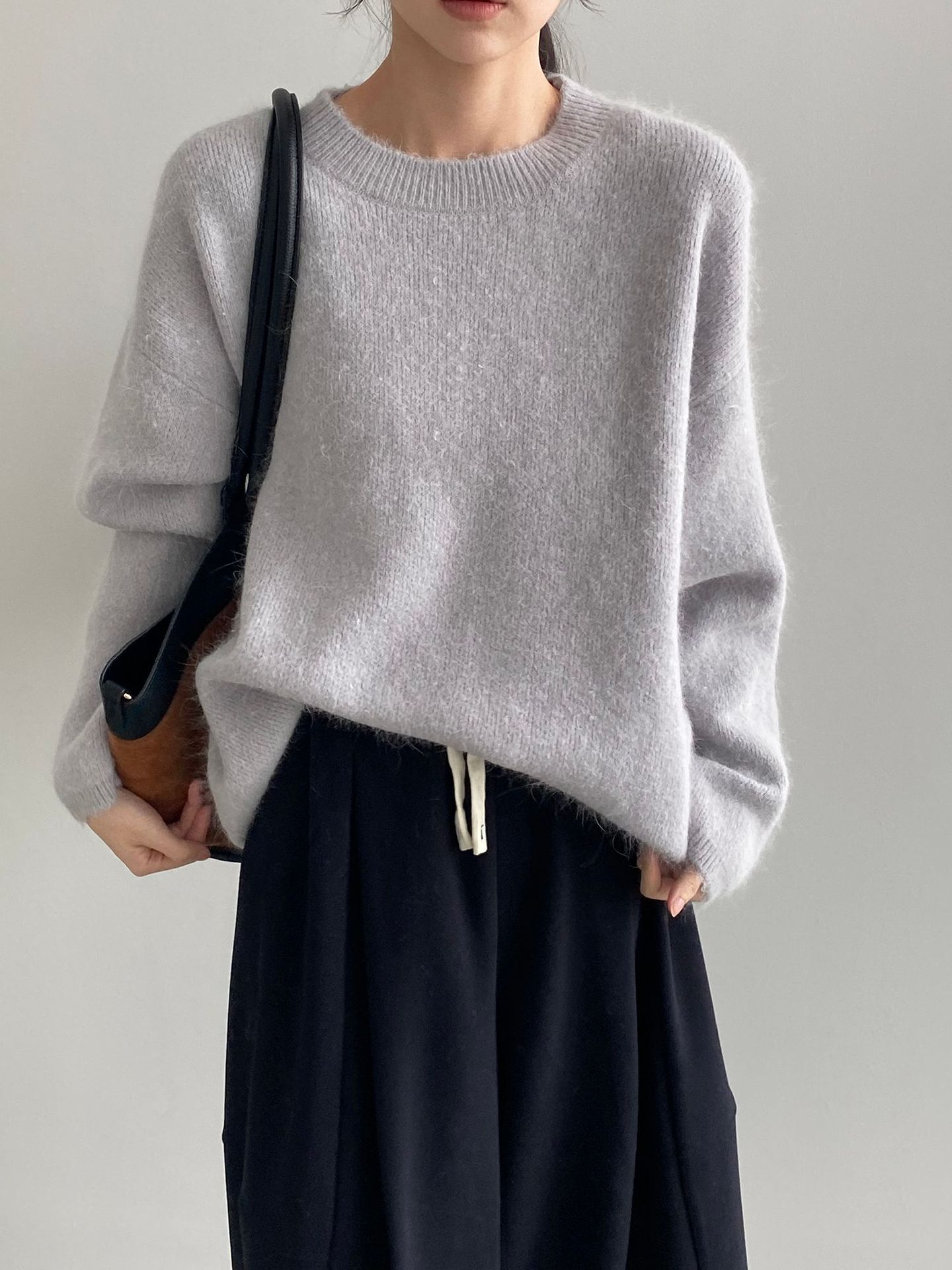라운드 칼라에 나른한 쫄깃한 토끼털 스웨터 심플하고 루즈한 느낌의 여성 코리안 니트입니다