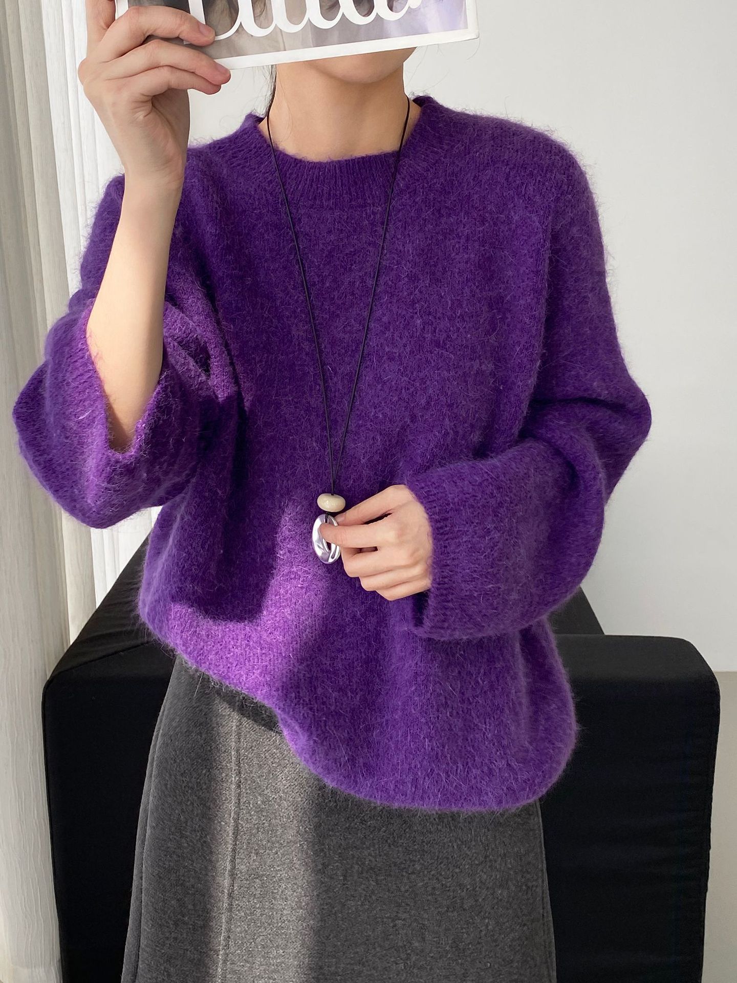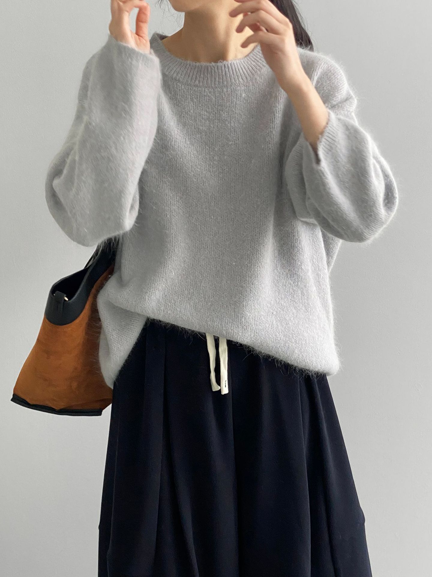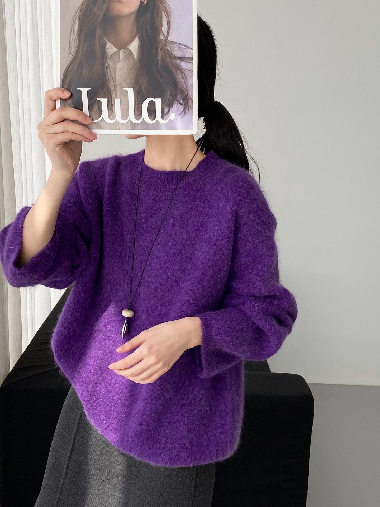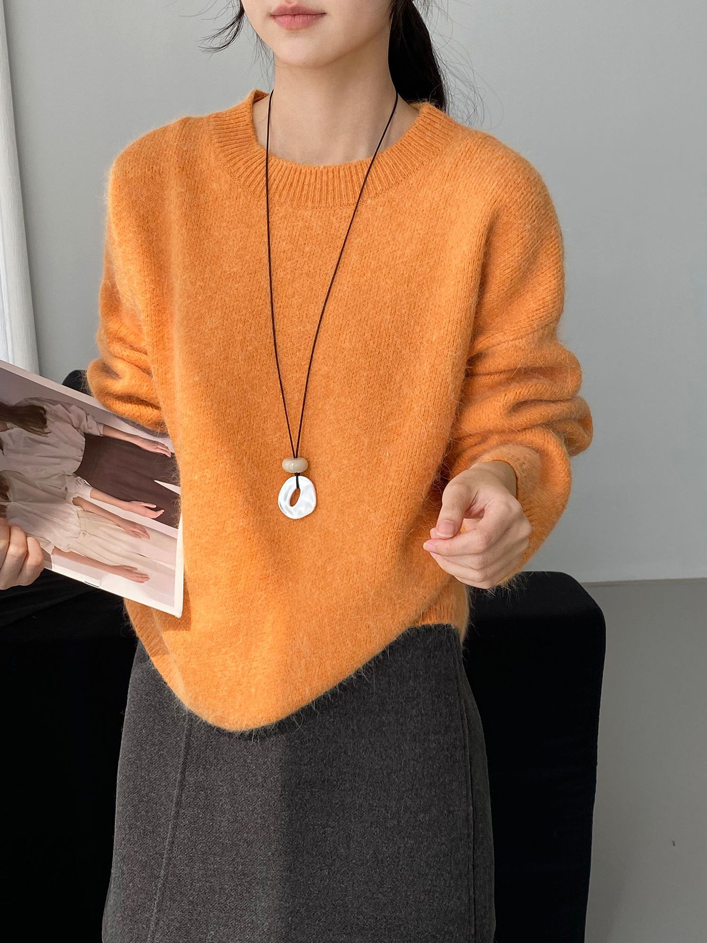 라운드 칼라에 나른한 쫄깃한 토끼털 스웨터 심플하고 루즈한 느낌의 여성 코리안 니트입니다