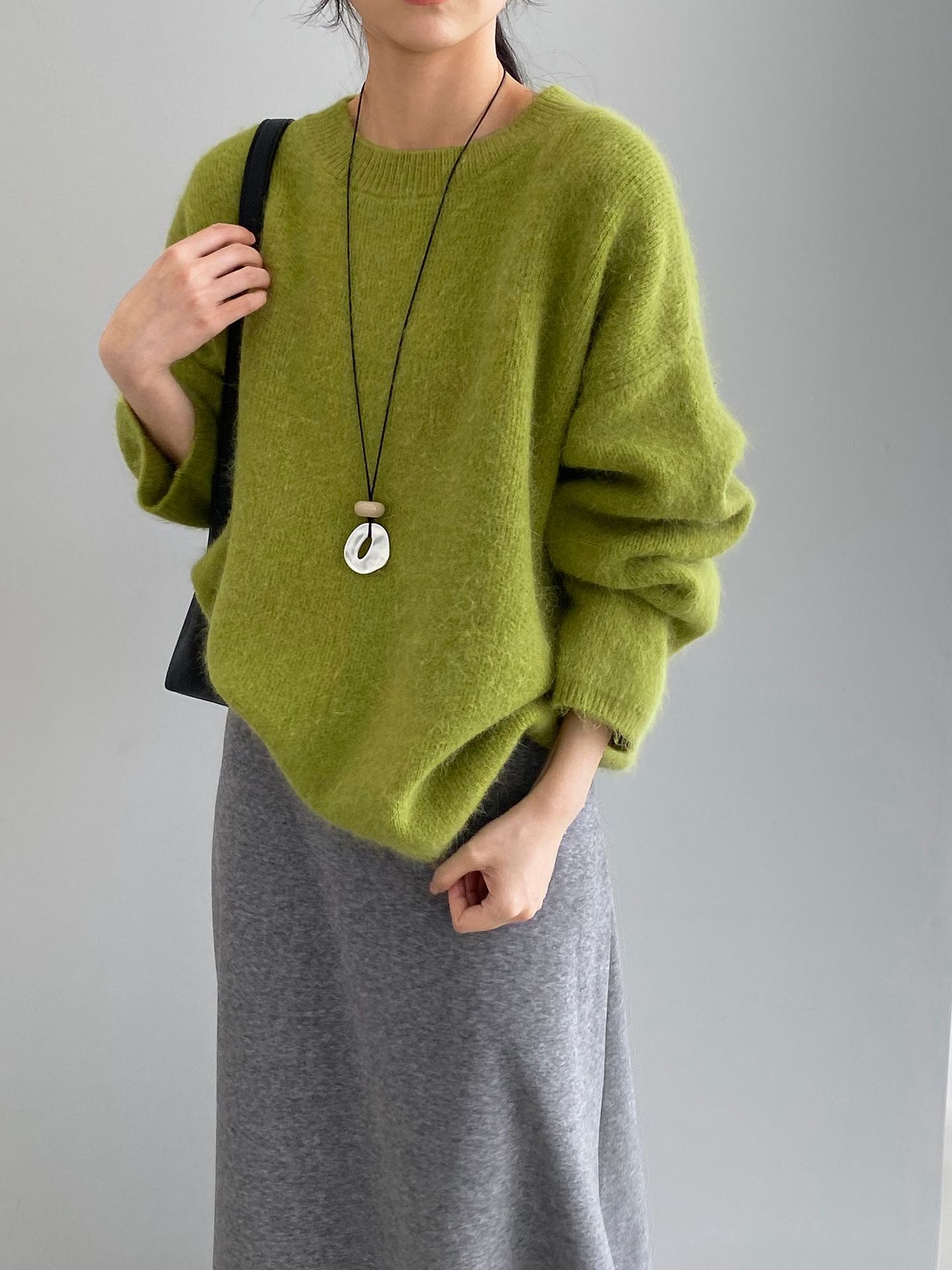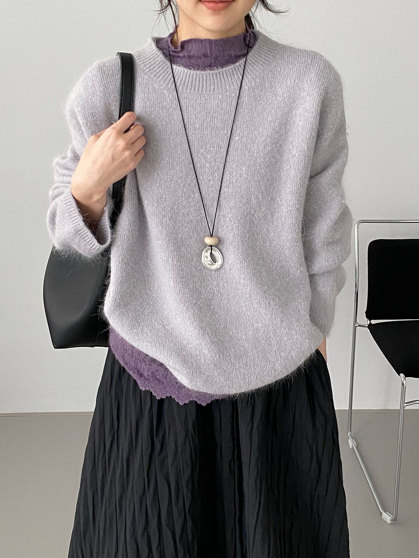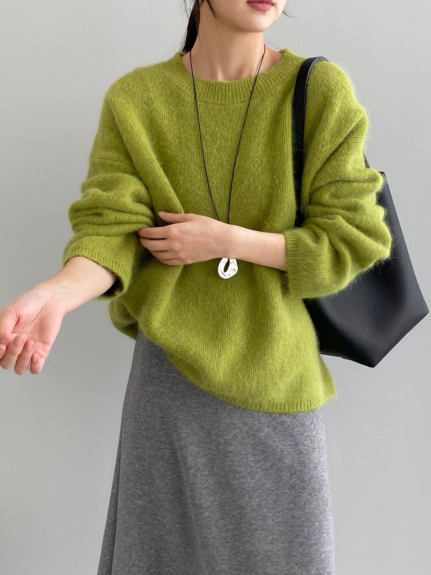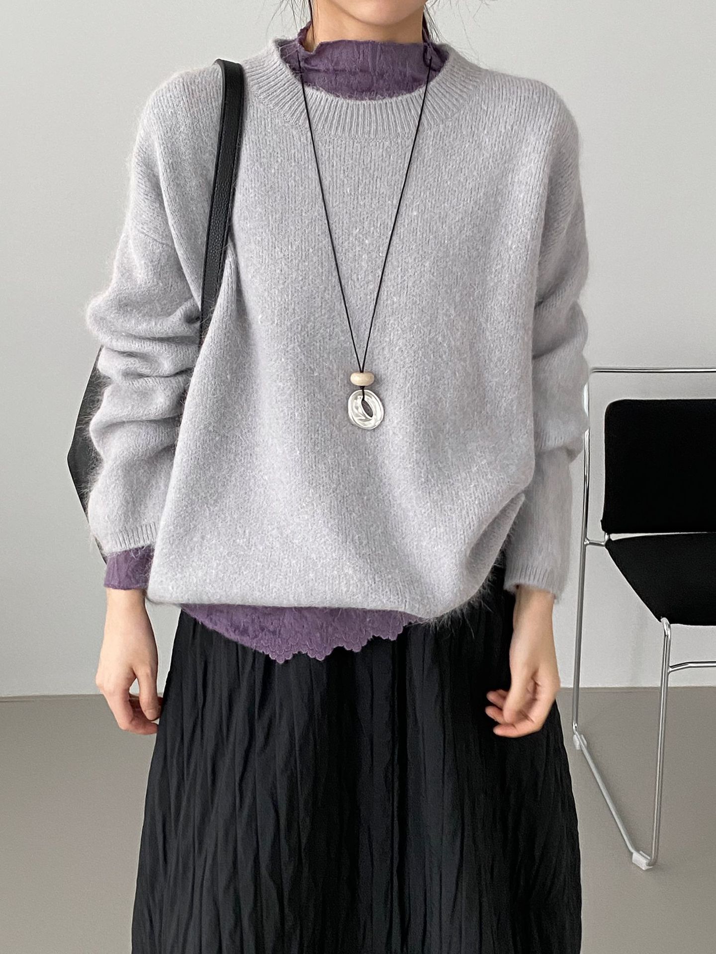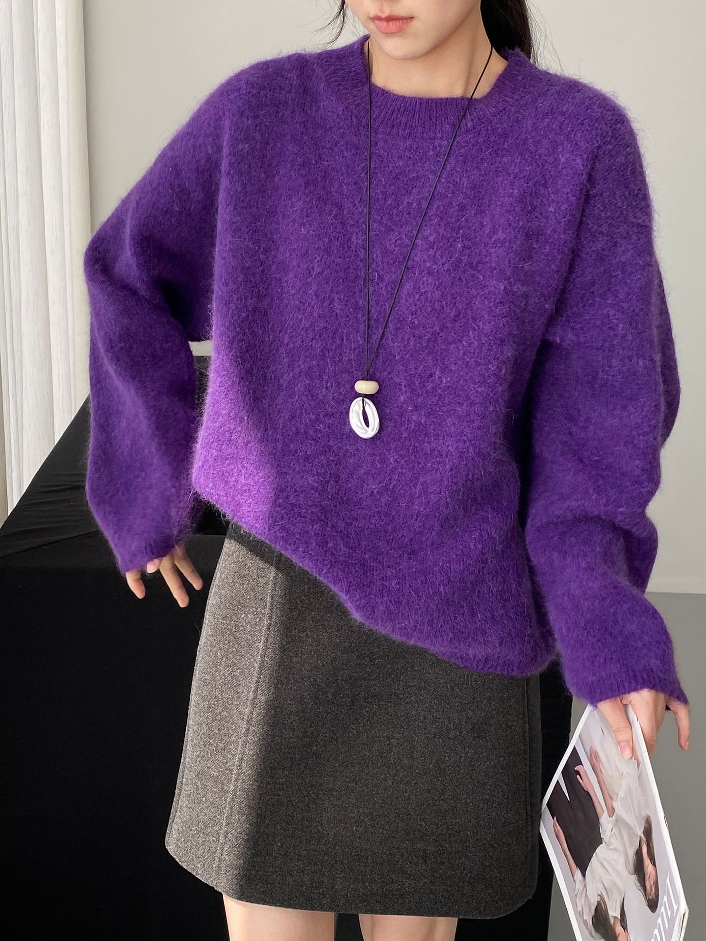 라운드 칼라에 나른한 쫄깃한 토끼털 스웨터 심플하고 루즈한 느낌의 여성 코리안 니트입니다