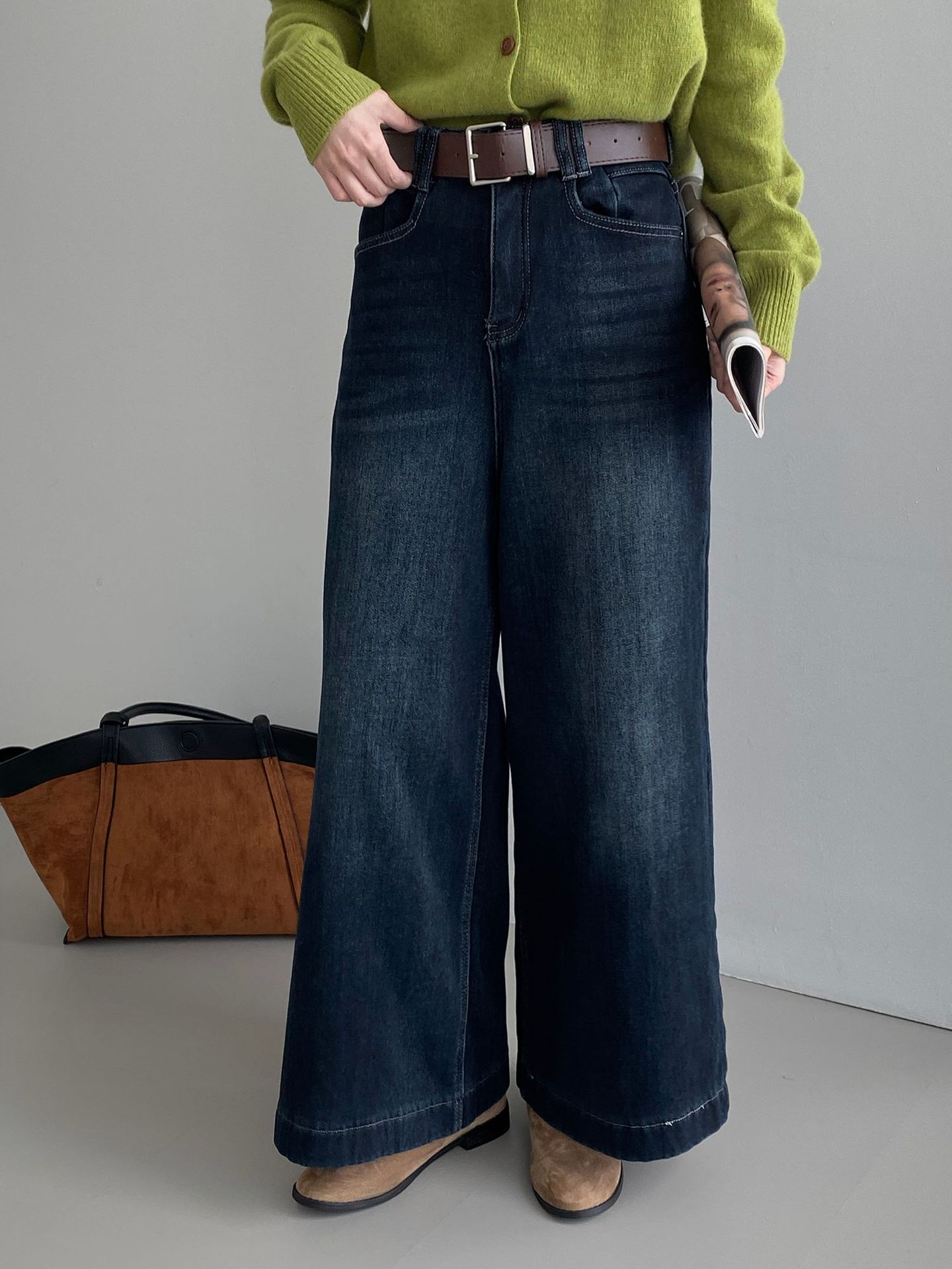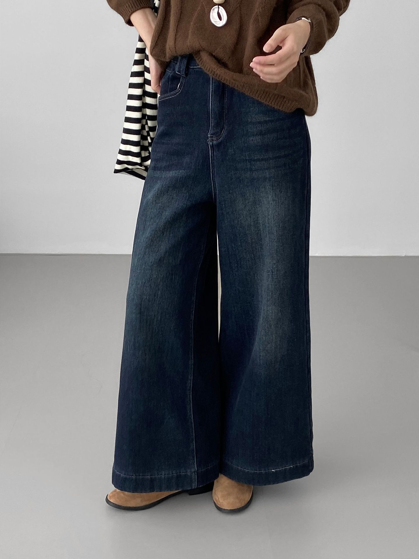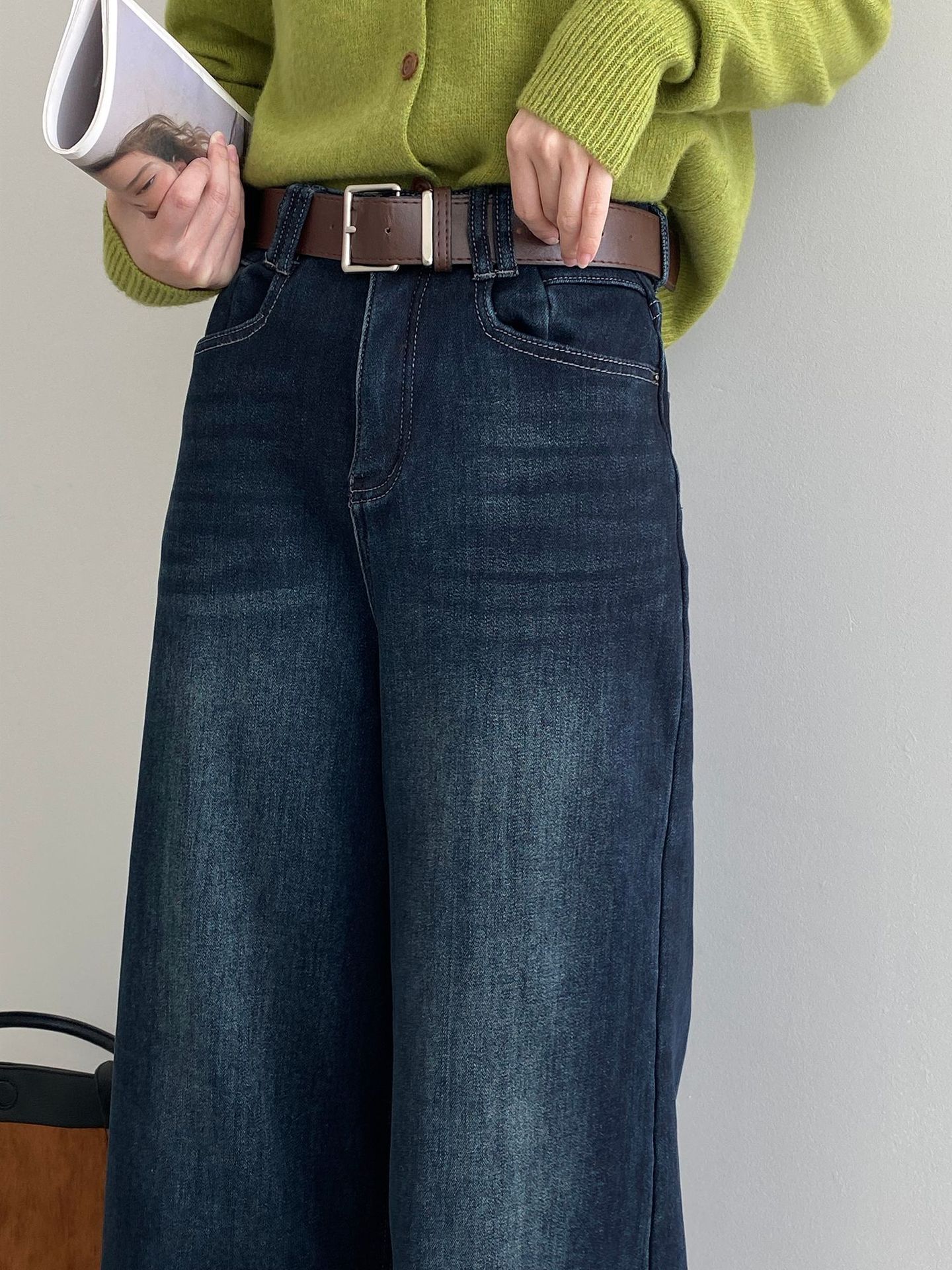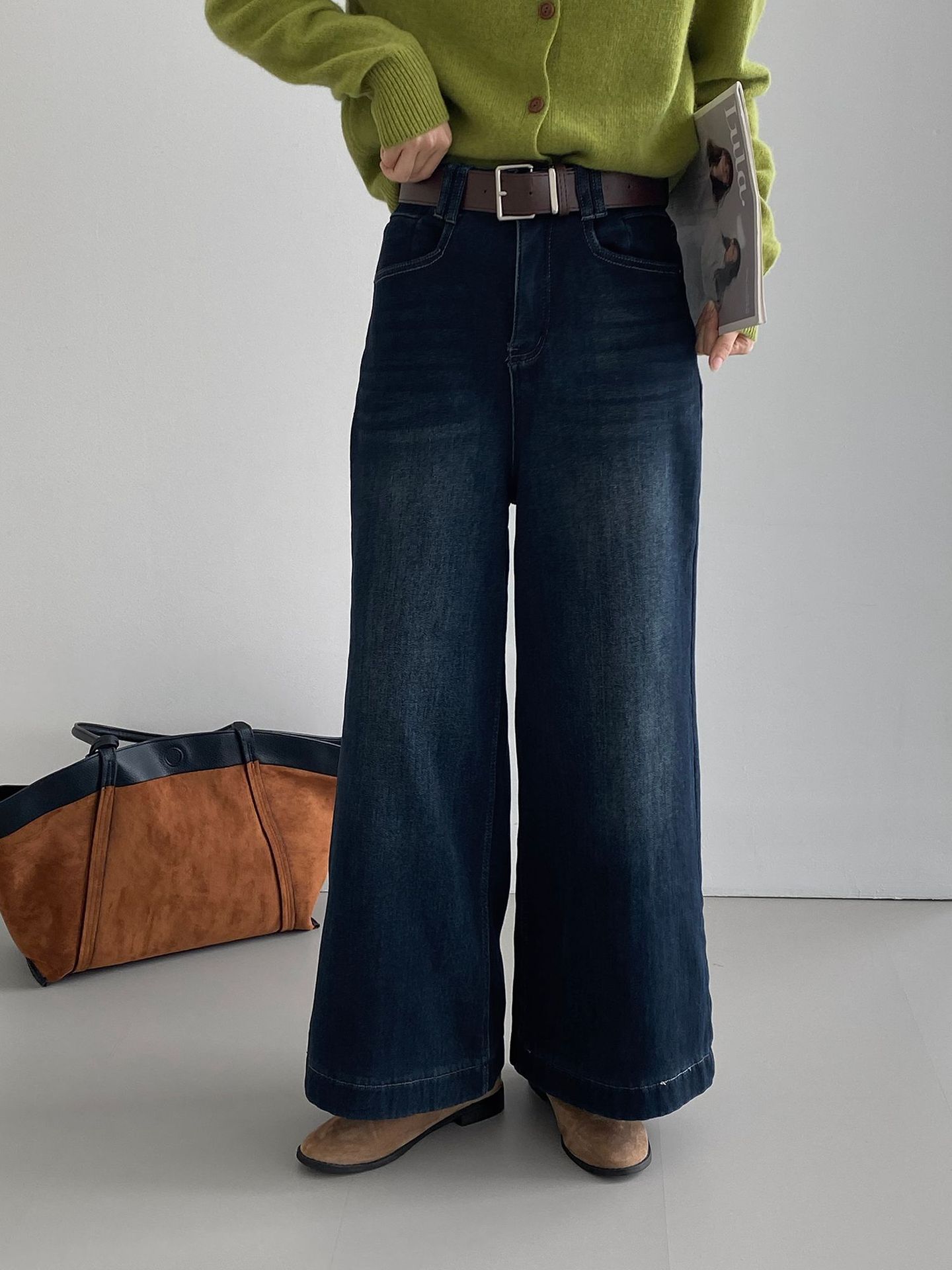 베이직 하이웨이스트 기모 도톰한 통 데님 여성 빈티지 캐주얼 롱 팬츠