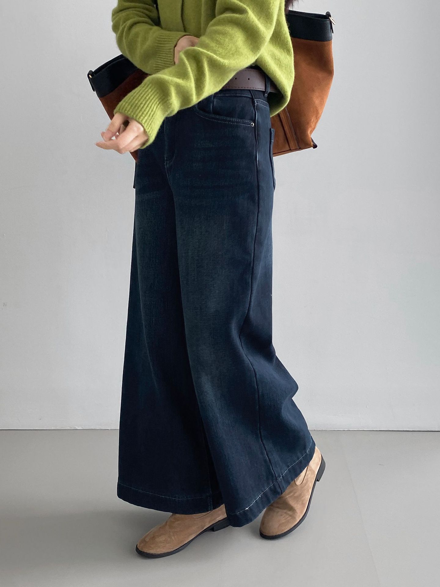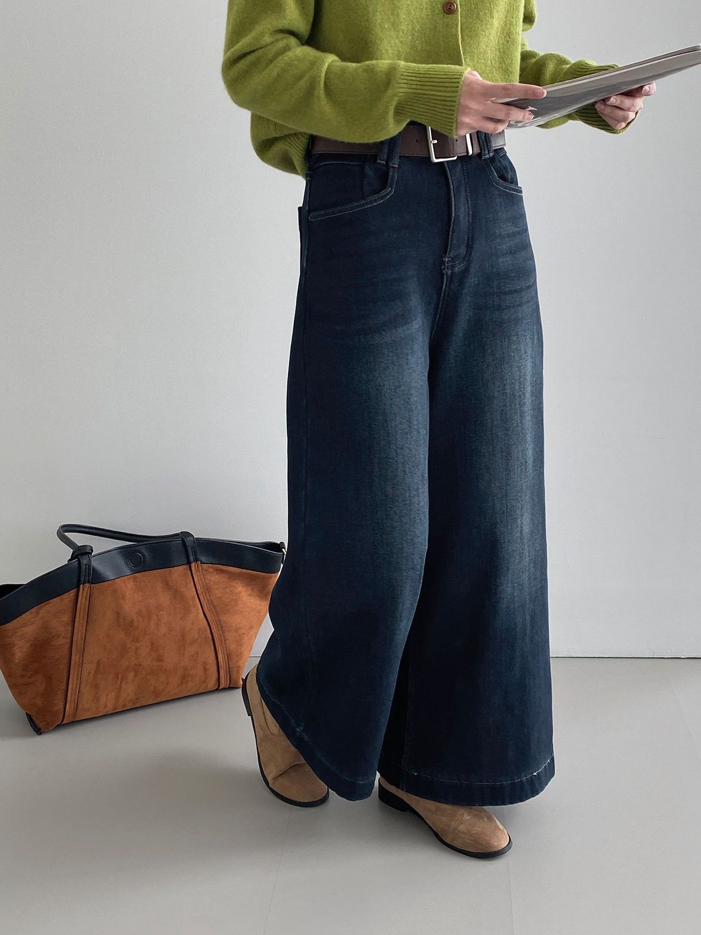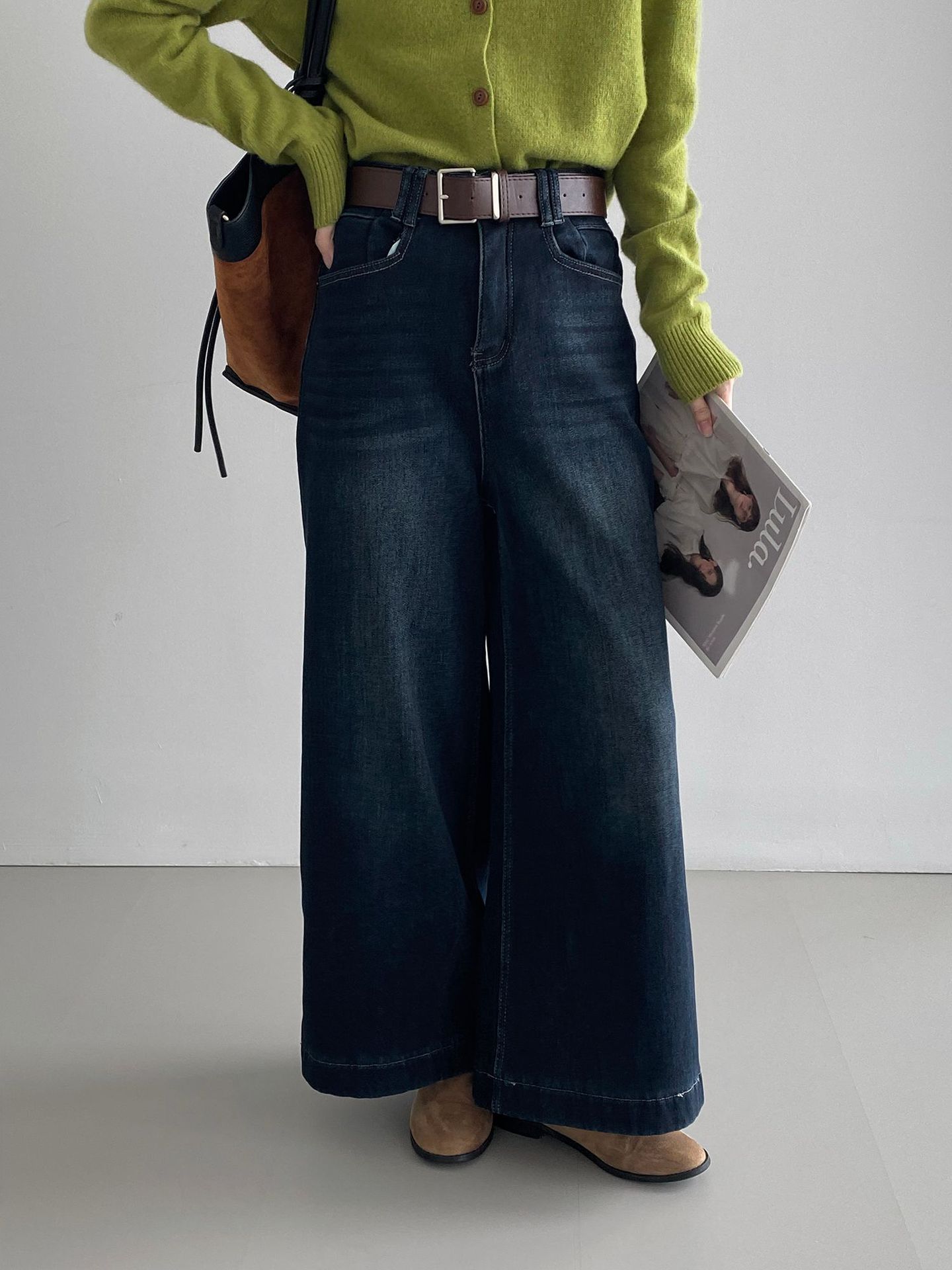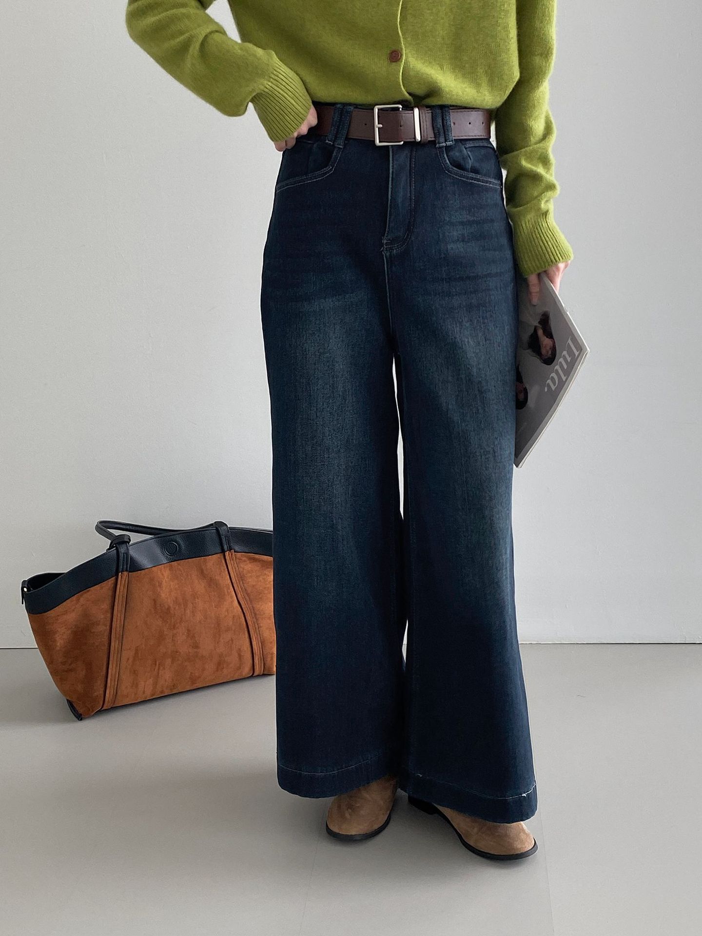 베이직 하이웨이스트 기모 도톰한 통 데님 여성 빈티지 캐주얼 롱 팬츠