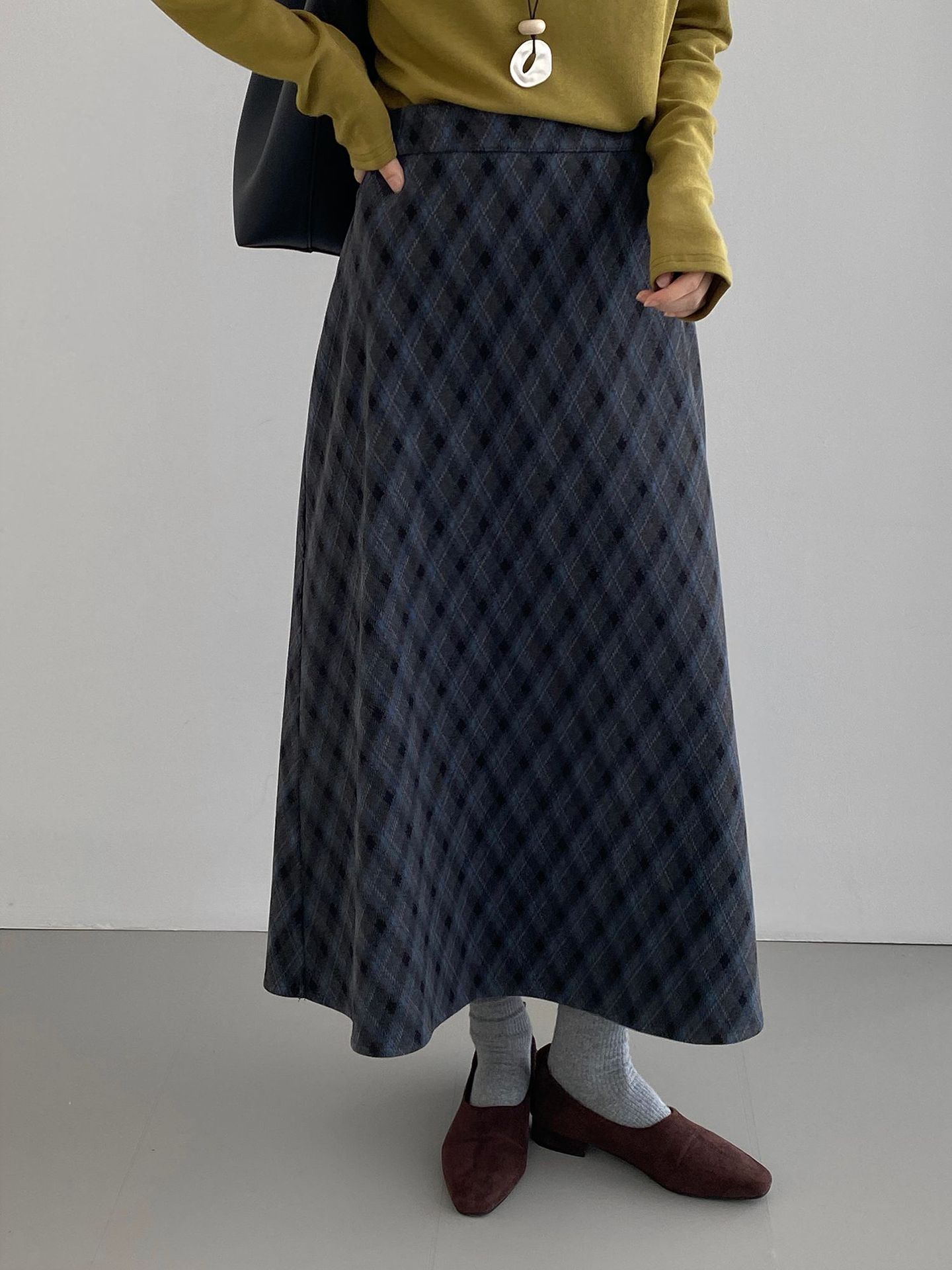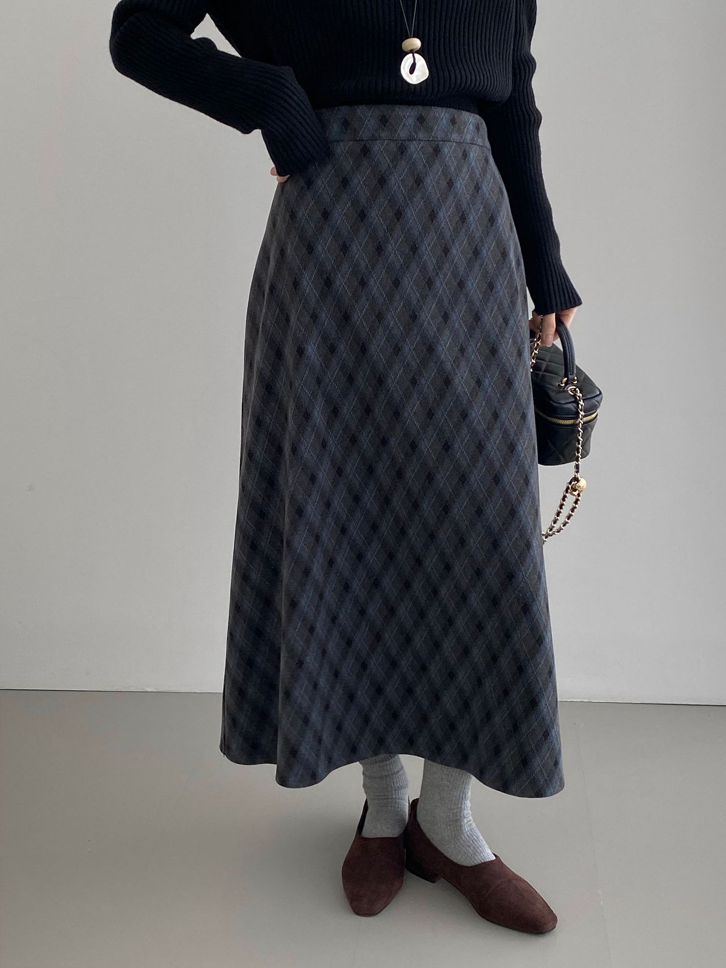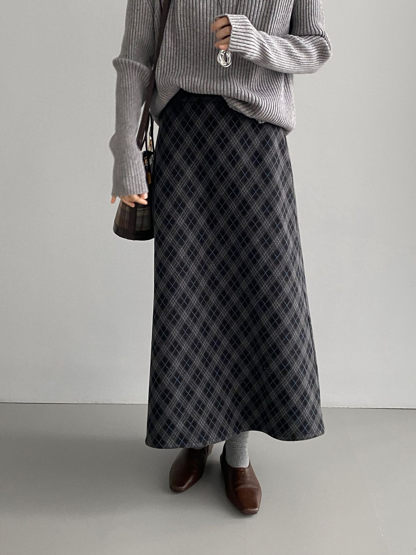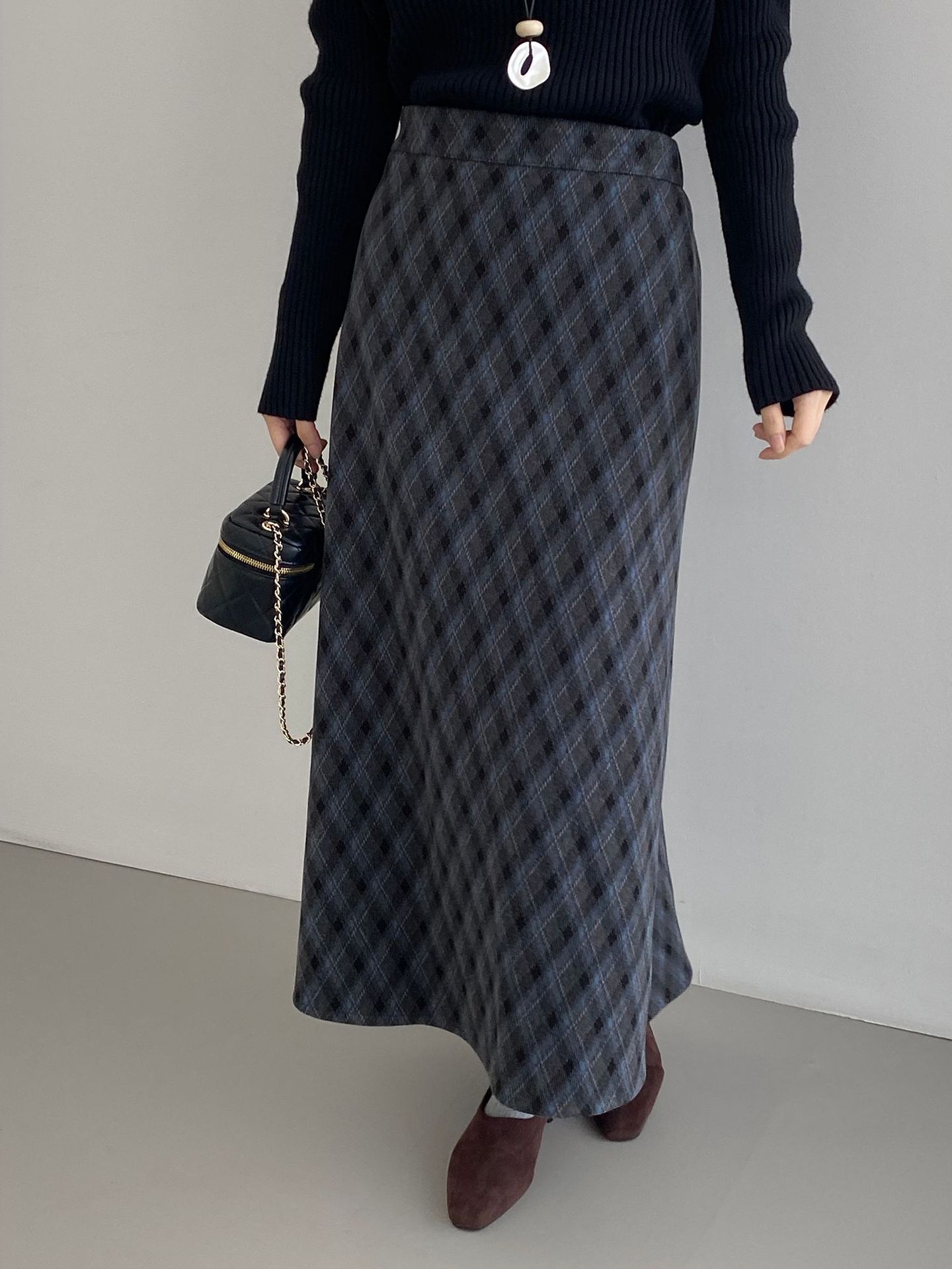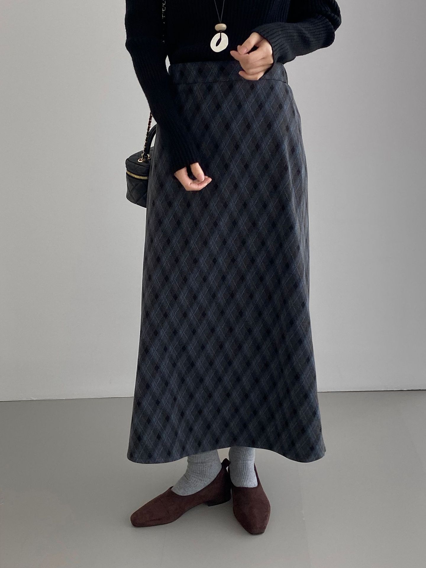 복고 학원 스타일 문예 격자무늬 충돌 스커트 여성 허리 밴딩 기질 날씬해 보이는 a 라인 롱 스커트