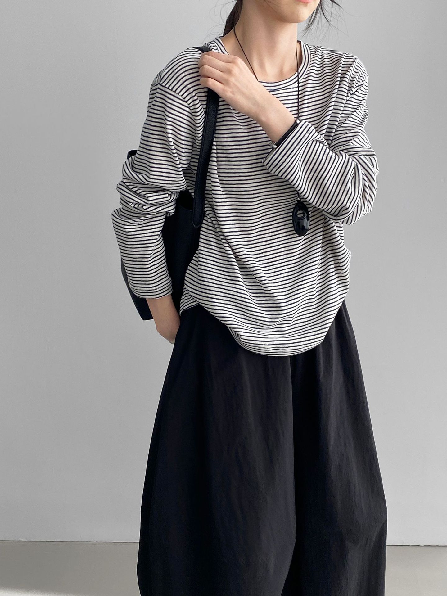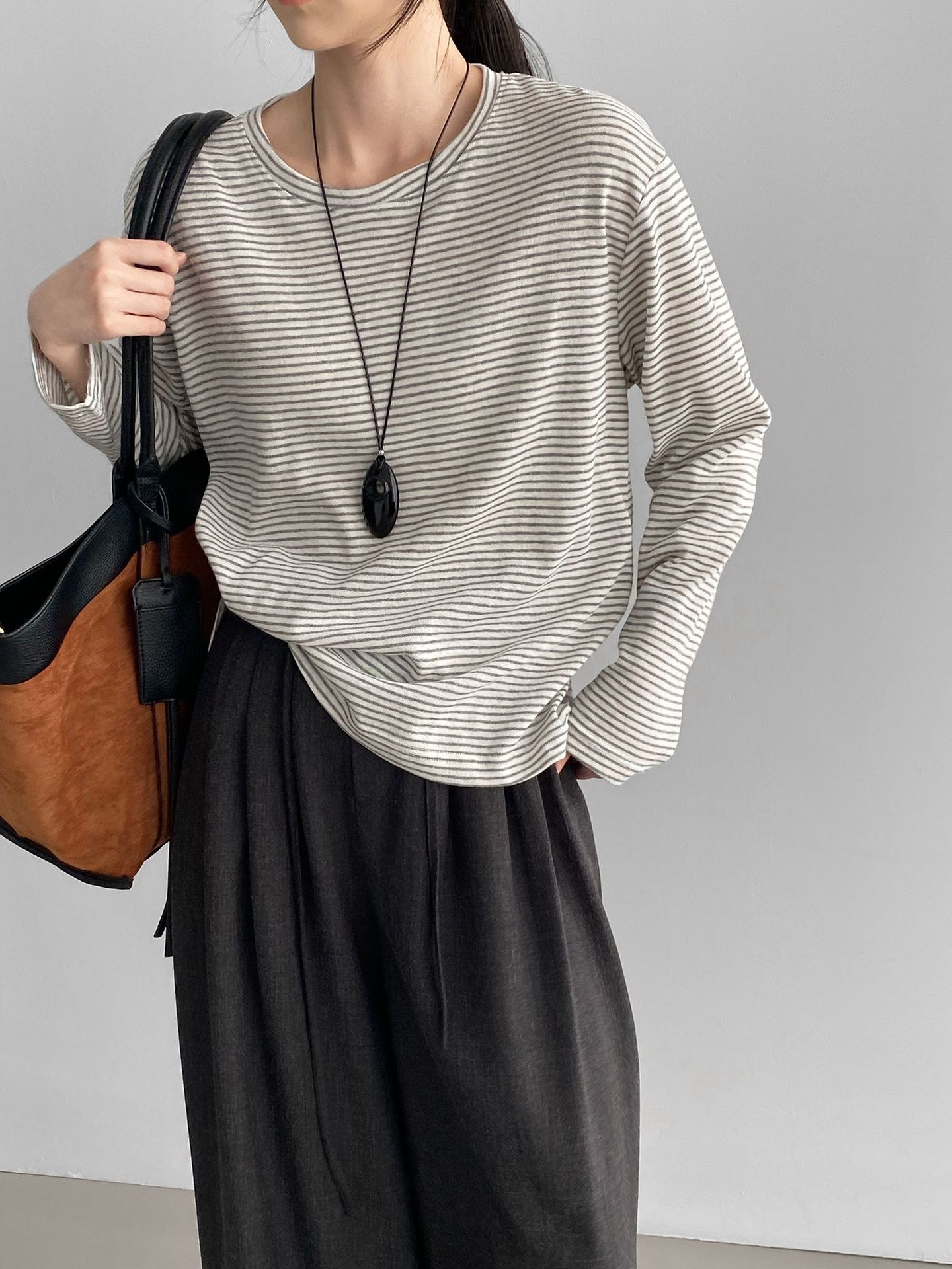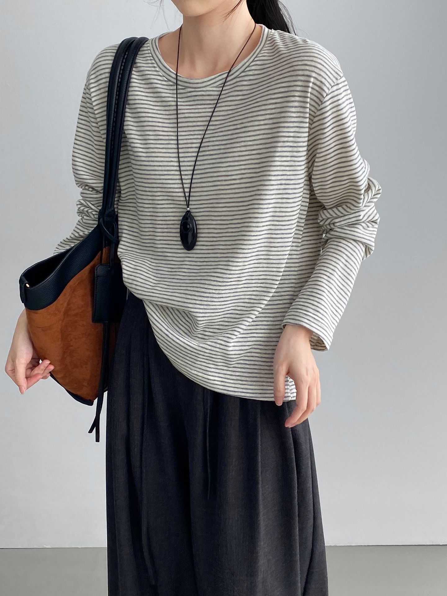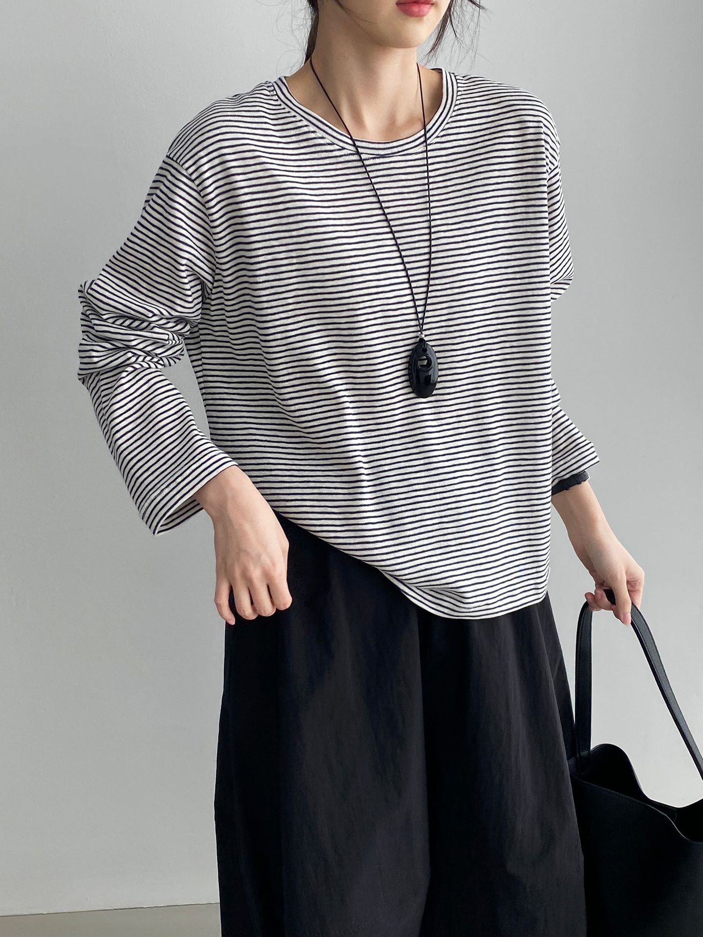 데일리룩은 크루넥 스트라이프 긴팔 티셔츠로 나른하고 캐주얼한 여성 상의와 매치하기 좋습니다