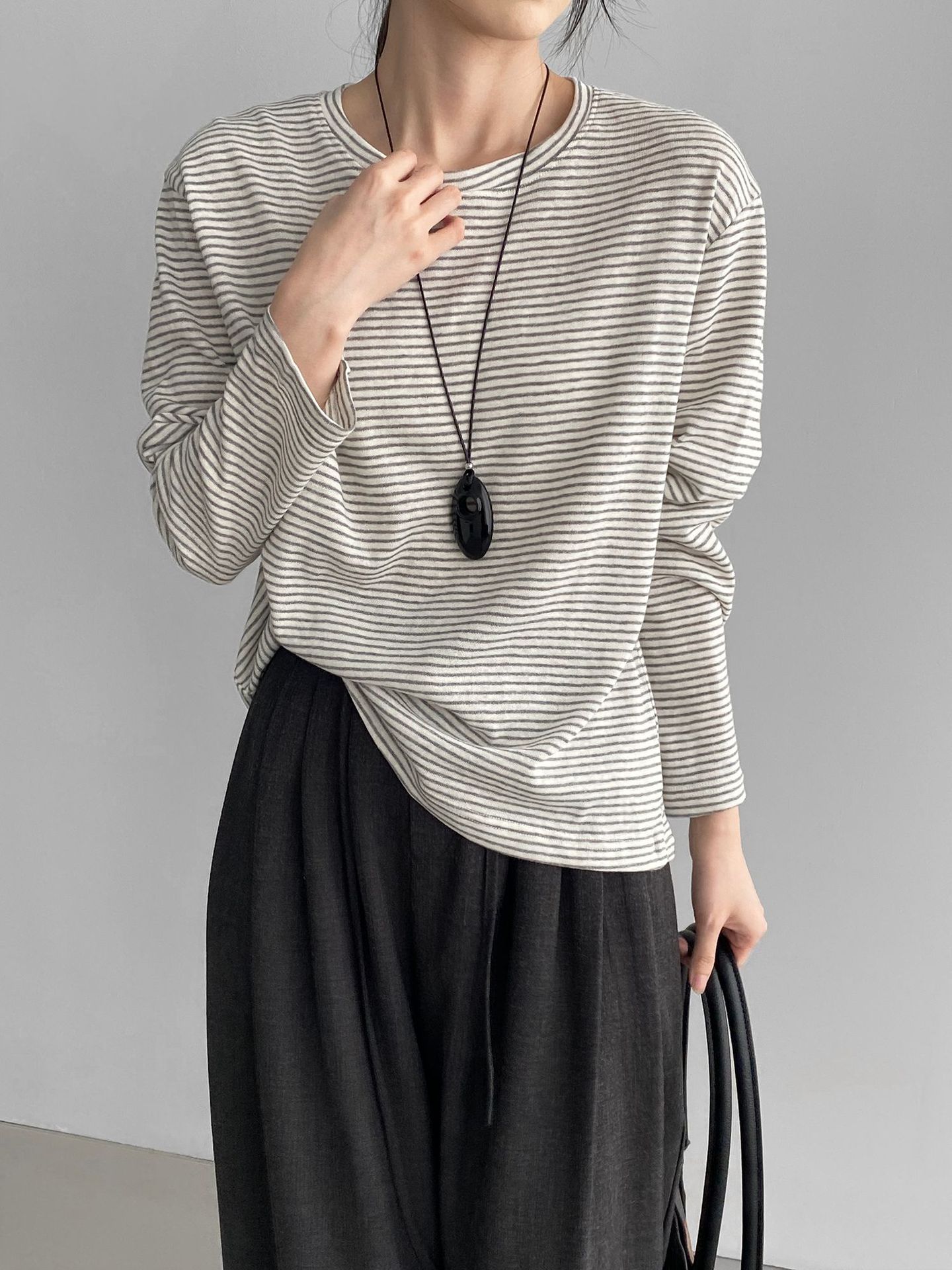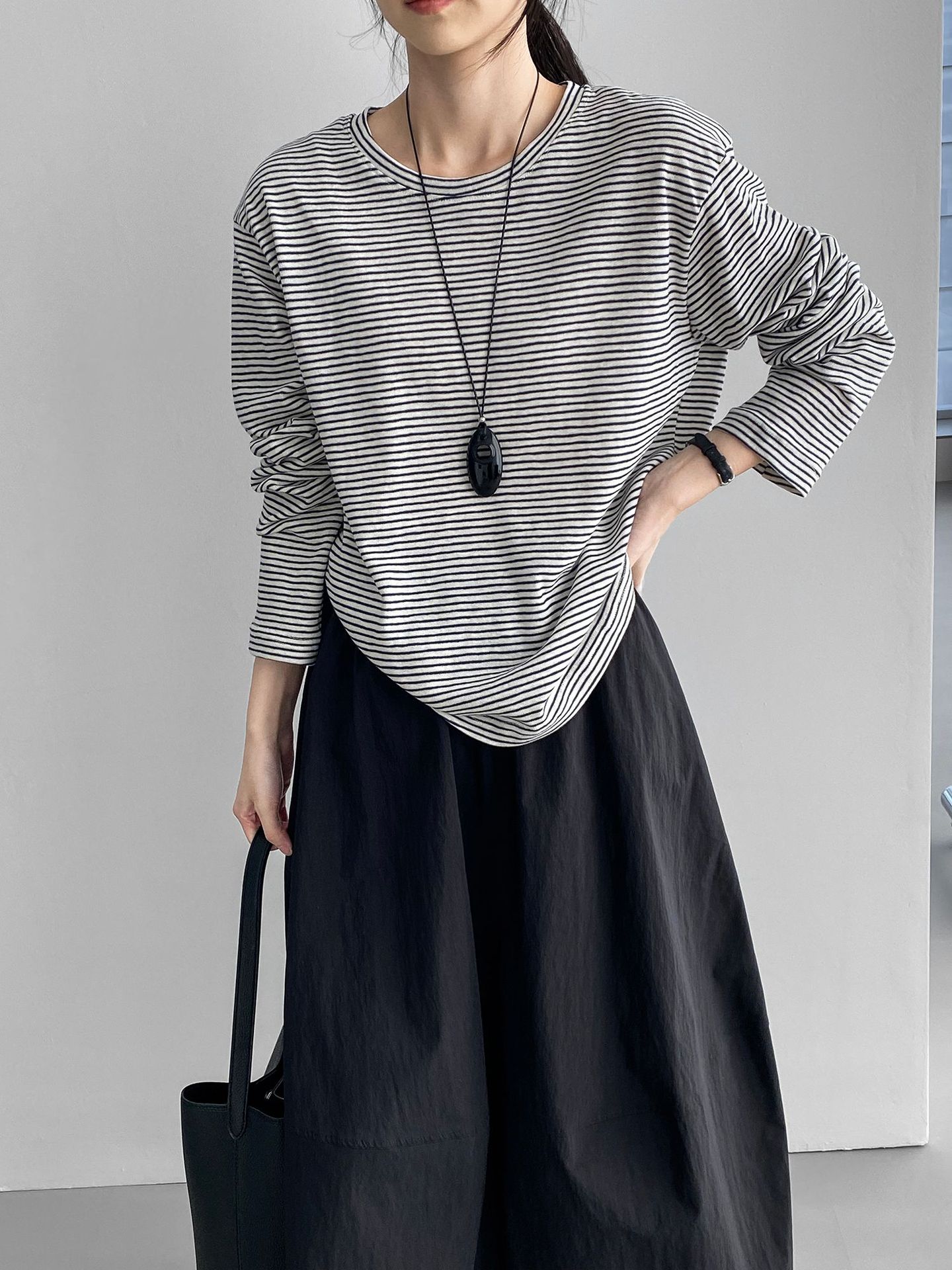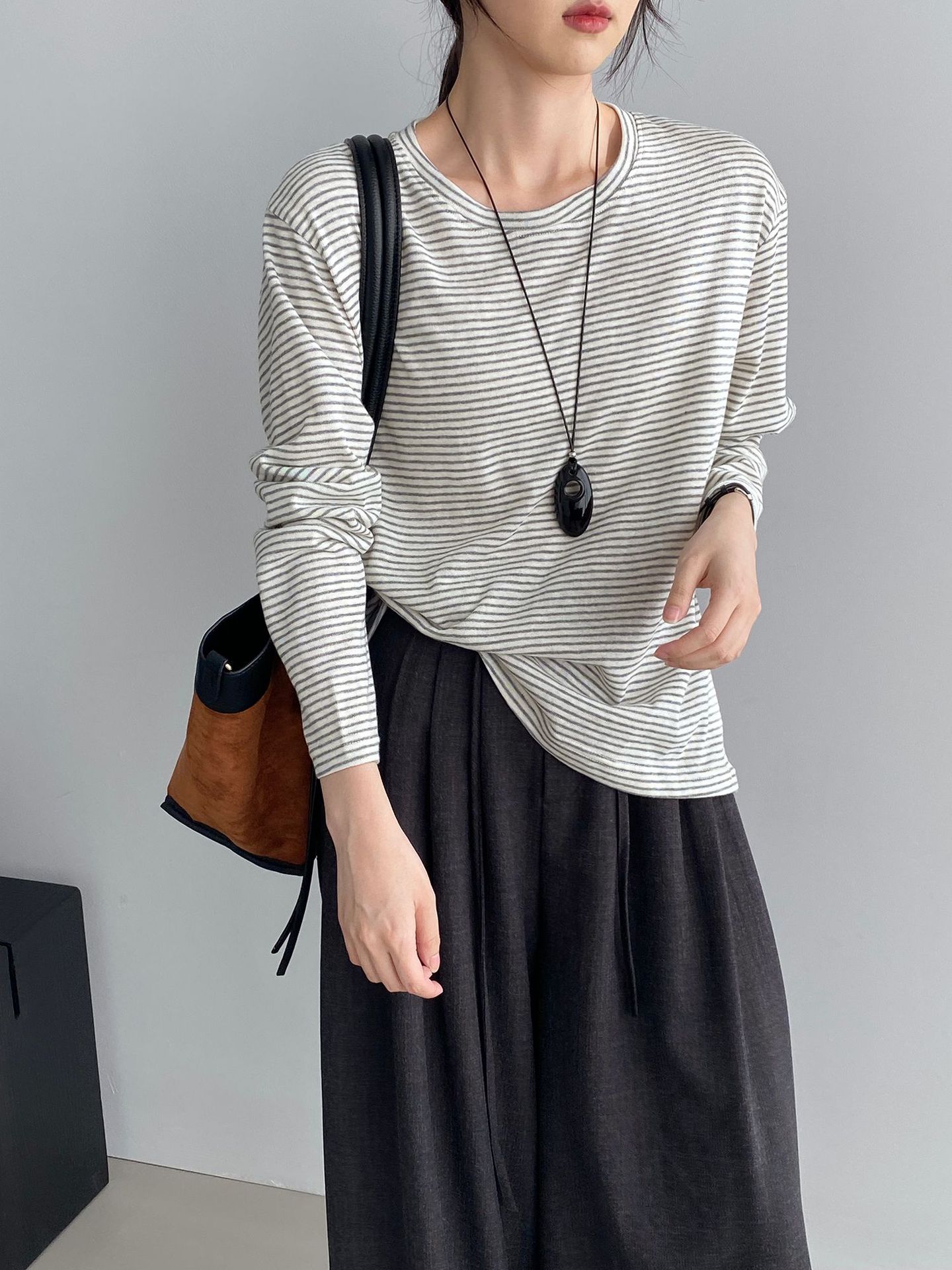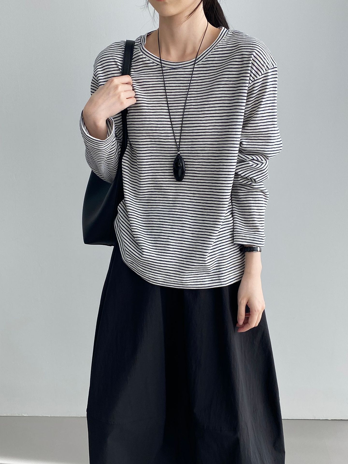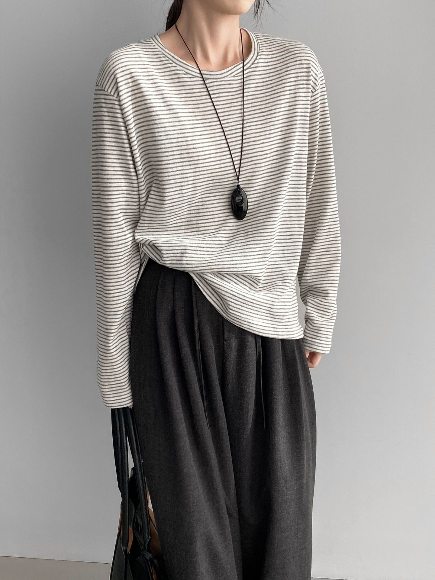 데일리룩은 크루넥 스트라이프 긴팔 티셔츠로 나른하고 캐주얼한 여성 상의와 매치하기 좋습니다