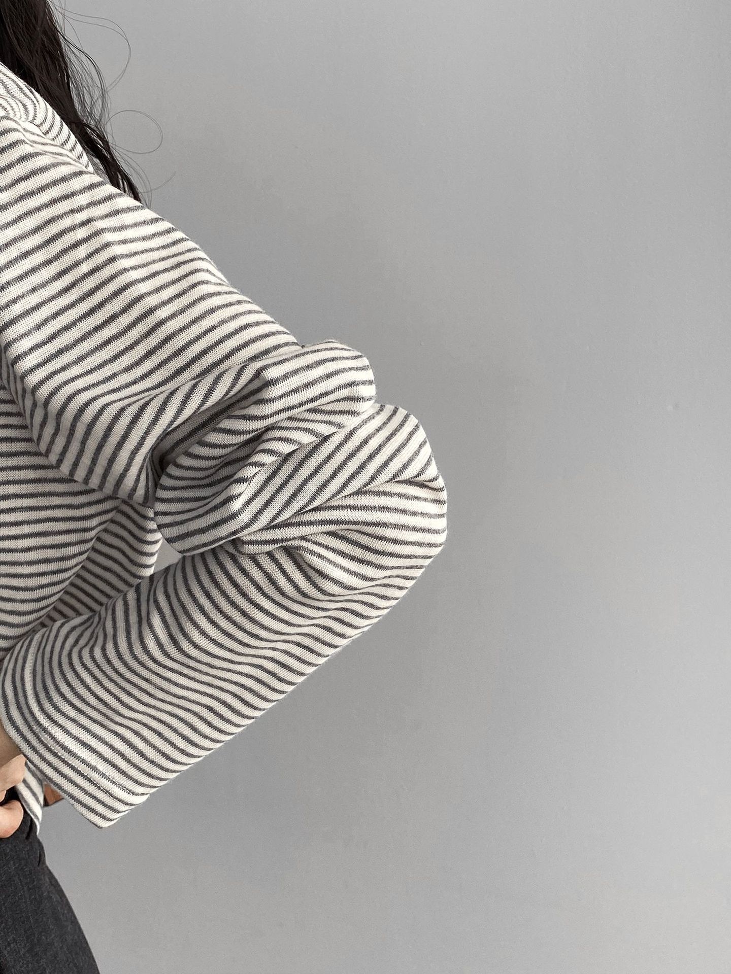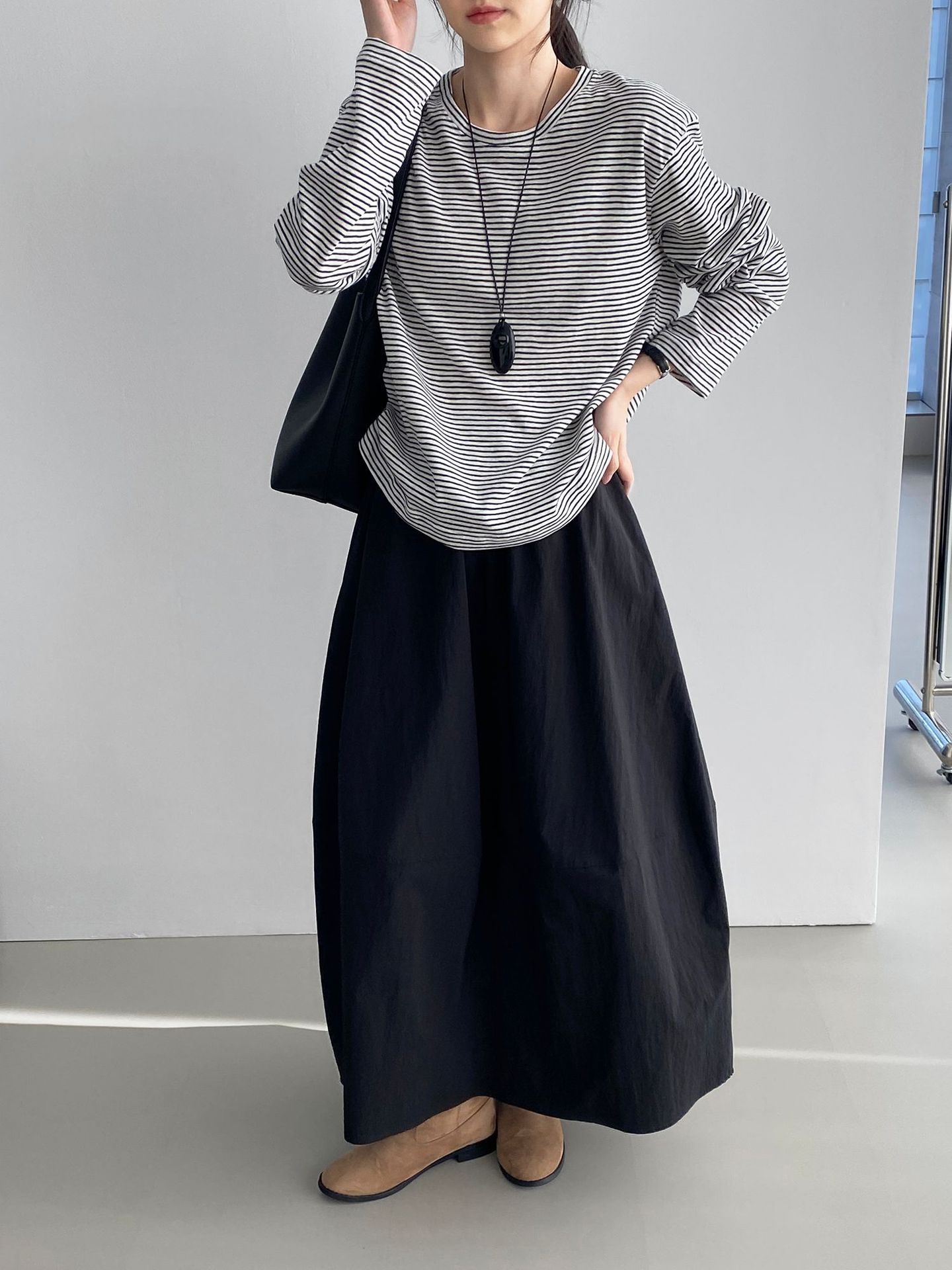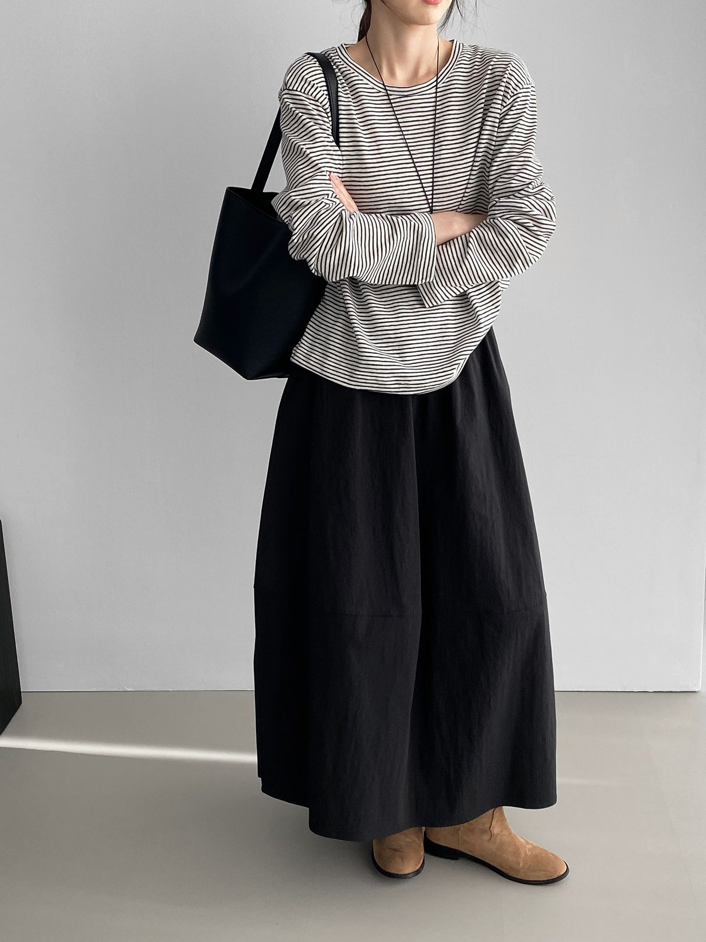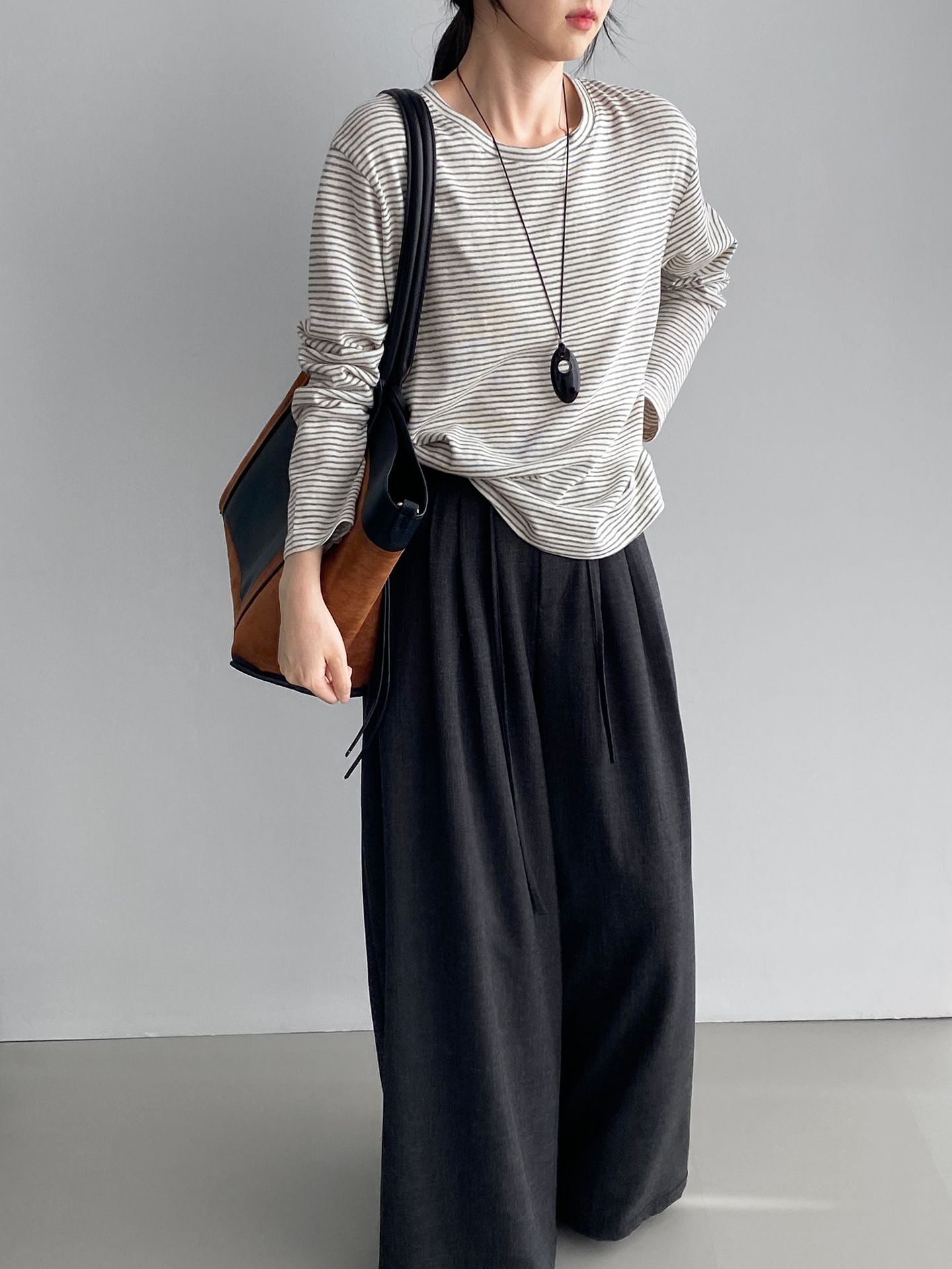 데일리룩은 크루넥 스트라이프 긴팔 티셔츠로 나른하고 캐주얼한 여성 상의와 매치하기 좋습니다