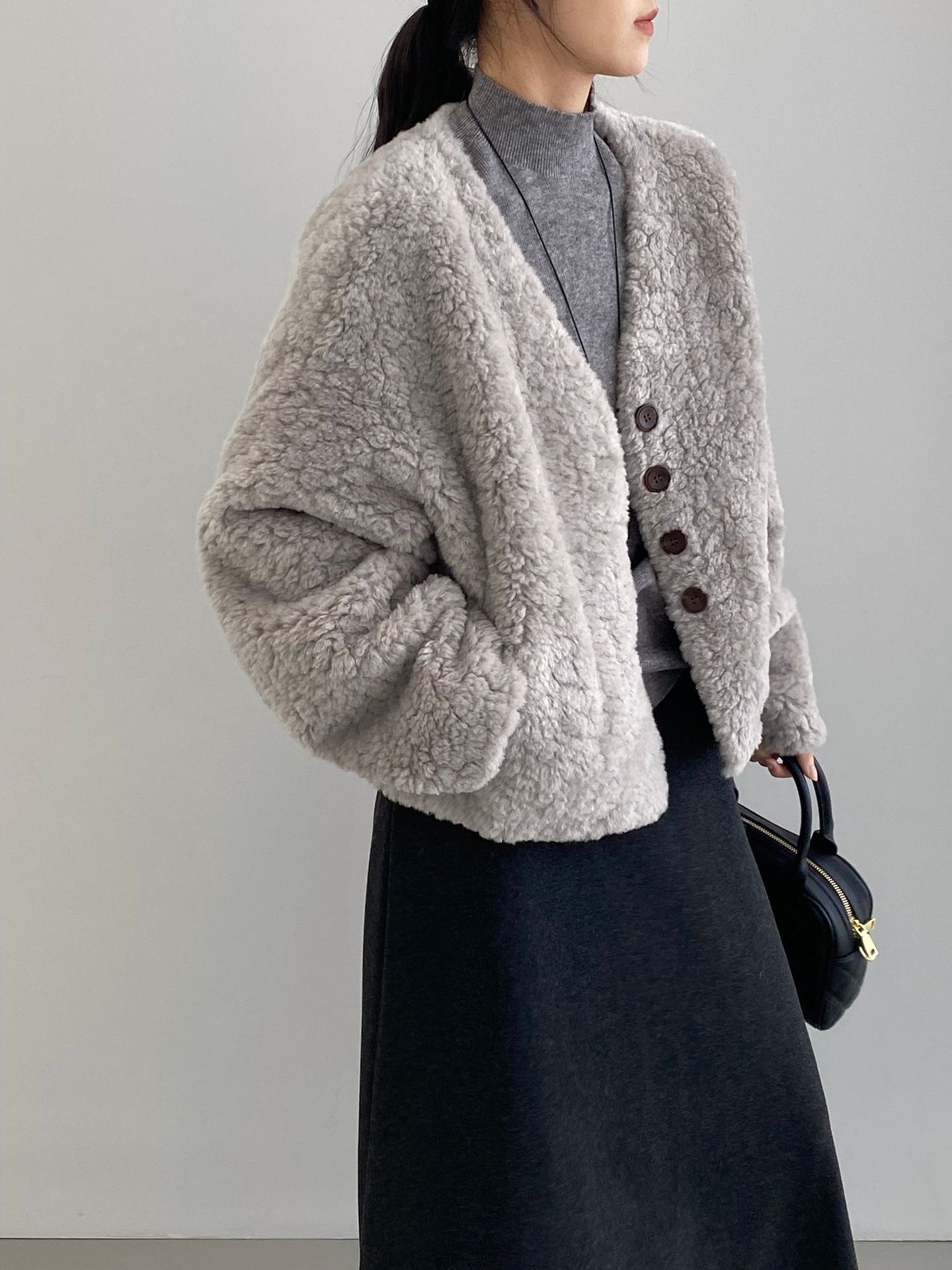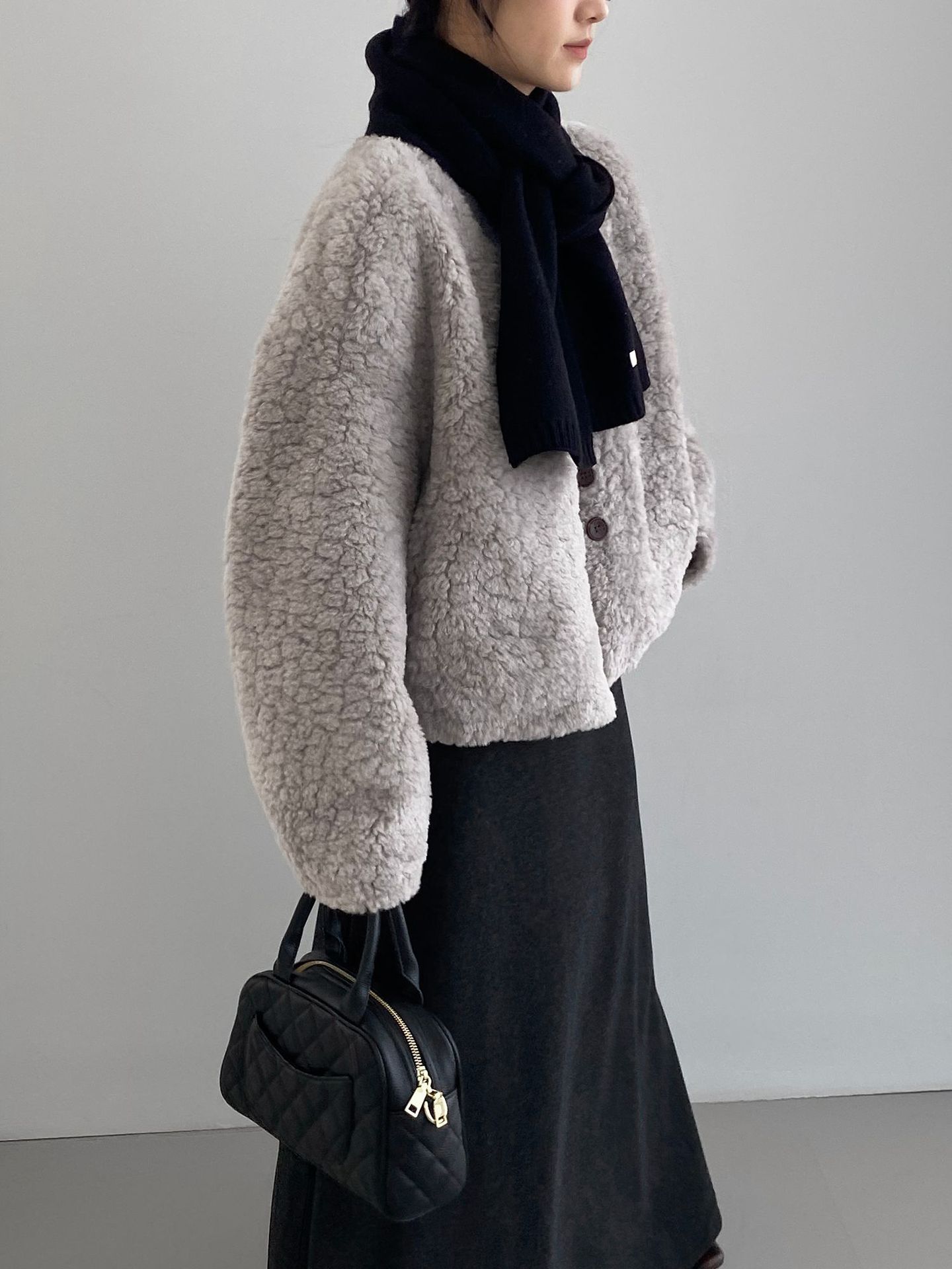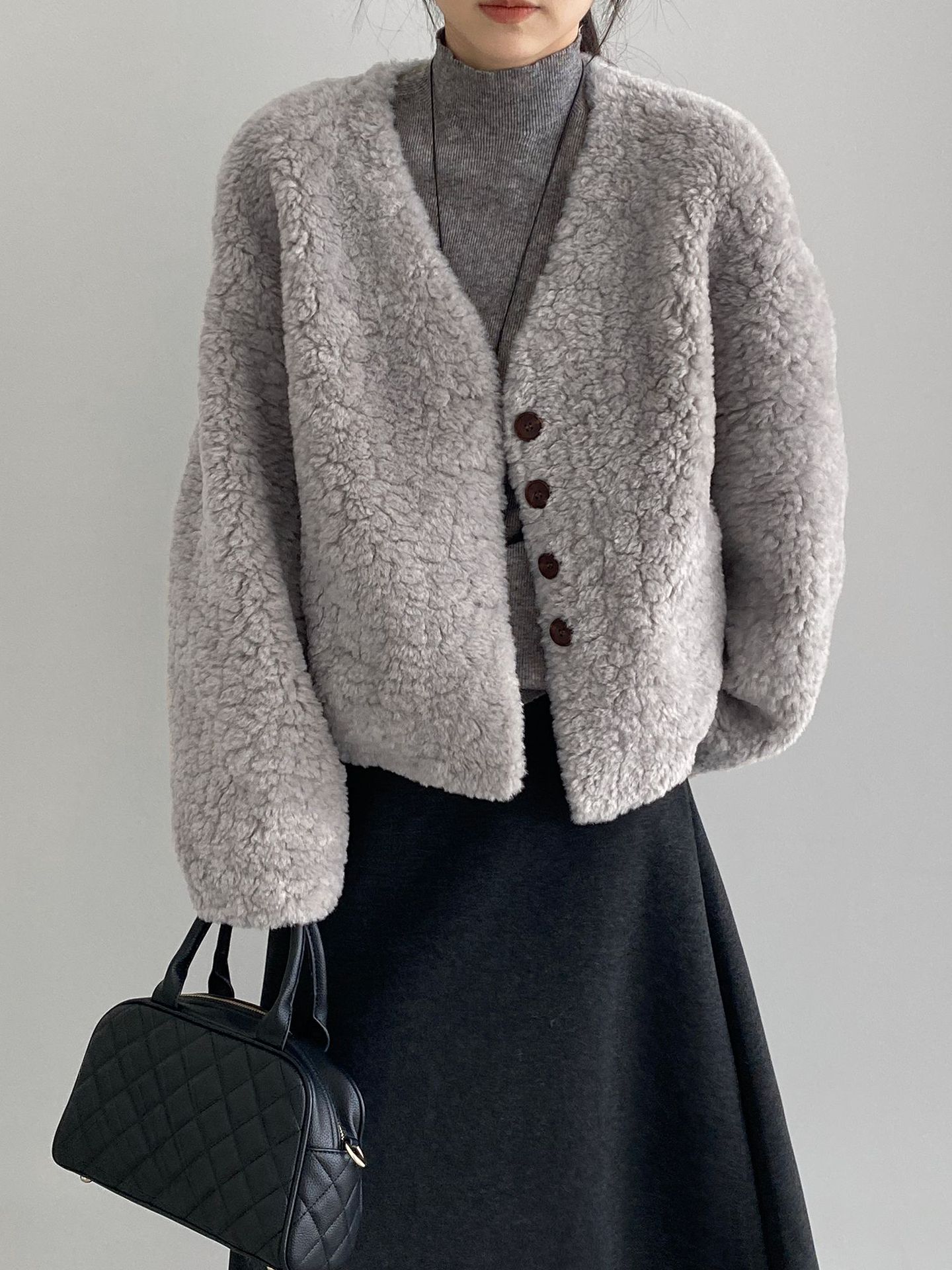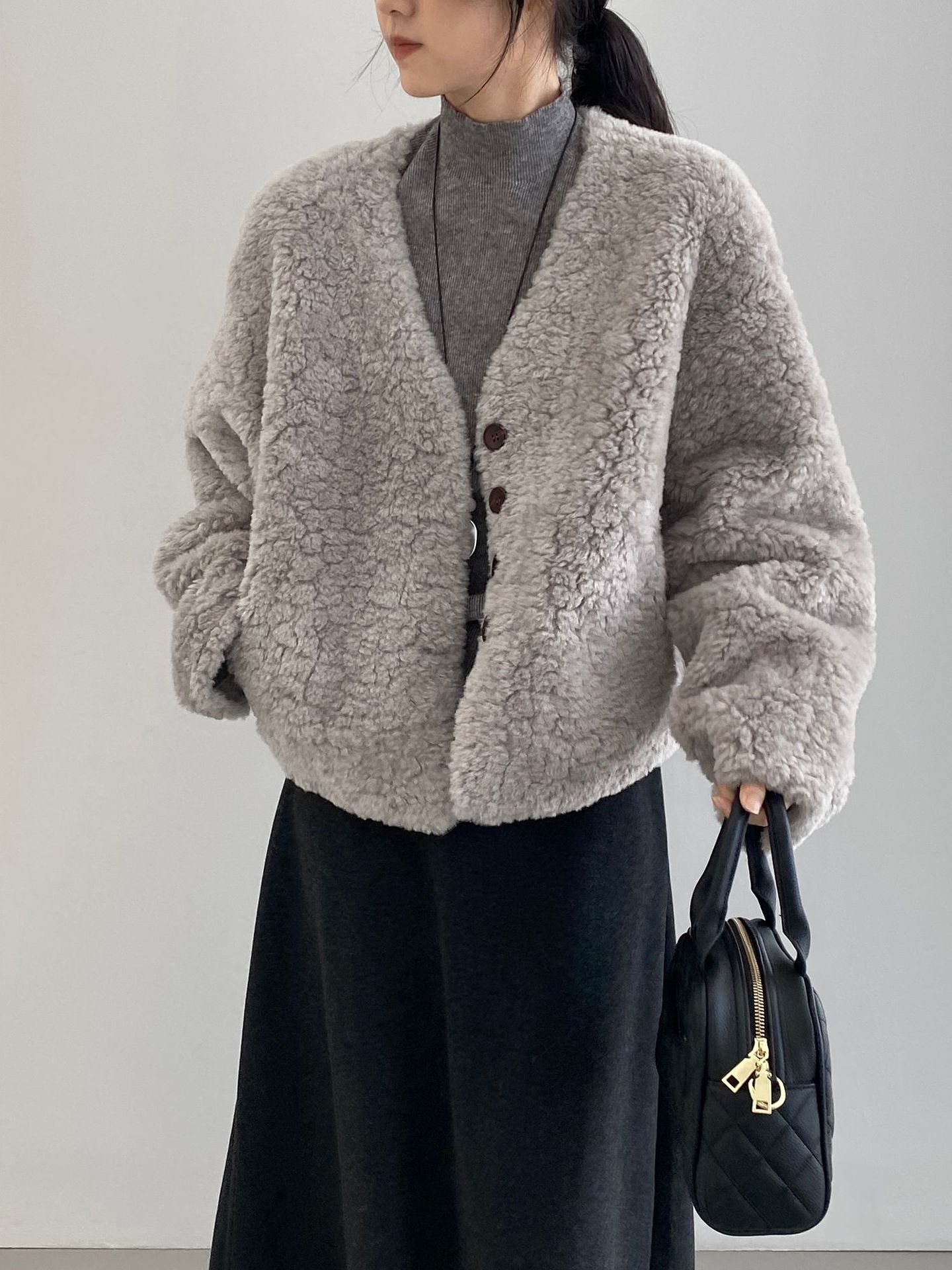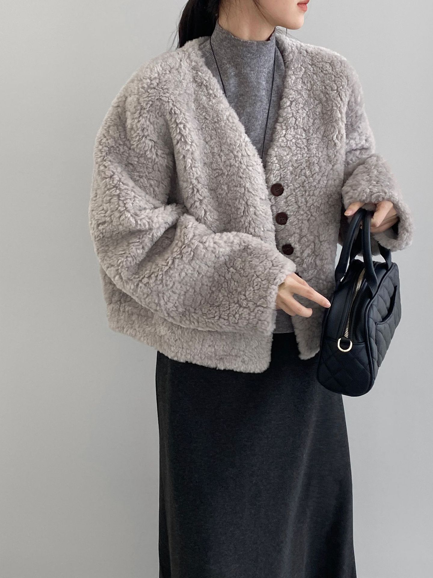 겨울 나른한 느낌의 퍼 코트입니다. 여성 솔리드 브이넥 싱글 버튼 쇼트 퍼 일체형 탑입니다