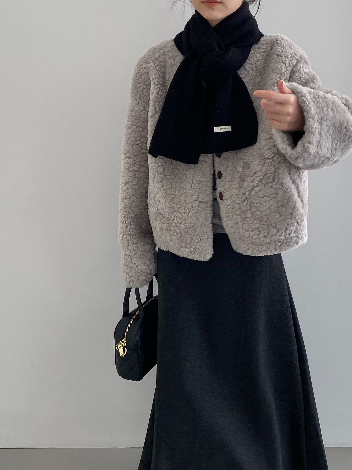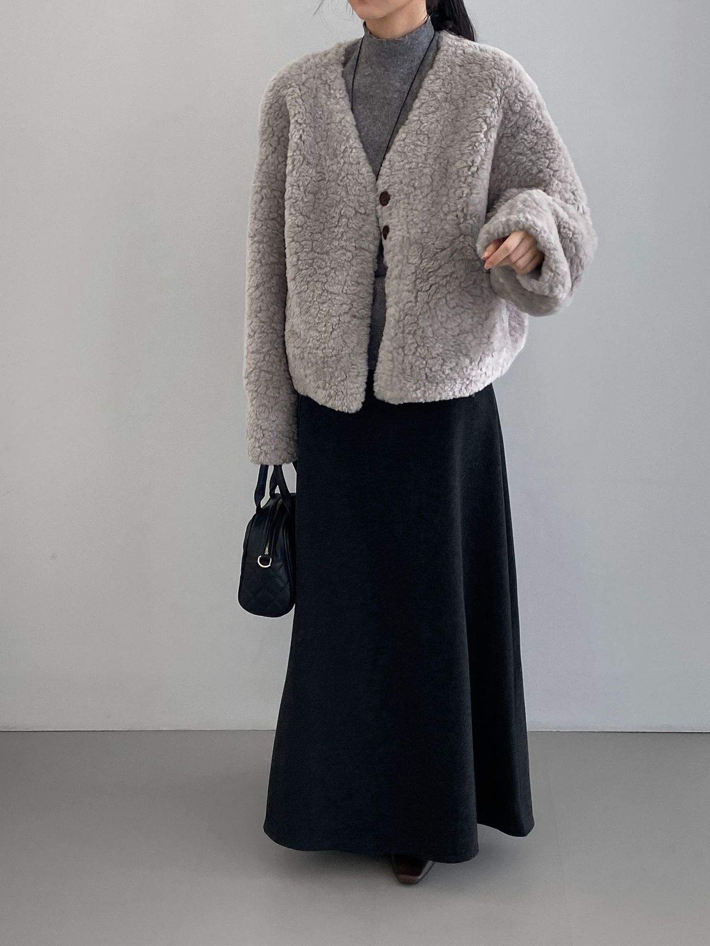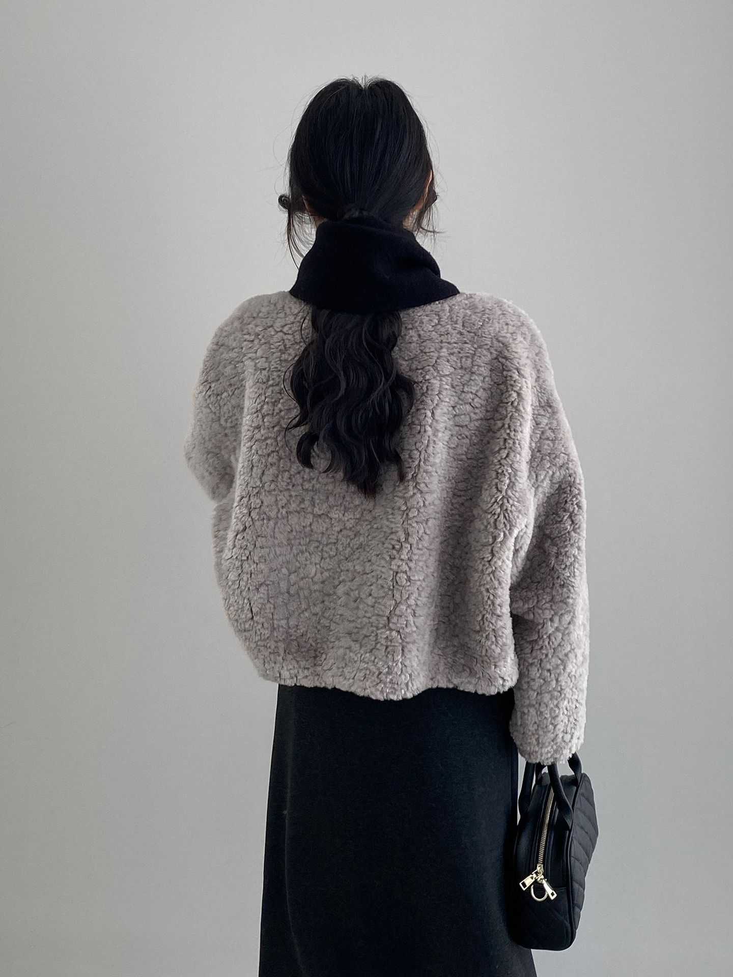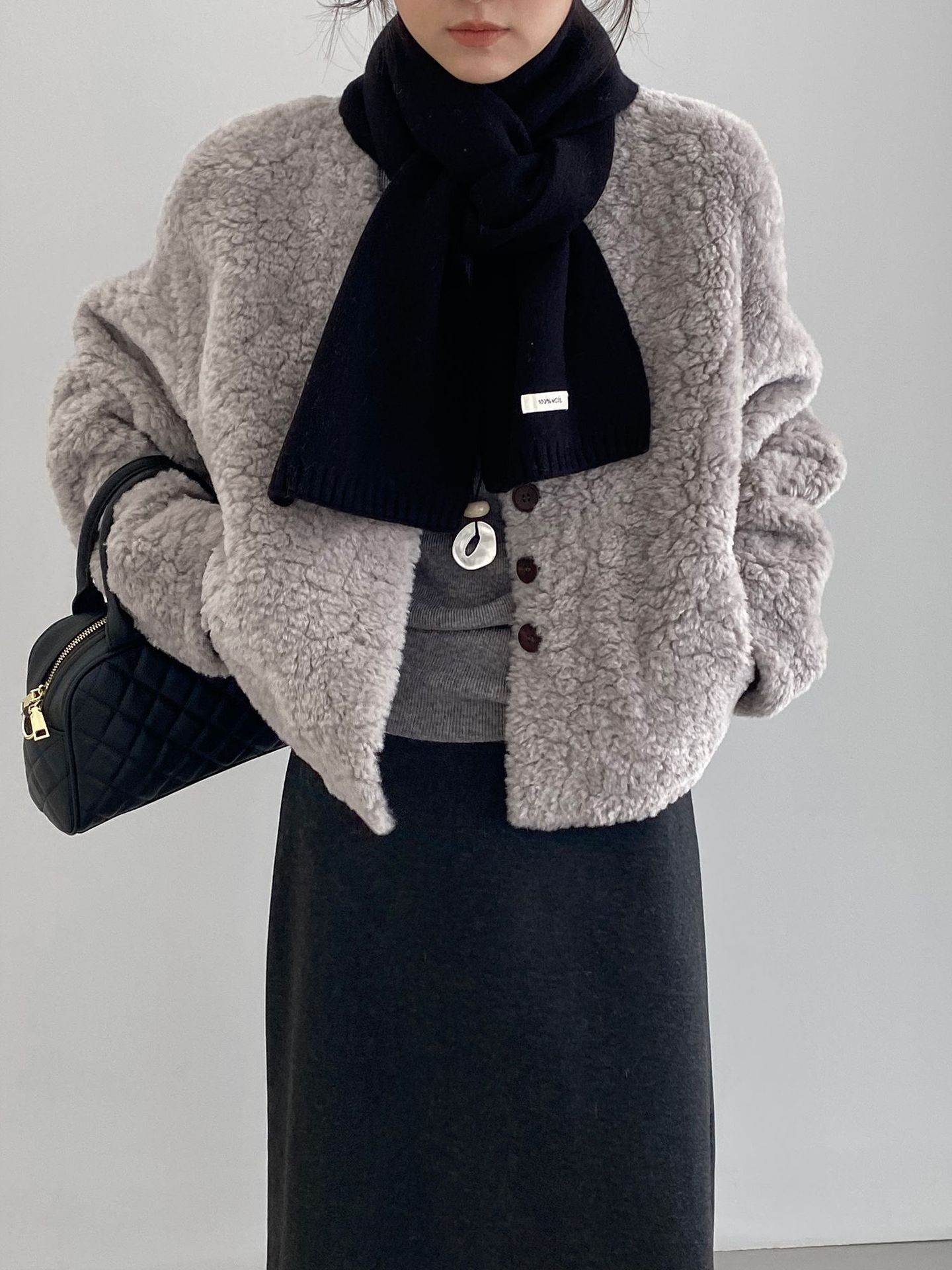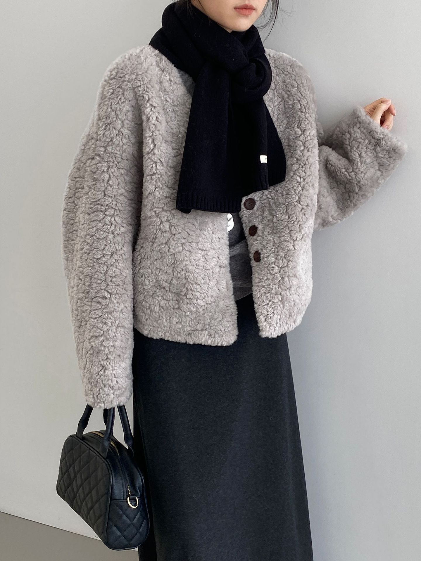 겨울 나른한 느낌의 퍼 코트입니다. 여성 솔리드 브이넥 싱글 버튼 쇼트 퍼 일체형 탑입니다