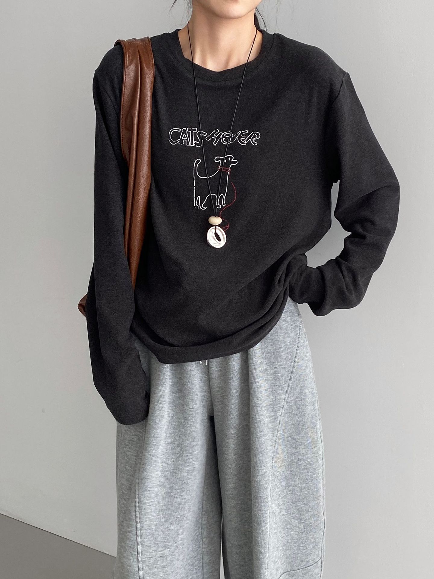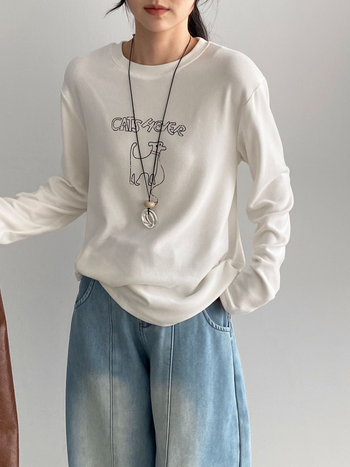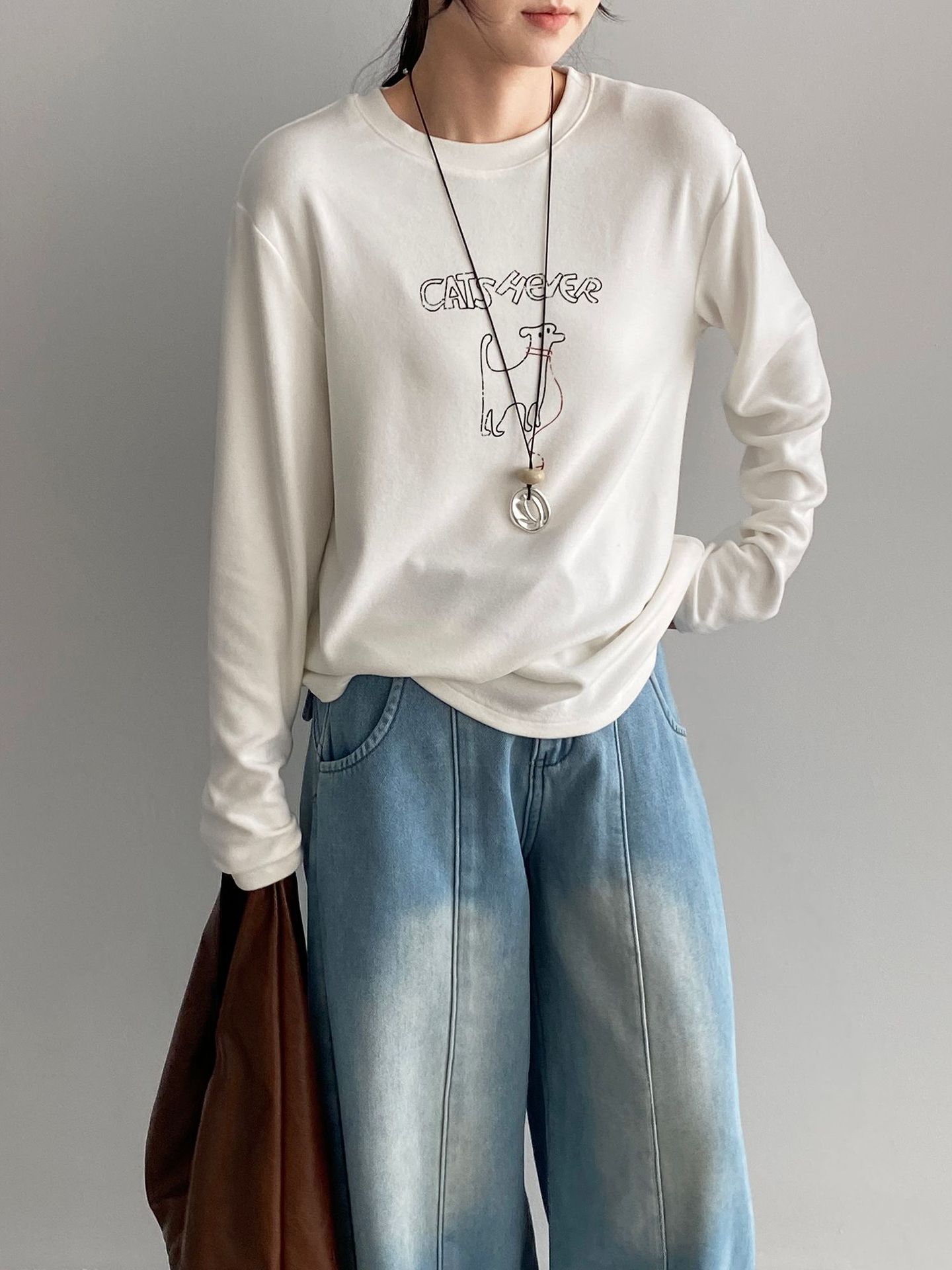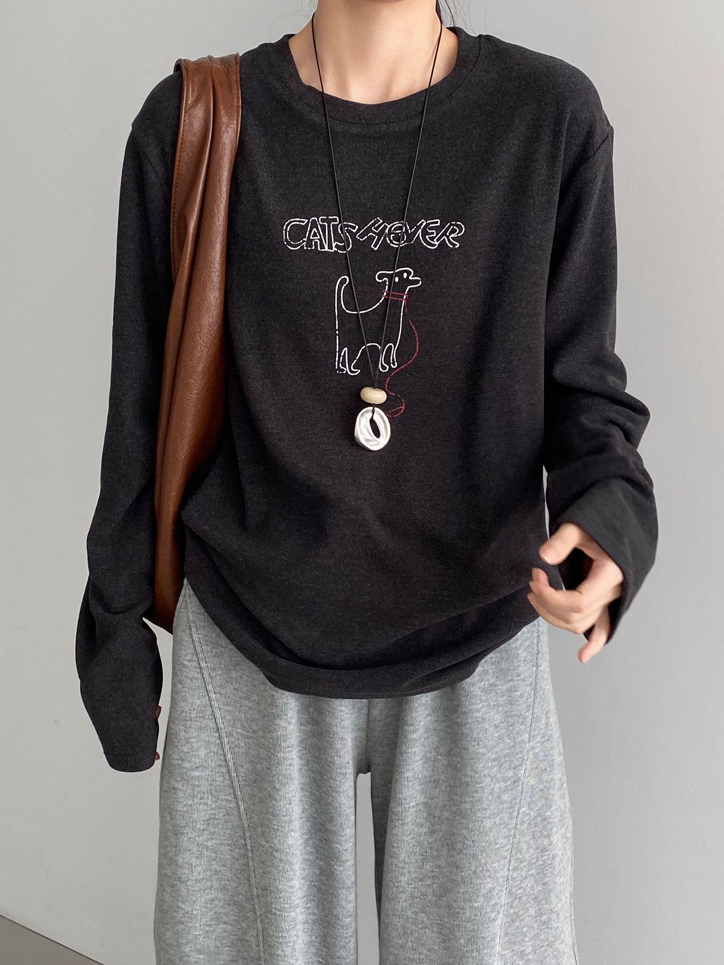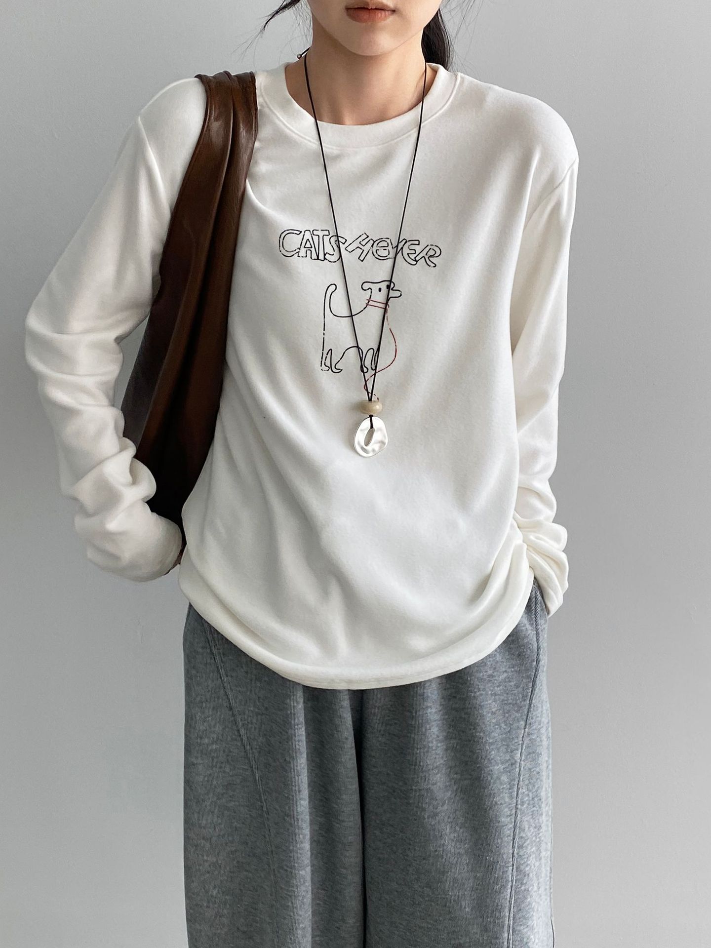 한청 감령 캐릭터 강아지 퍼머 기모 티셔츠 여성 라운드 프린팅은 긴팔 이너로 코디하기 좋습니다