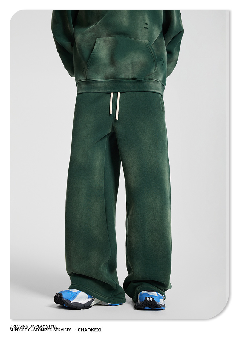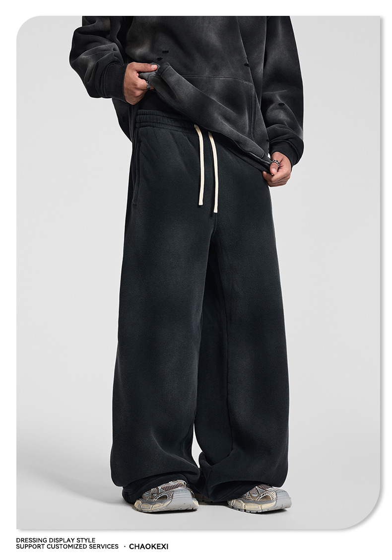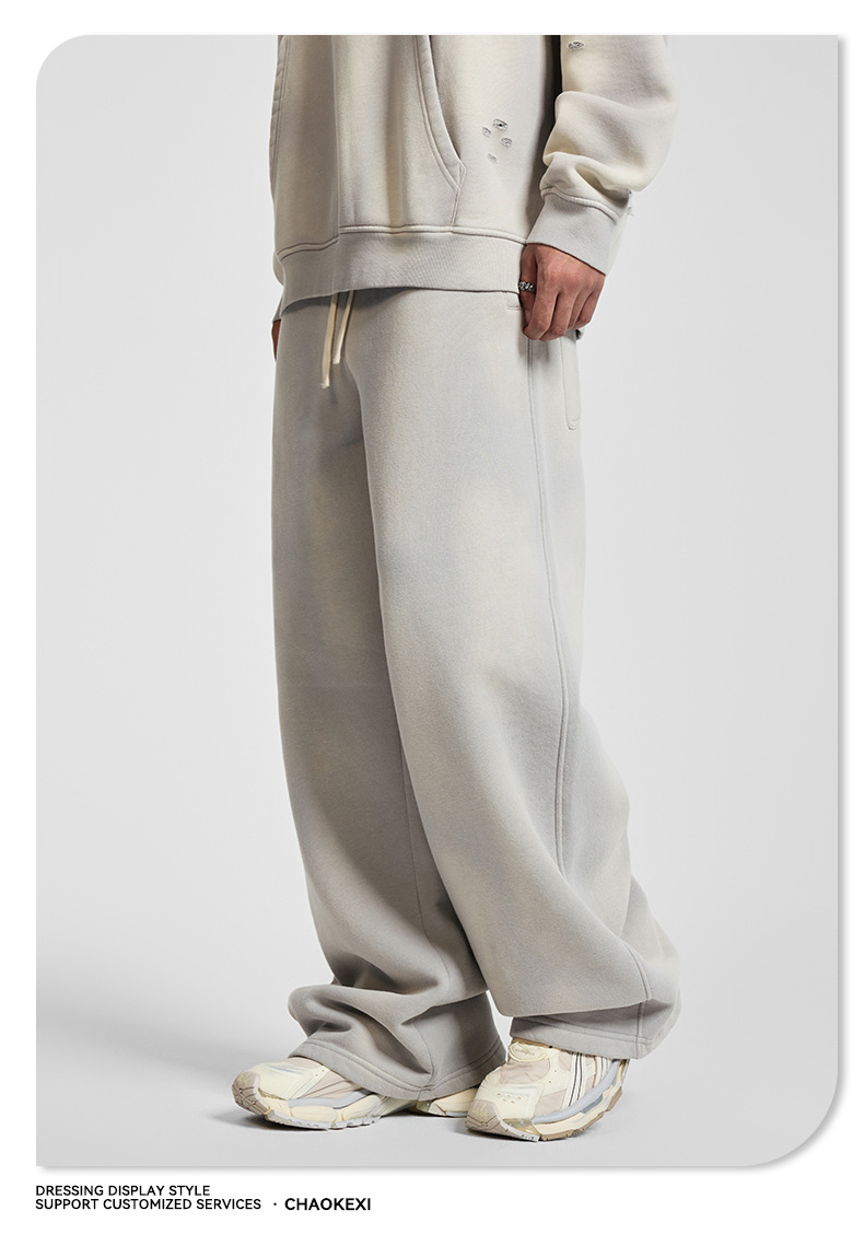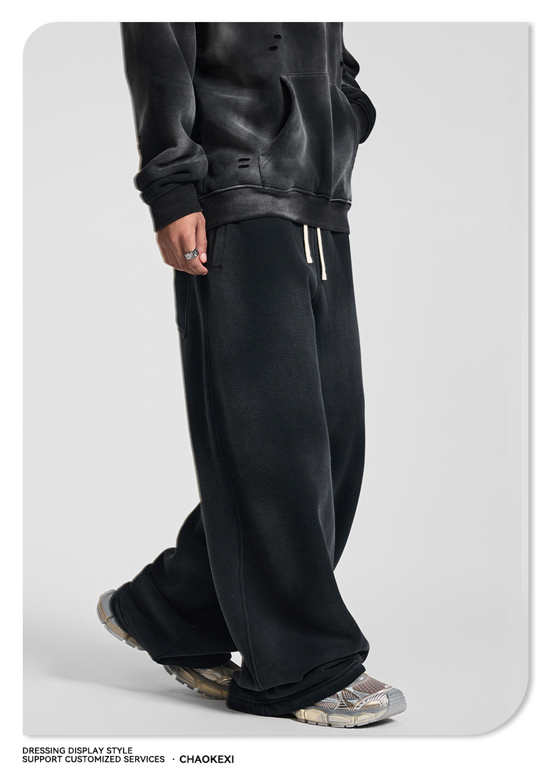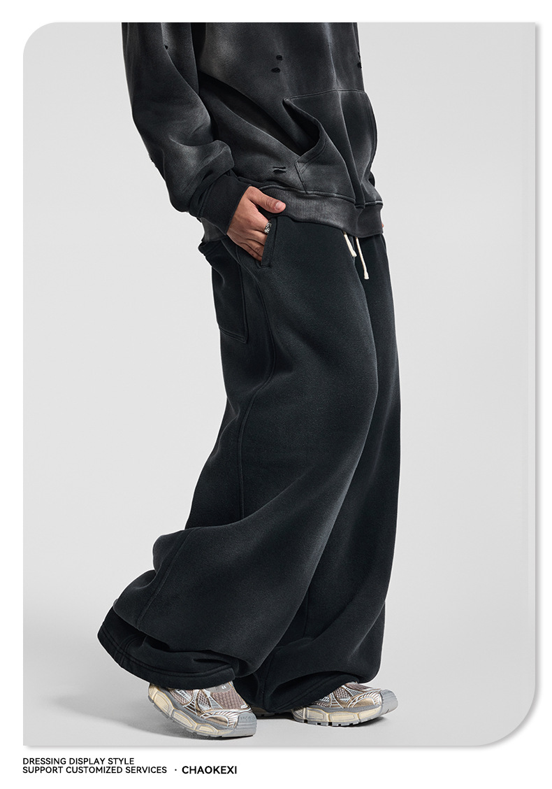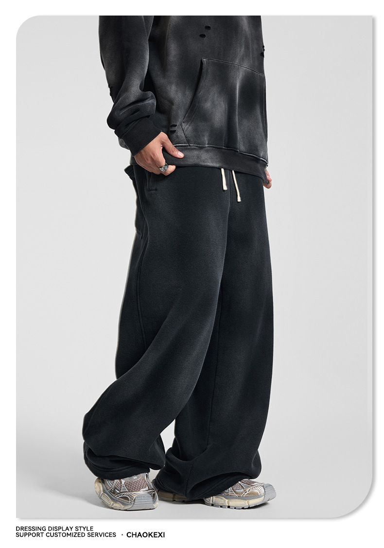 秋冬 新款 男装 加绒 宽松 破洞 男女 卫裤 美式 潮牌 阔腿