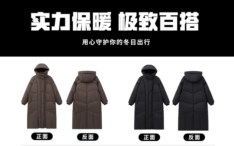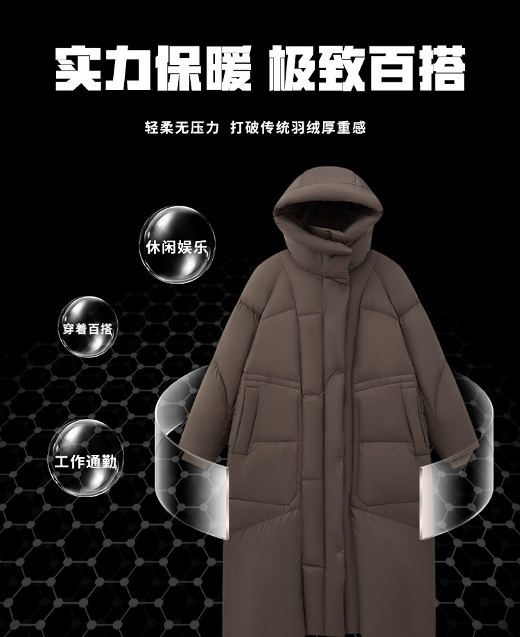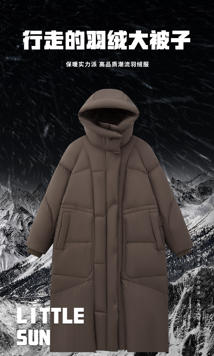 롱 기장의 도톰한 패딩으로 방한 여성 하이퍼 90 화이트 오리털 후드 무릎 위로 올라오는 겨울 여성 아우터입니다