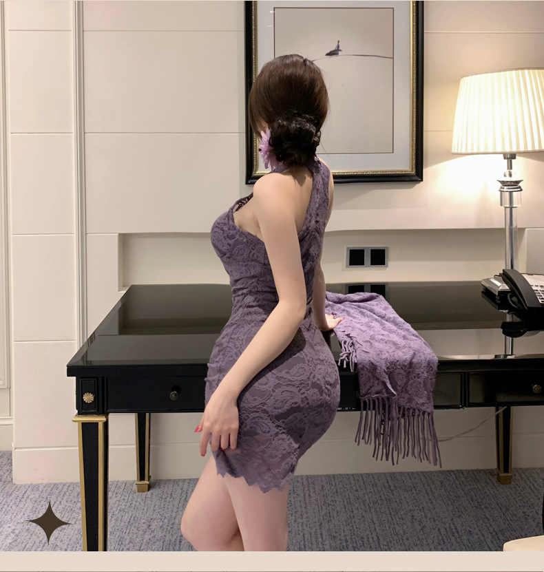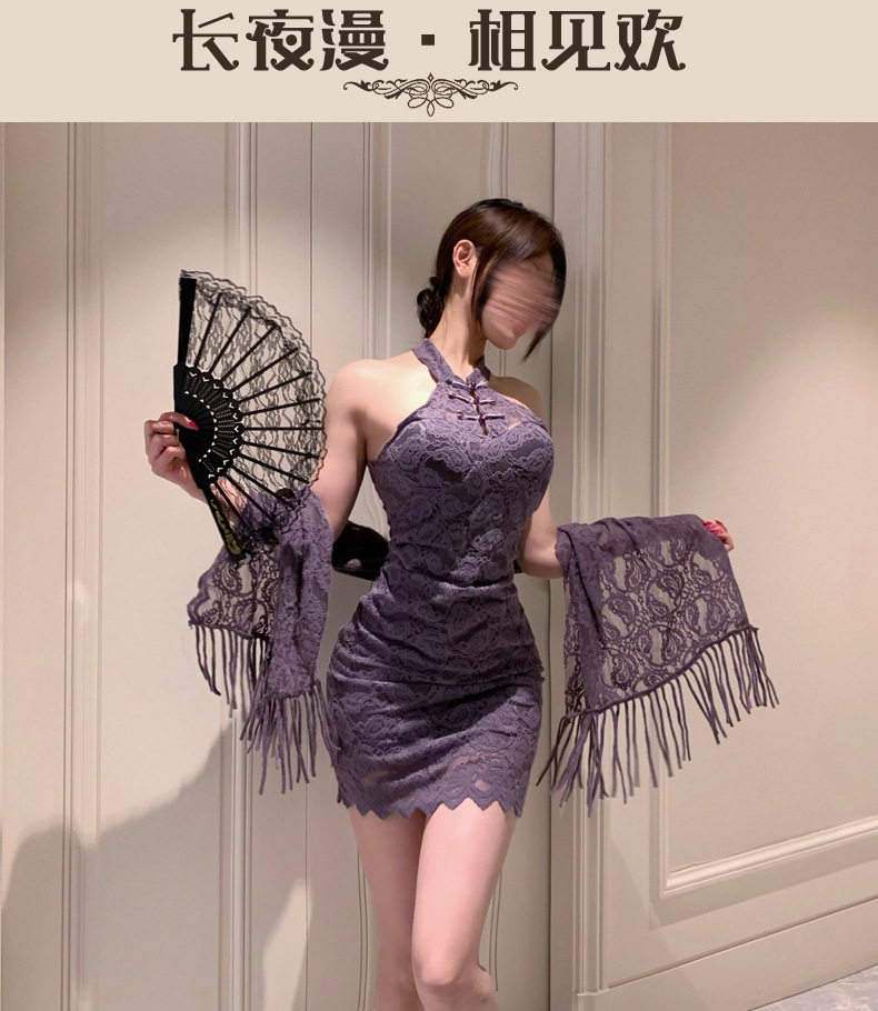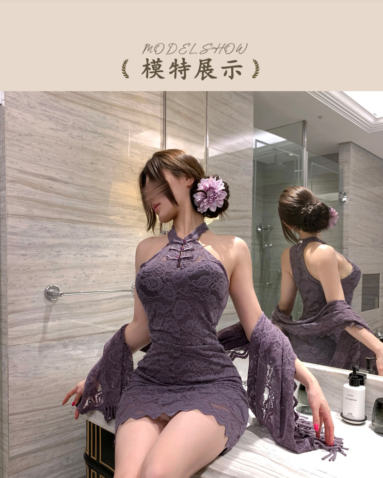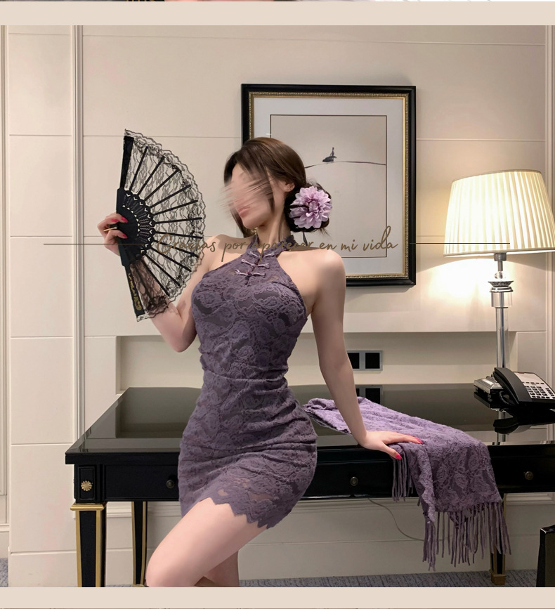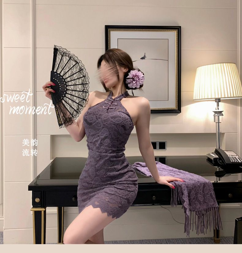 섹시하고 새로운 중국식 단추 모양의 레이스 차이나 치파오 순정풍 핫걸 자주색 칼라 란제리