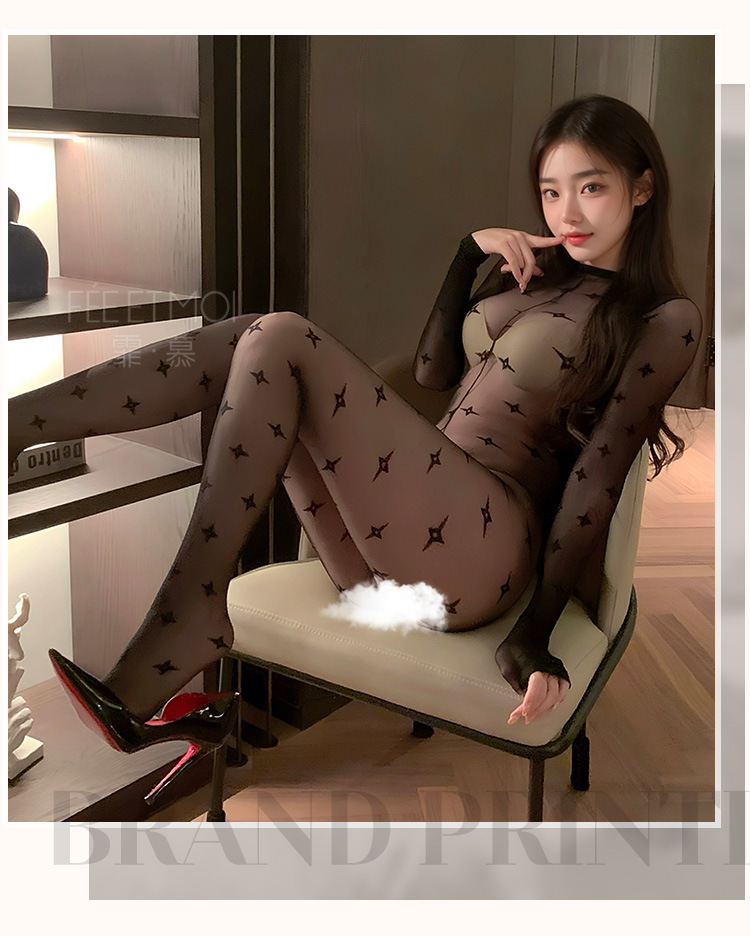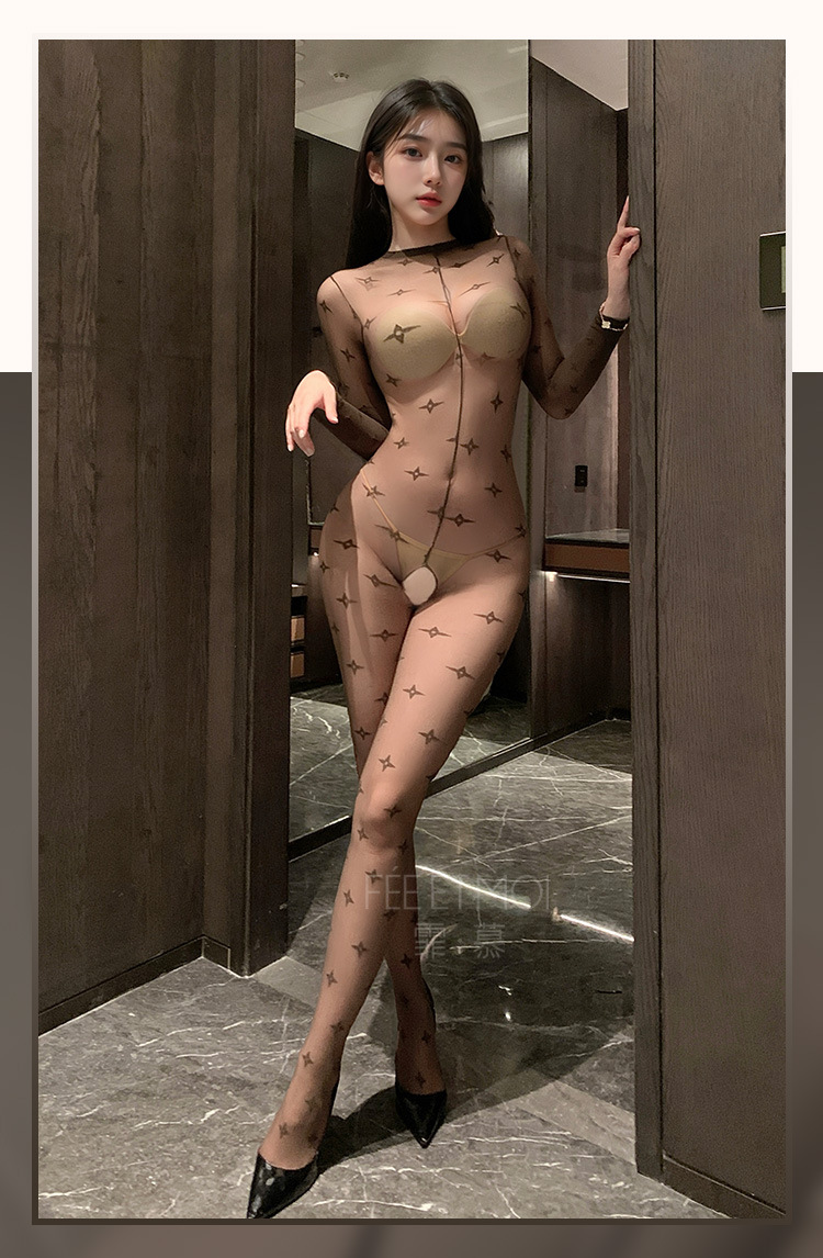 망홍 스타일에 슬림한 시스루 밑단오픈 자카드 원피스 스타킹으로 블랙 실크를 벗지 않고 섹시한 속옷을 매치했다