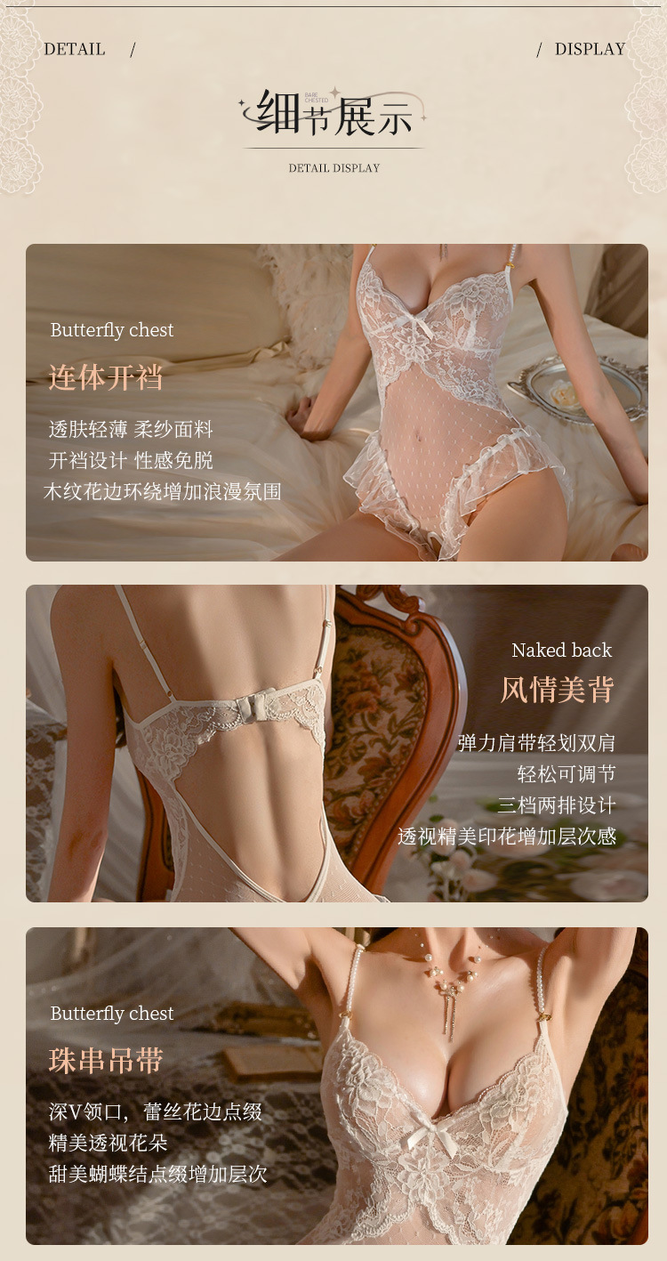 섹시 란제리 프렌치 레이스 진주 오픈 점프수트 섹시한 시스루 파자마